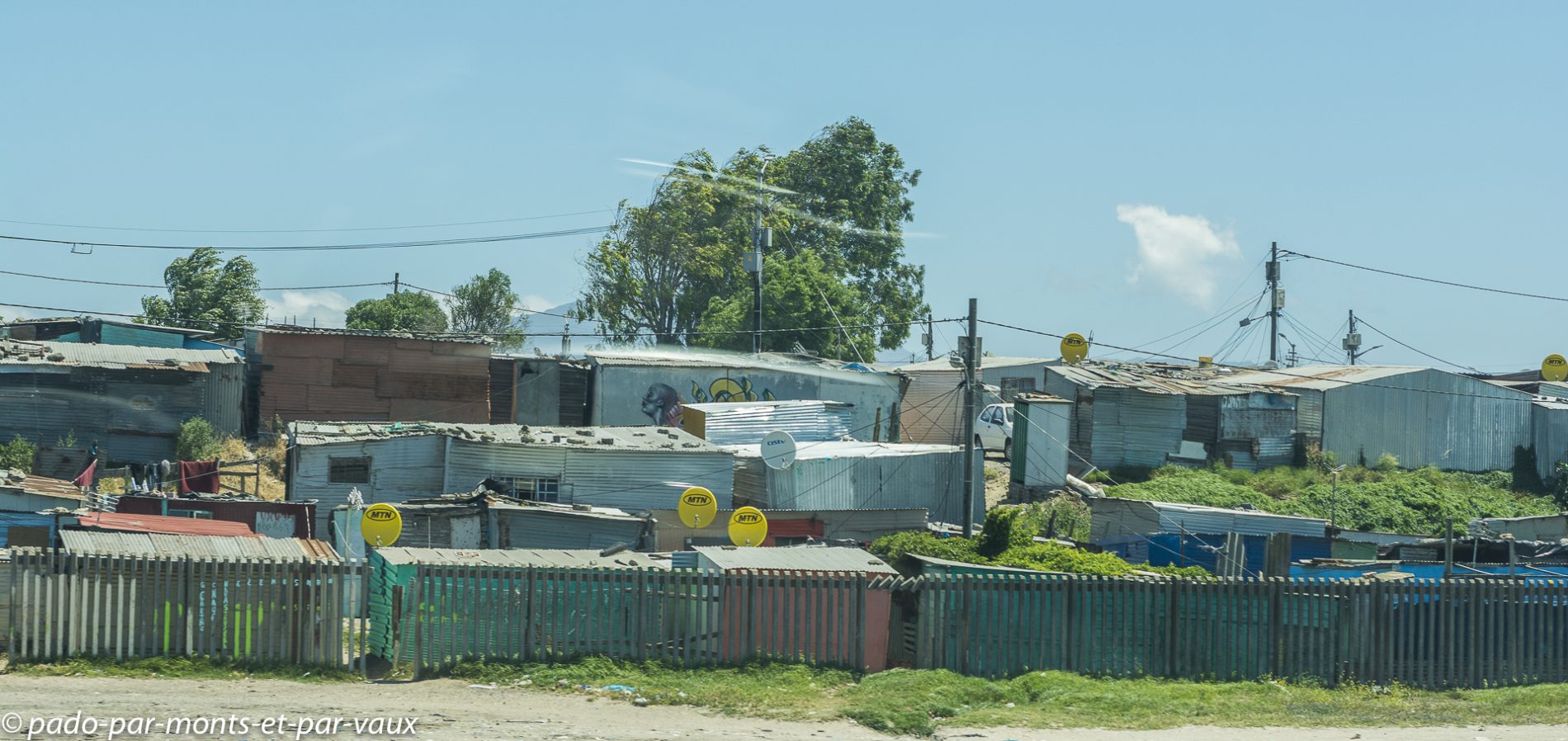 Nous prenons ensuite la route en direction de la ville du Cap qui sera notre dernière étape du voyage. Nous empruntons la N2 qui traverse plusieurs townships, impressionnants amas compacts de bicoques en tôle ondulée surmontées d’antennes satellite.