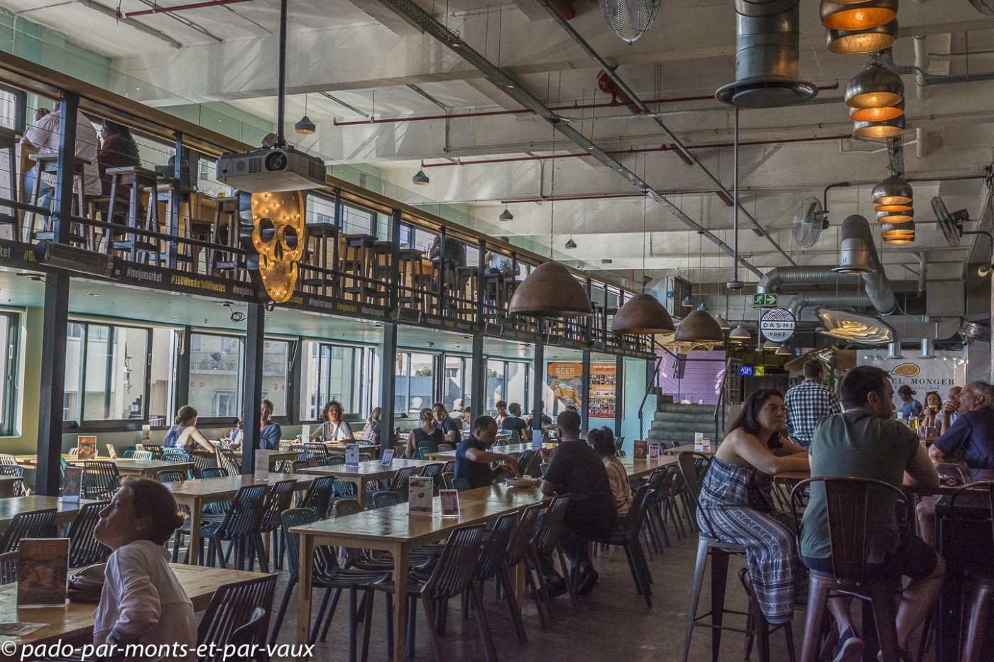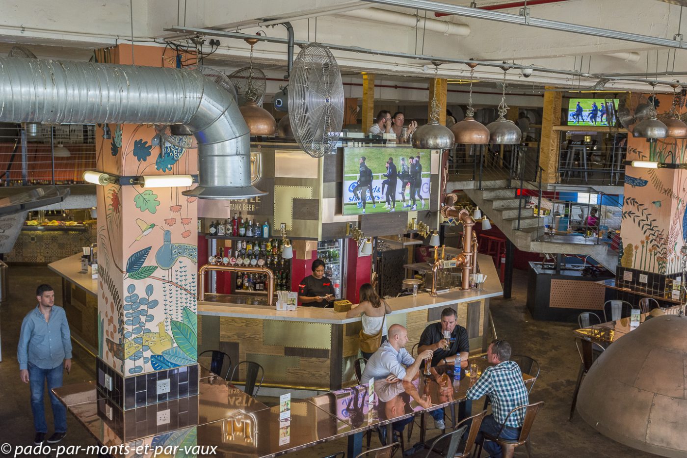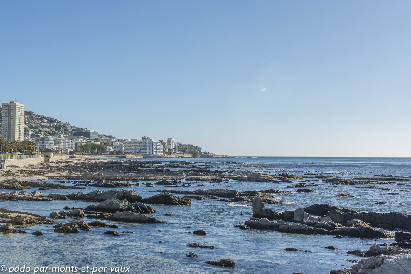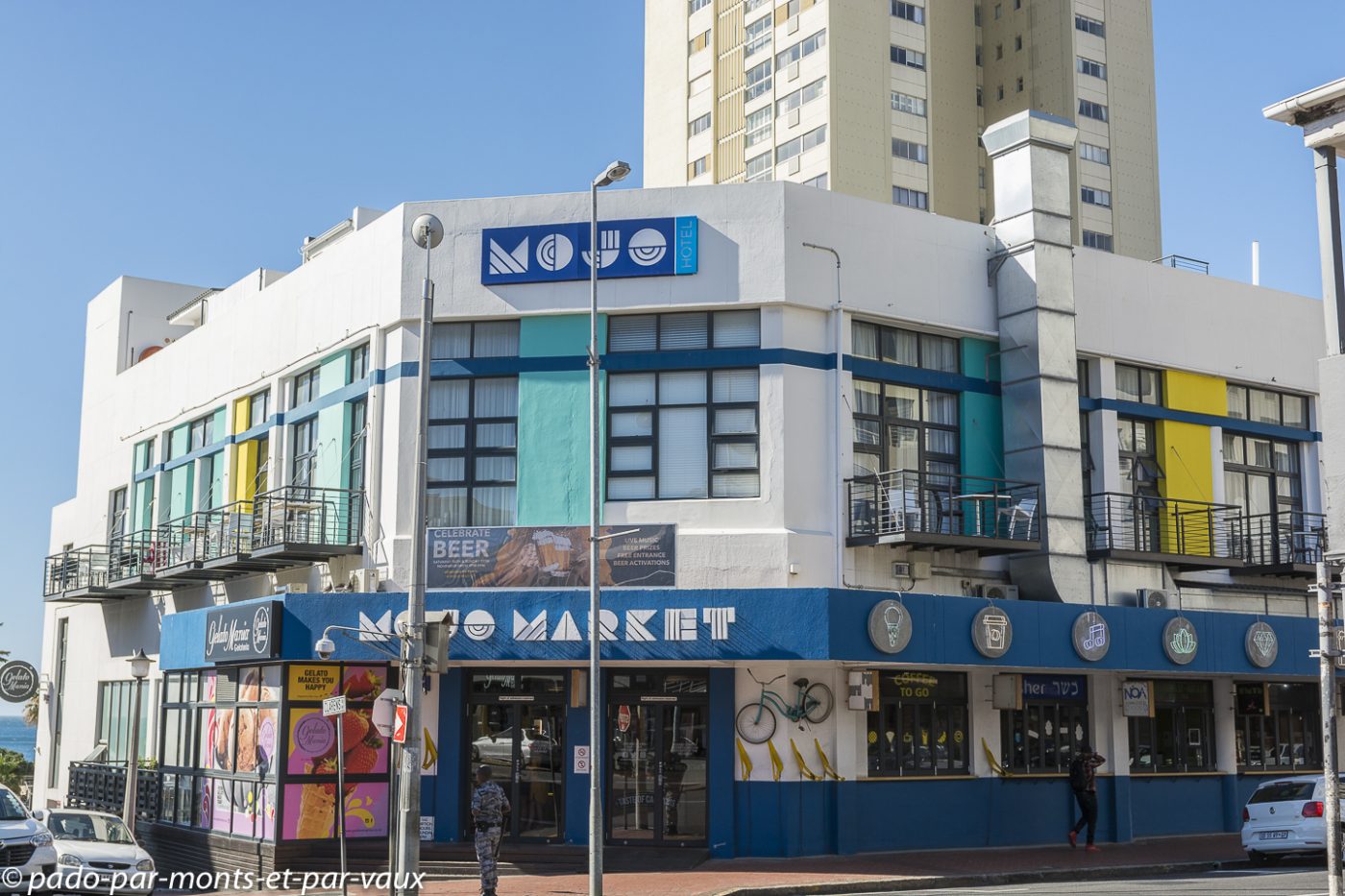 Promenade à pieds dans le quartier de Fresnaye et jusqu’à Sea Point au bord de mer. Jolie vue sur Lion’s head. La montagne de la table sort même un moment des nuages. Arrêt au Mojo market, une sorte de marché couvert avec des bistrots et des stands d’alimentation. Le décor industriel est assez original et nous nous asseyons pour boire une bière. Le vent est trop violent pour poursuivre en bord de mer (ce qui n’a pas l’air inhabituel ici vu la forme des arbres) et l’intérieur du quartier a finalement assez peu d’intérêt. Nous nous rapatrions donc vers l’hôtel.
