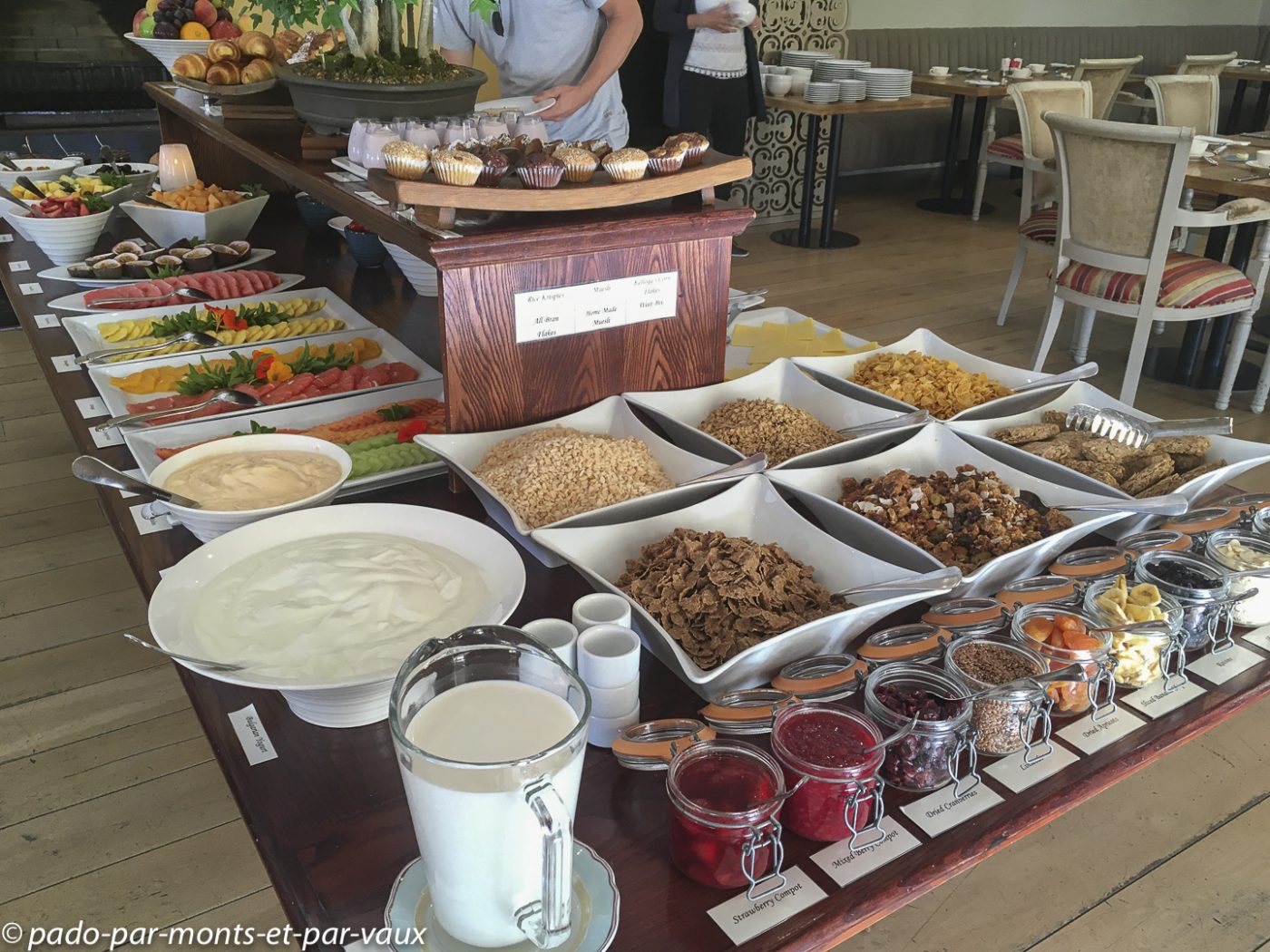 Hier soir nous avons longuement admiré le coucher de soleil depuis nos balcons. Ce matin il se lève derrière les montagnes qui se découpent en ombres chinoises sur les nuages et ce n’est pas mal non plus. Superbe petit déjeuner sur une terrasse protégée avec vue sur le lac et les montagnes. Le buffet est magnifique et tout est excellent, des viennoiseries aux fruits en passant par les œufs Bénédicte et les œufs brouillés au saumon (notre petit déjeuner est bien meilleur que notre repas du soir).