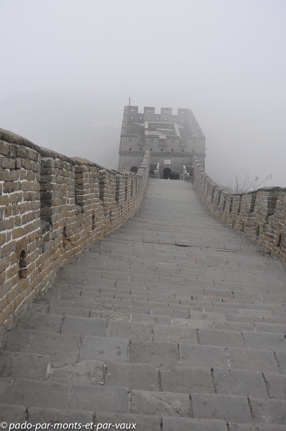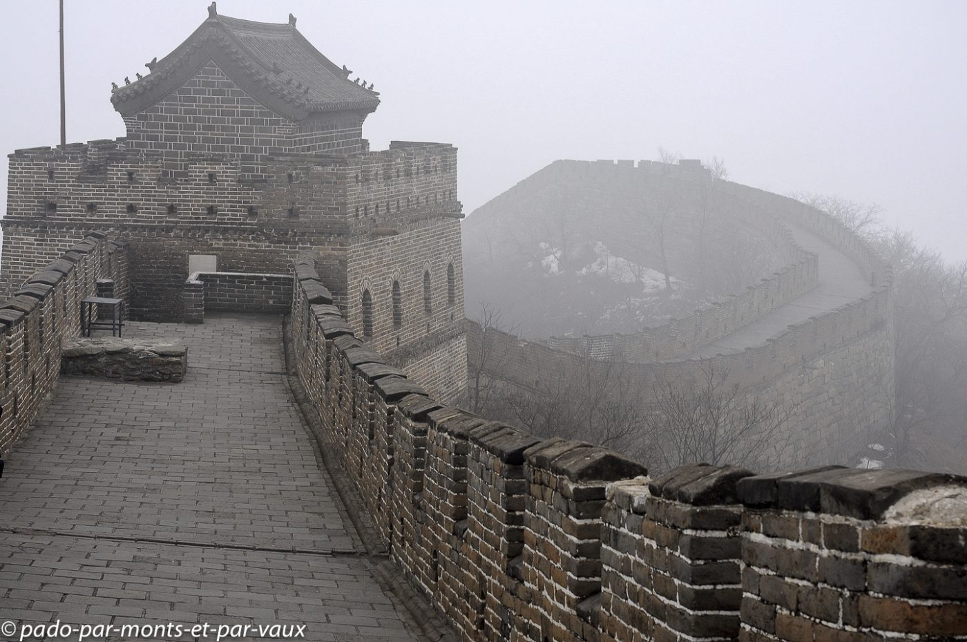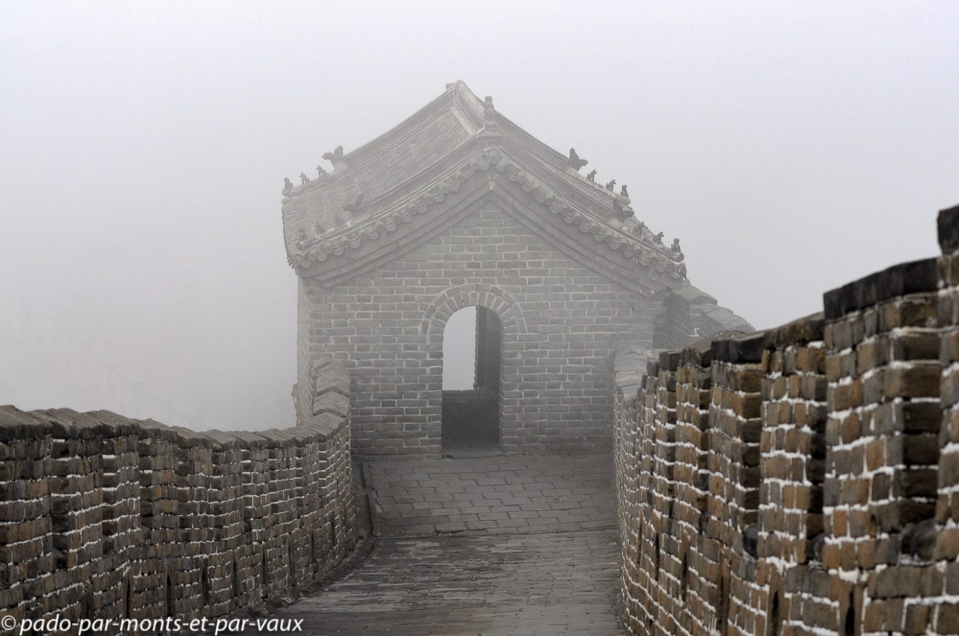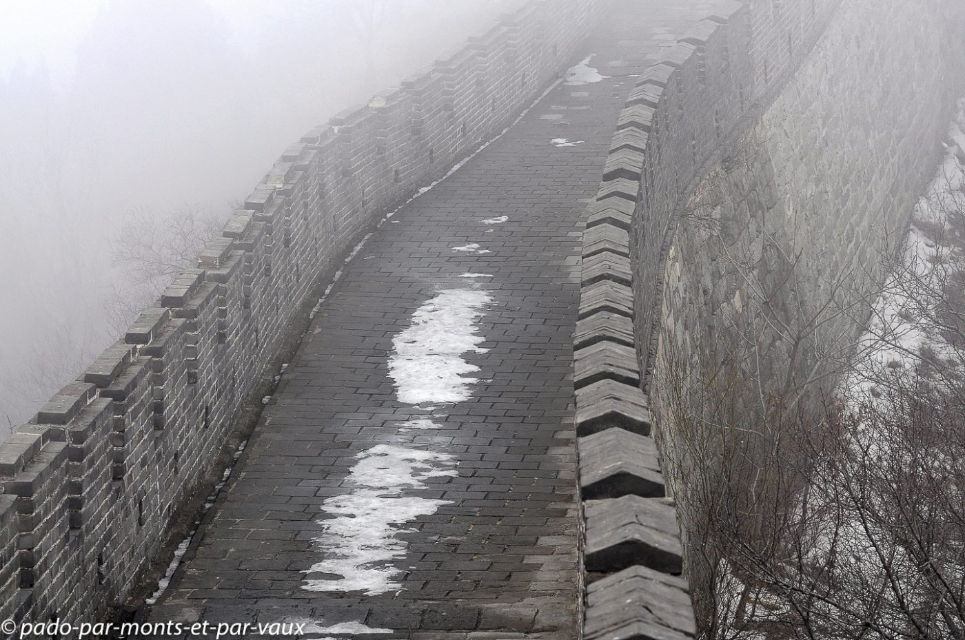 Un peu plus d’une heure de route pour rejoindre la portion de la grande Muraille que nous devons visiter à Mutianyu (90 kms de Pékin). Traversée de villages pauvres, certains vraiment miteux. Le sol est enneigé, les étangs gelés et le brouillard s’épaissit… La muraille est malheureusement à peine visible. Nous montons en téléphérique puis promenade au sommet. L’aspect est assez mystérieux avec le brouillard, mais malheureusement il n’y a aucune perspective. Nous parcourons quelques centaines de mètres, seuls, dans la brume en compagnie de quelques oiseaux grassouillets et d’écureuils. La pente est forte avec par endroits des escaliers raides au niveau des tours.