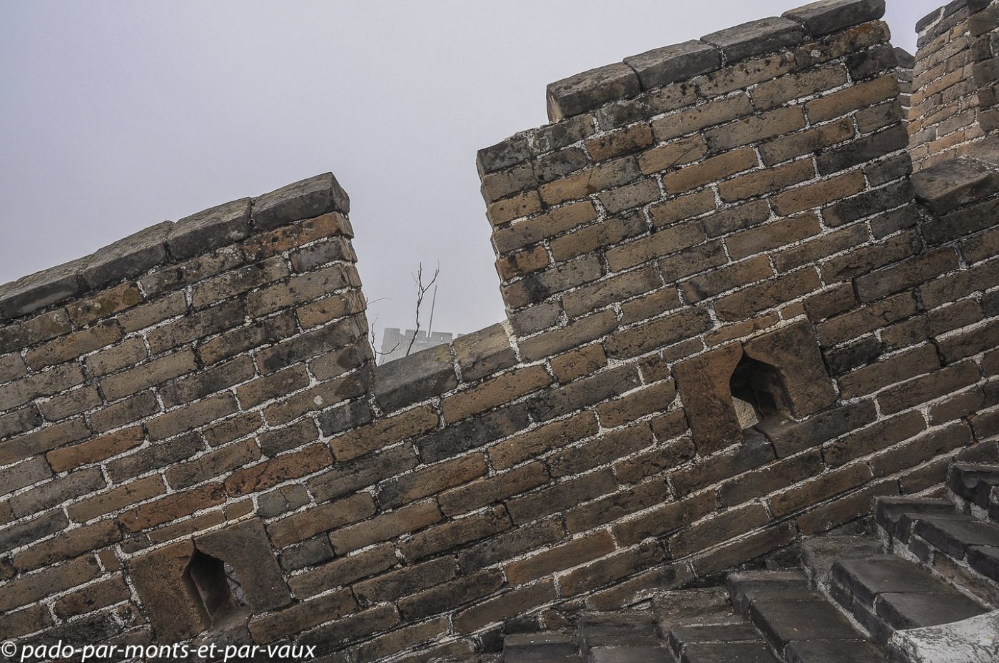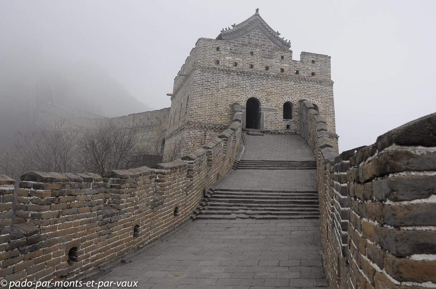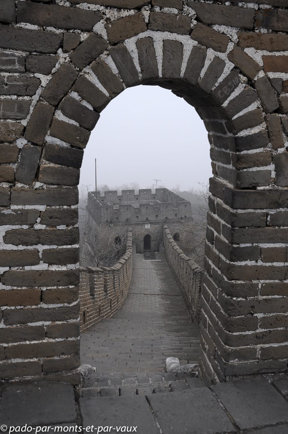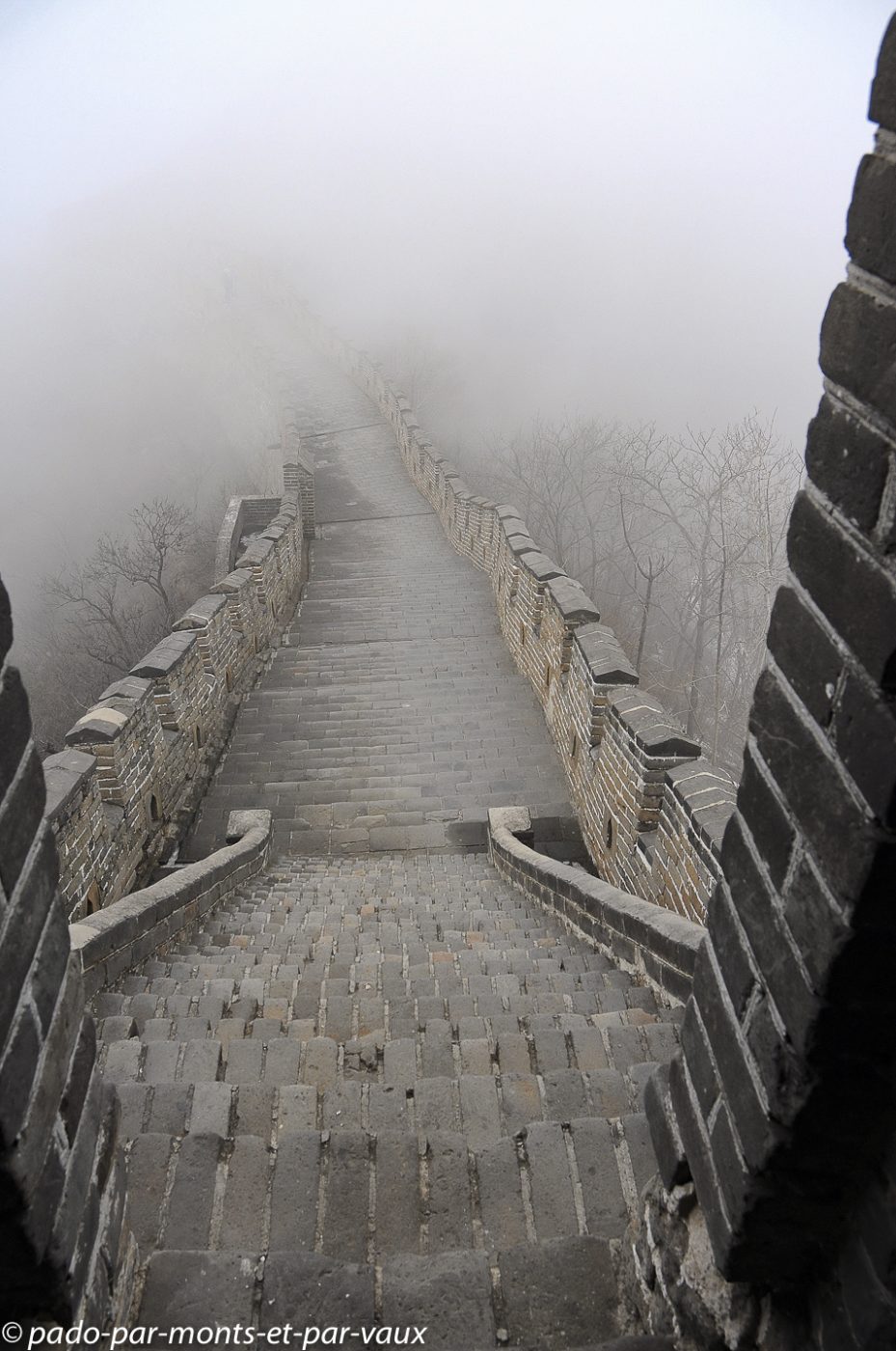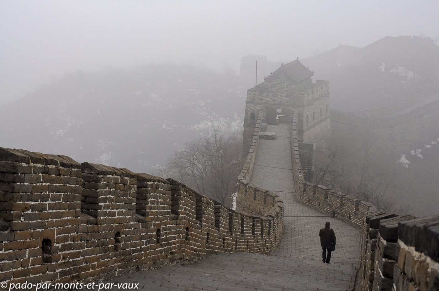 Un peu plus d’une heure de route pour rejoindre la portion de la grande Muraille que nous devons visiter à Mutianyu (90 kms de Pékin). Traversée de villages pauvres, certains vraiment miteux. Le sol est enneigé, les étangs gelés et le brouillard s’épaissit… La muraille est malheureusement à peine visible. Nous montons en téléphérique puis promenade au sommet. L’aspect est assez mystérieux avec le brouillard, mais malheureusement il n’y a aucune perspective. Nous parcourons quelques centaines de mètres, seuls, dans la brume en compagnie de quelques oiseaux grassouillets et d’écureuils. La pente est forte avec par endroits des escaliers raides au niveau des tours.