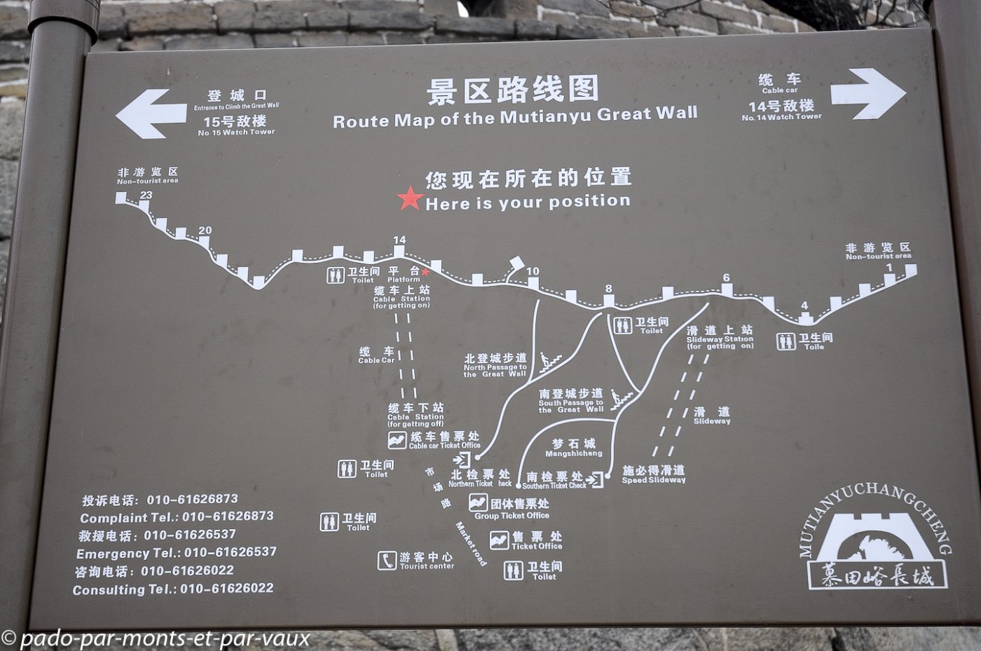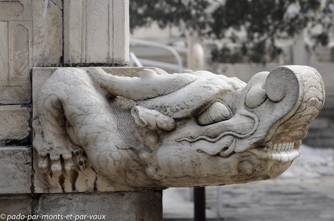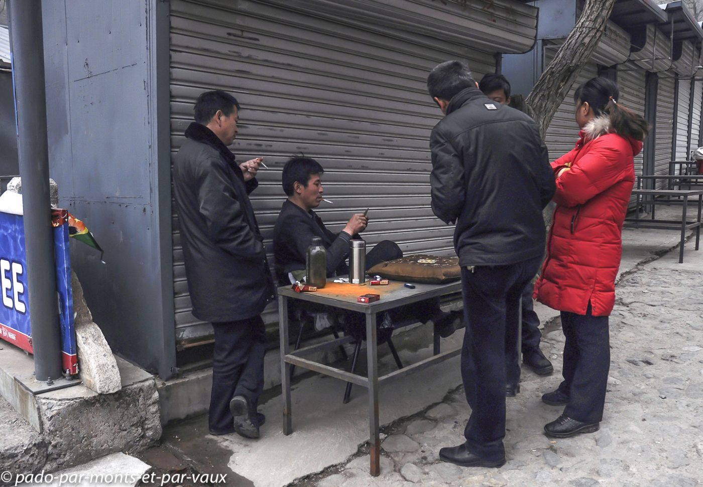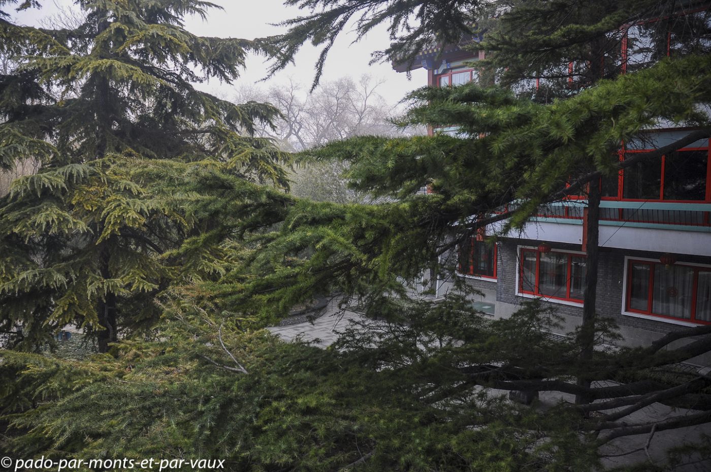 Un peu plus d’une heure de route pour rejoindre la portion de la grande Muraille que nous devons visiter à Mutianyu (90 kms de Pékin). Traversée de villages pauvres, certains vraiment miteux. Le sol est enneigé, les étangs gelés et le brouillard s’épaissit… La muraille est malheureusement à peine visible. Nous montons en téléphérique puis promenade au sommet. L’aspect est assez mystérieux avec le brouillard, mais malheureusement il n’y a aucune perspective. Nous parcourons quelques centaines de mètres, seuls, dans la brume en compagnie de quelques oiseaux grassouillets et d’écureuils. La pente est forte avec par endroits des escaliers raides au niveau des tours.