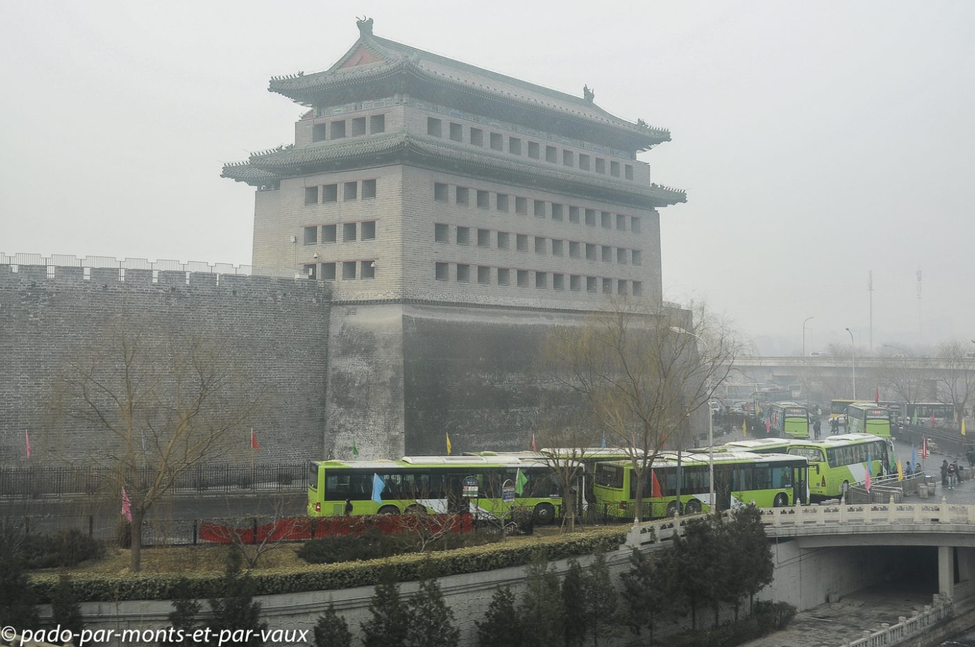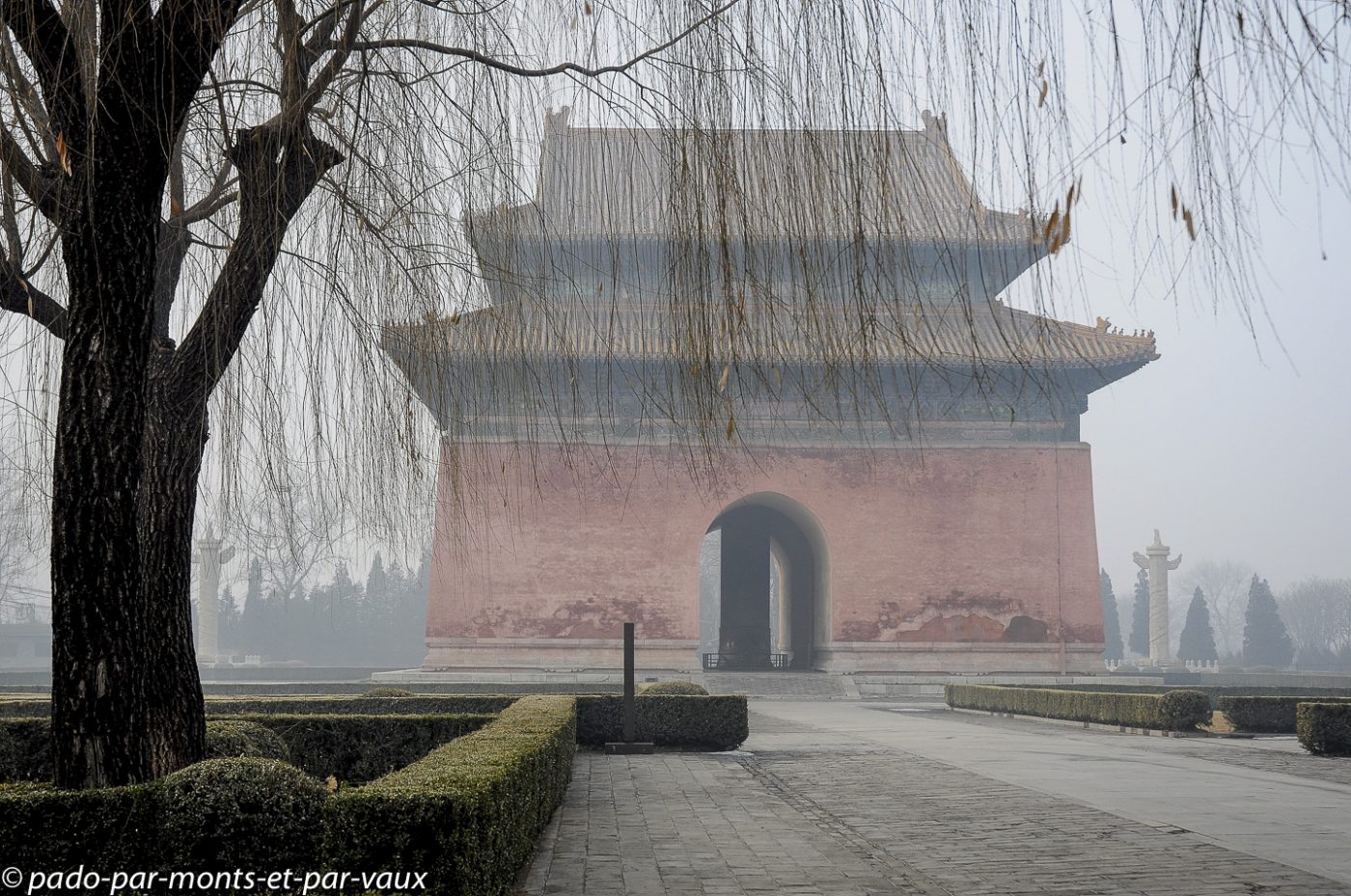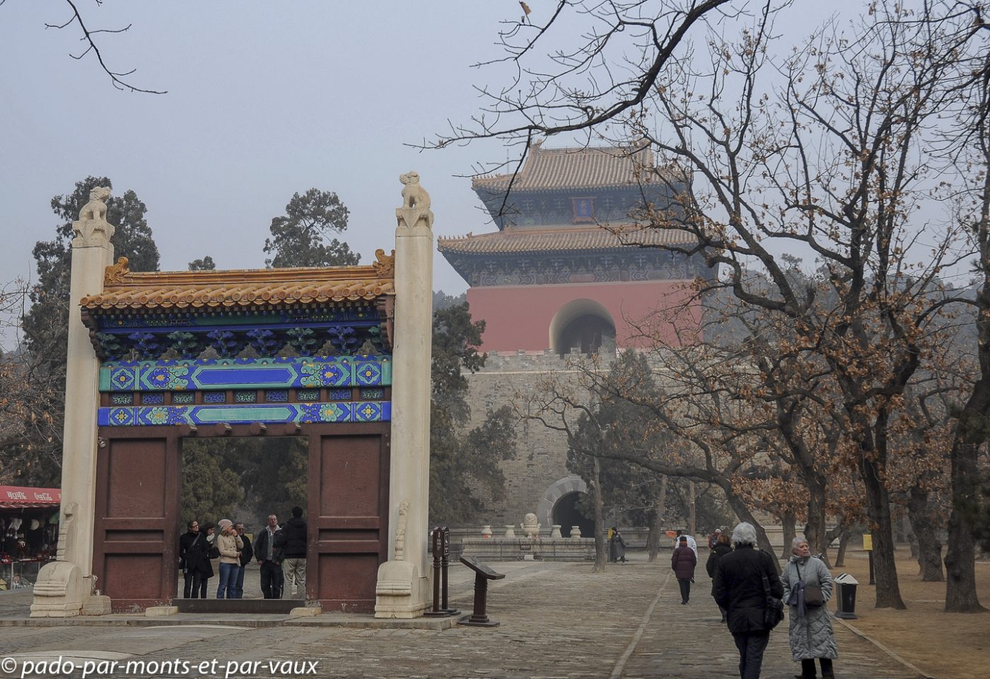 Nous levons le camp à 8 heures une fois notre petit groupe reconstitué (bon point : tout le monde est à l’heure) et nous empruntons, dans le même minibus que hier, une autoroute très encombrée par les citadins allant au travail (il y a quand même 15 millions d’habitants ici) qui nous fait sortir de la ville par le nord. Les tombeaux des Ming sont situés dans une vallée à une cinquantaine de kilomètres au nord-ouest de Pékin, à Shisanling dans la région de Changping.
