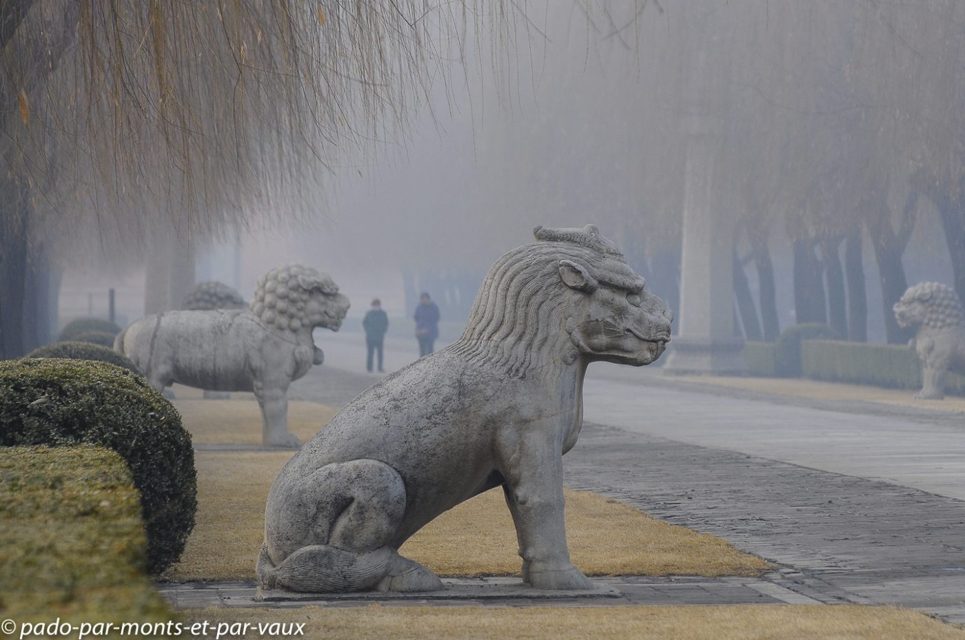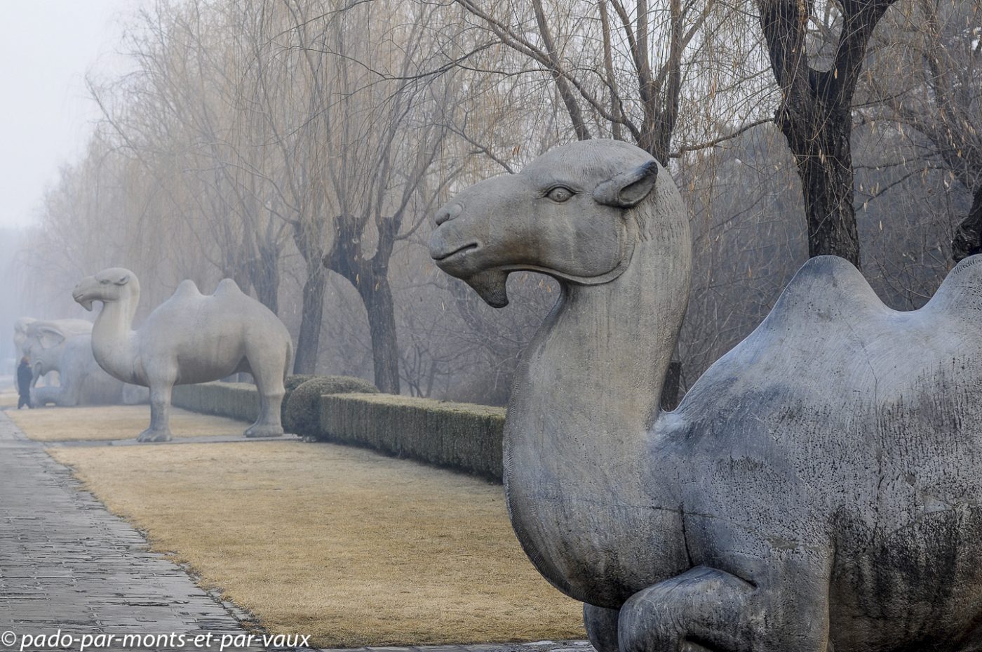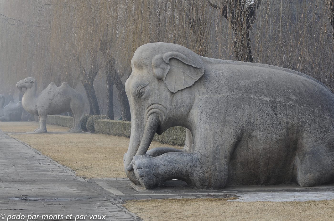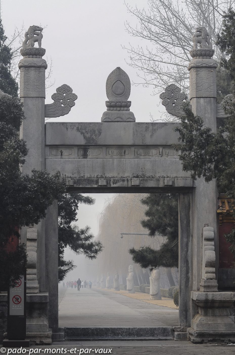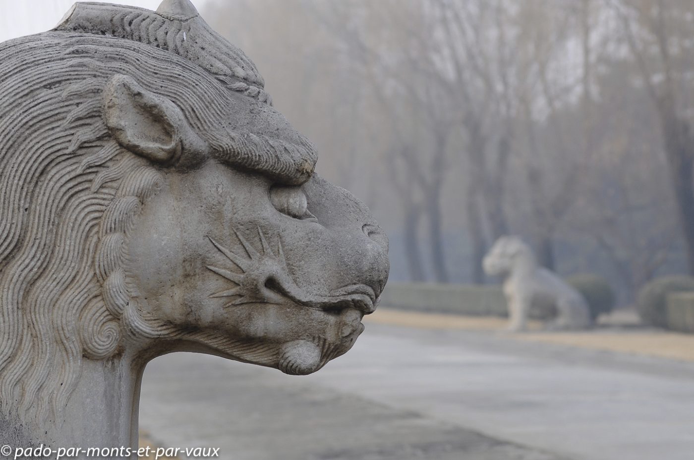 Le site est très vaste et nous commençons par la Voie des esprits, une allée imposante bordée par 24 statues de pierre : 6 paires d’animaux (lions, chameaux, éléphants, magnifiques chevaux et animaux fantastiques licornes et xiezhi, une sorte de lion avec des écailles) et 6 paires d’hommes (lettrés, administrateurs et soldats). Cette allée était empruntée par les cercueils des empereurs défunts sur le chemin de leur tombeau.