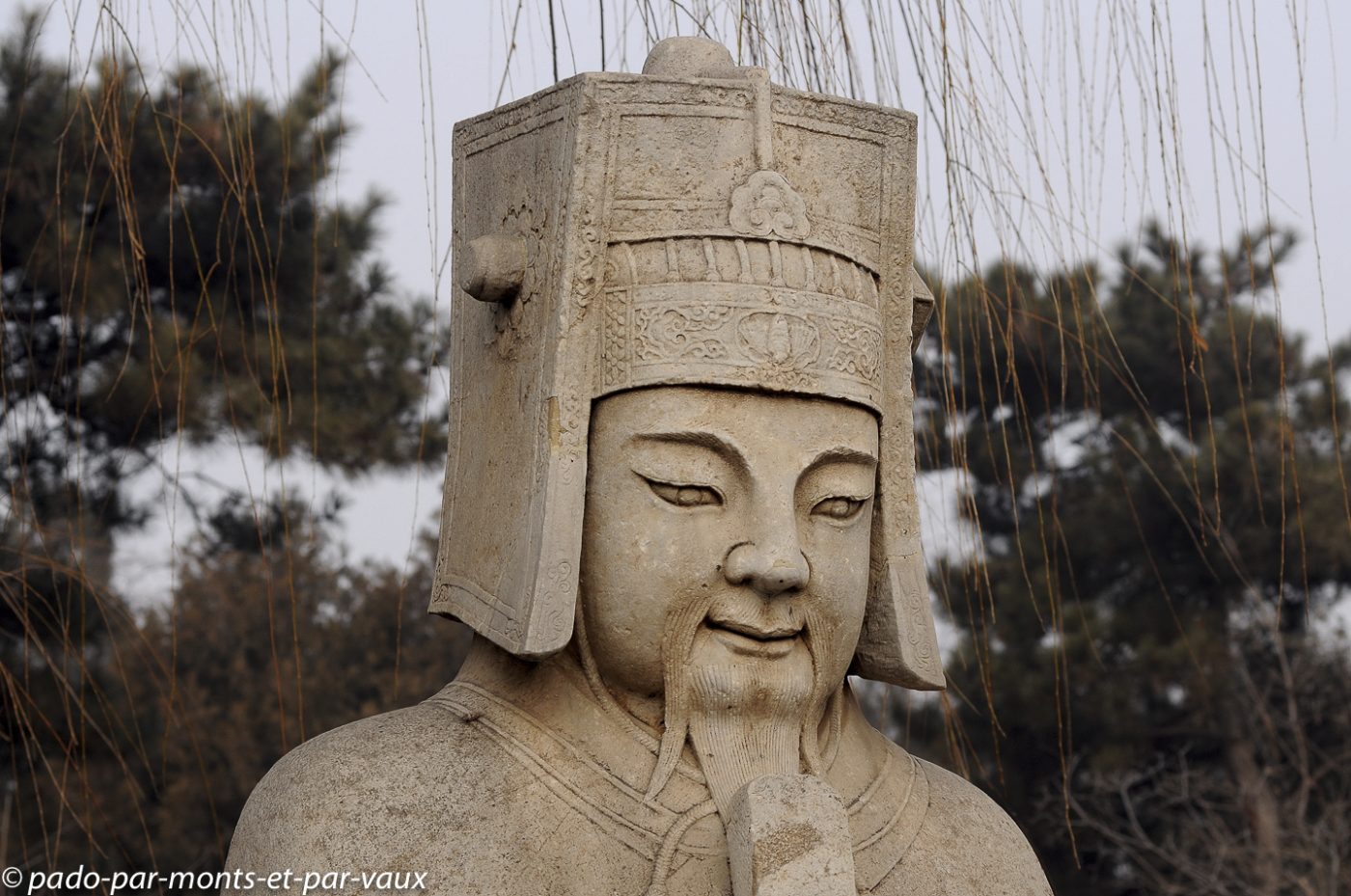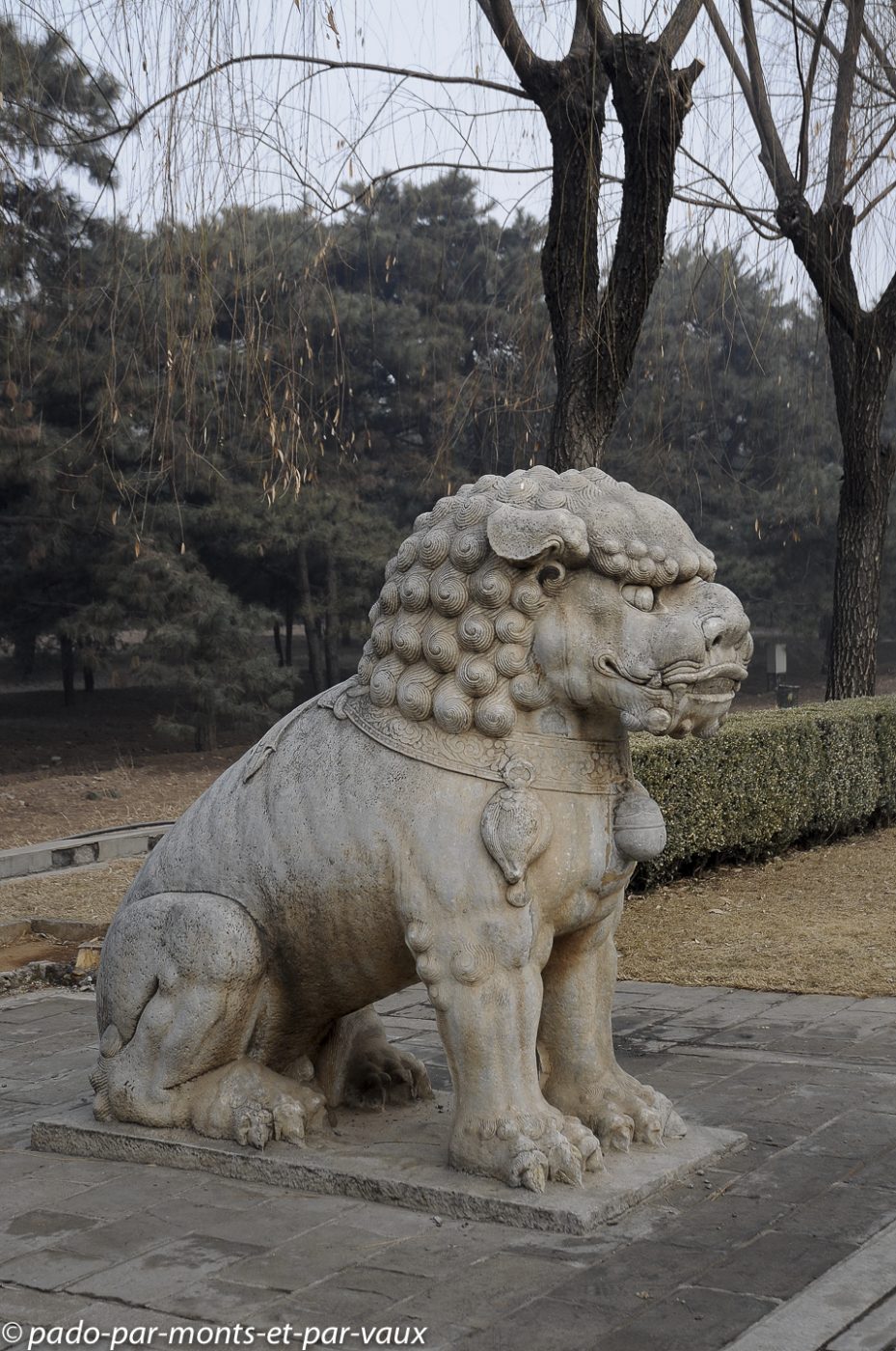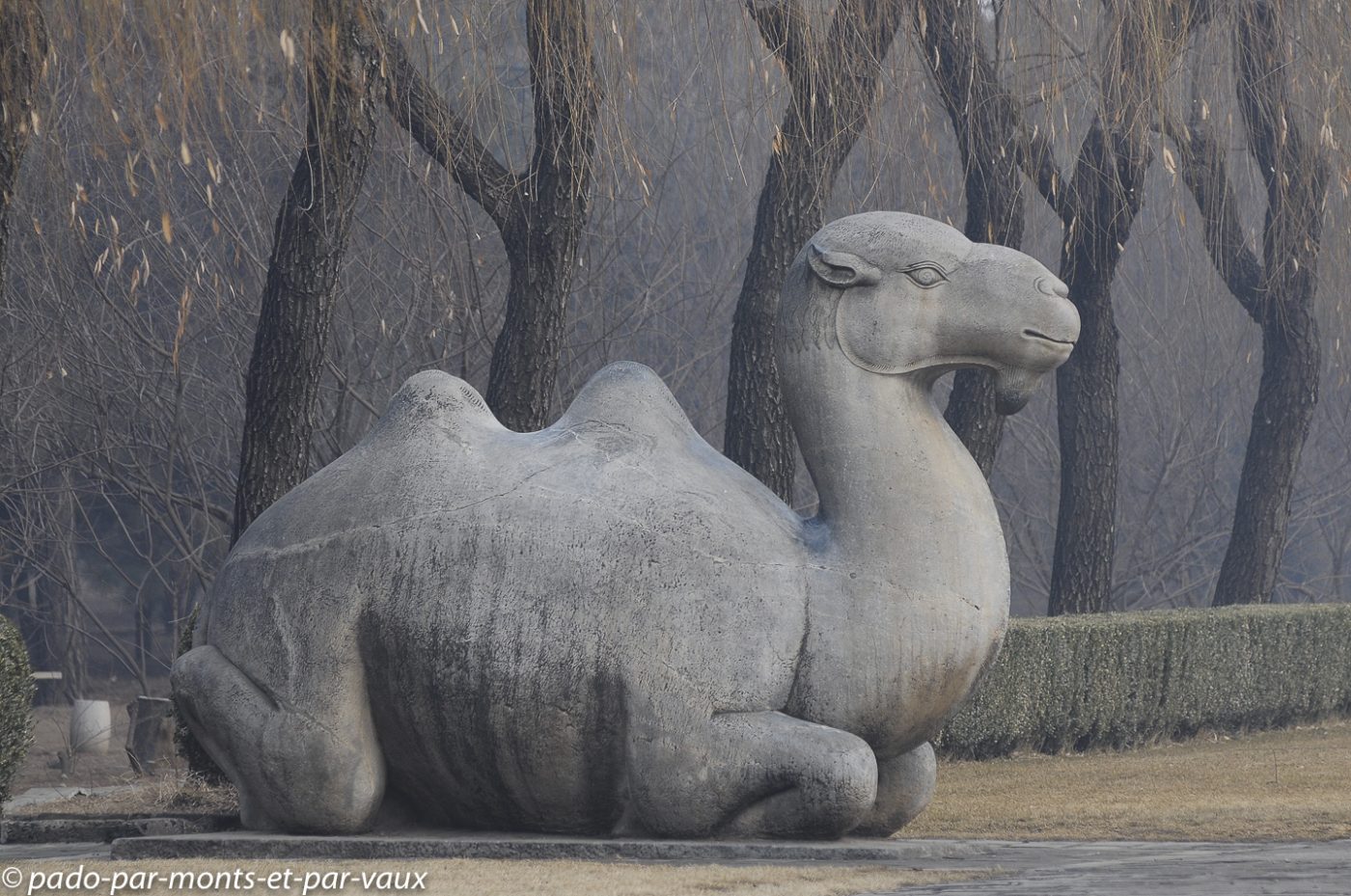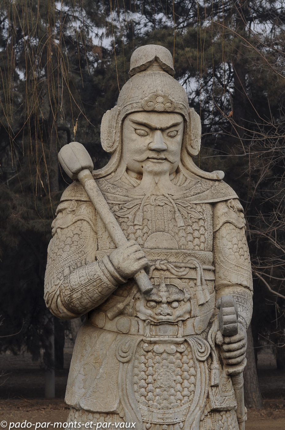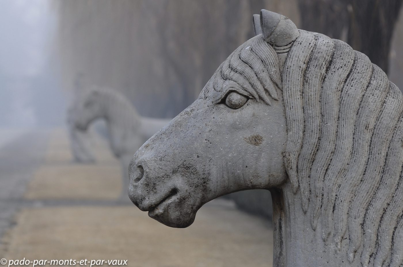 Le site est très vaste et nous commençons par la Voie des esprits, une allée imposante bordée par 24 statues de pierre : 6 paires d’animaux (lions, chameaux, éléphants, magnifiques chevaux et animaux fantastiques licornes et xiezhi, une sorte de lion avec des écailles) et 6 paires d’hommes (lettrés, administrateurs et soldats). Cette allée était empruntée par les cercueils des empereurs défunts sur le chemin de leur tombeau.