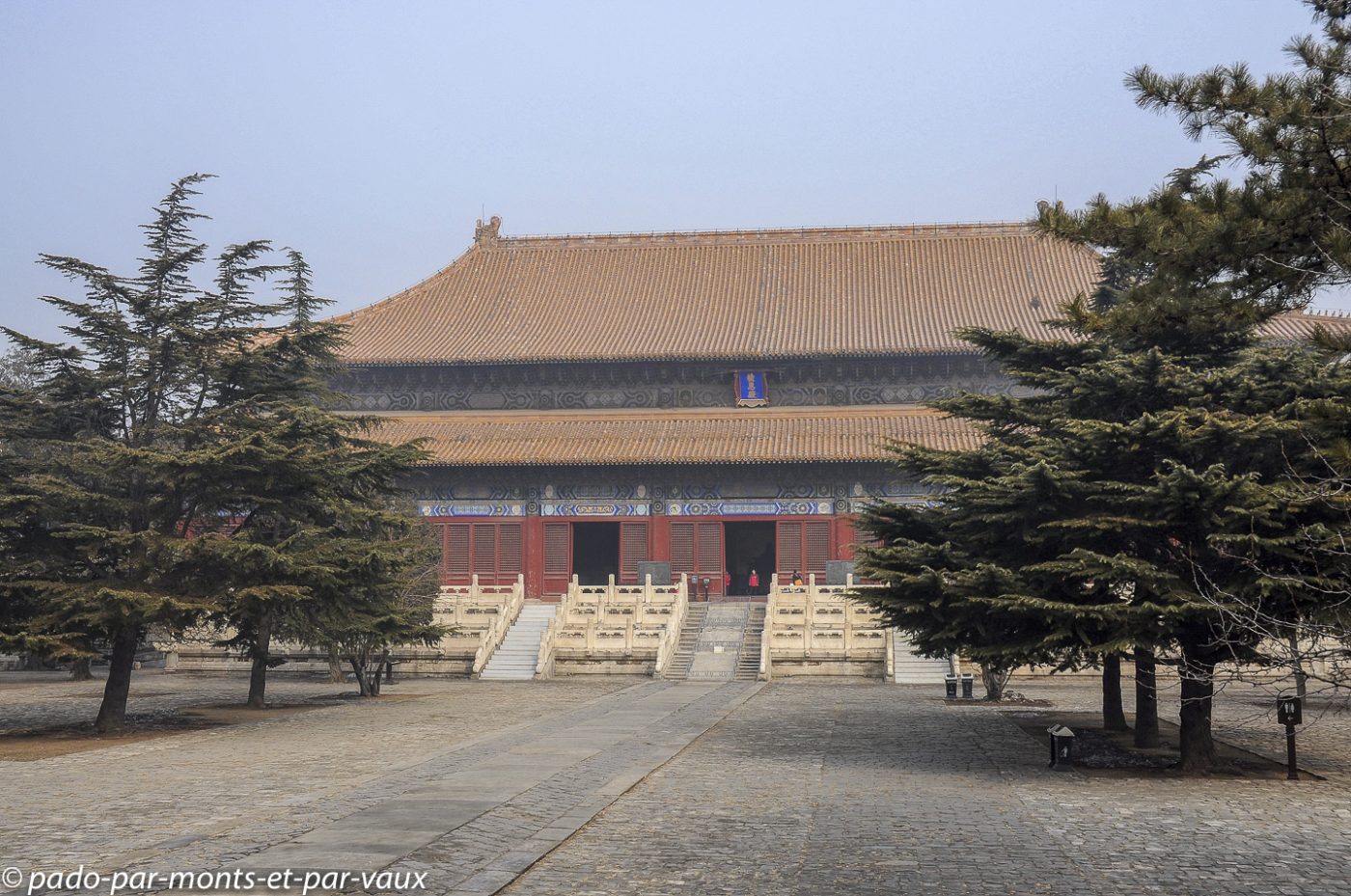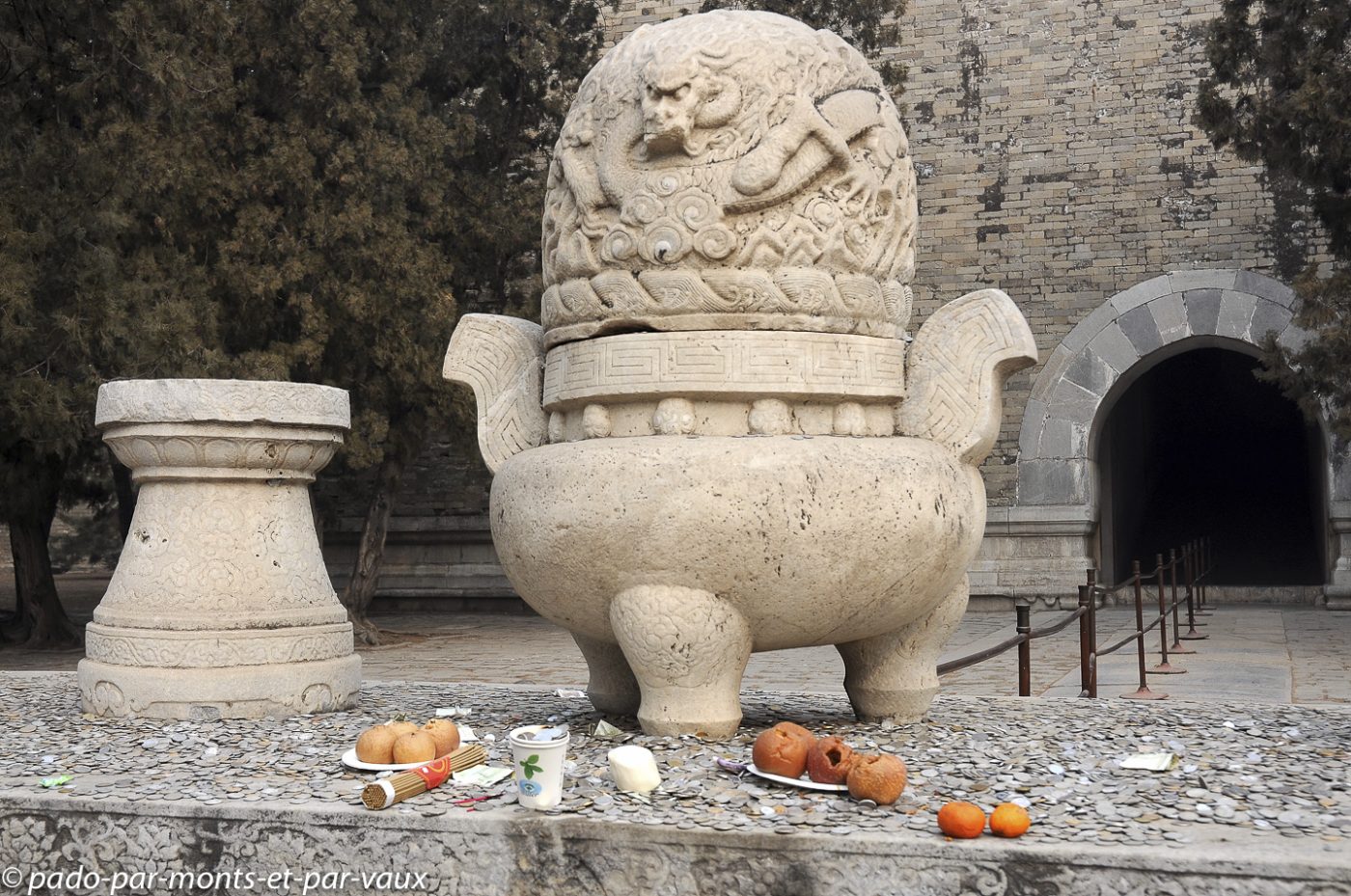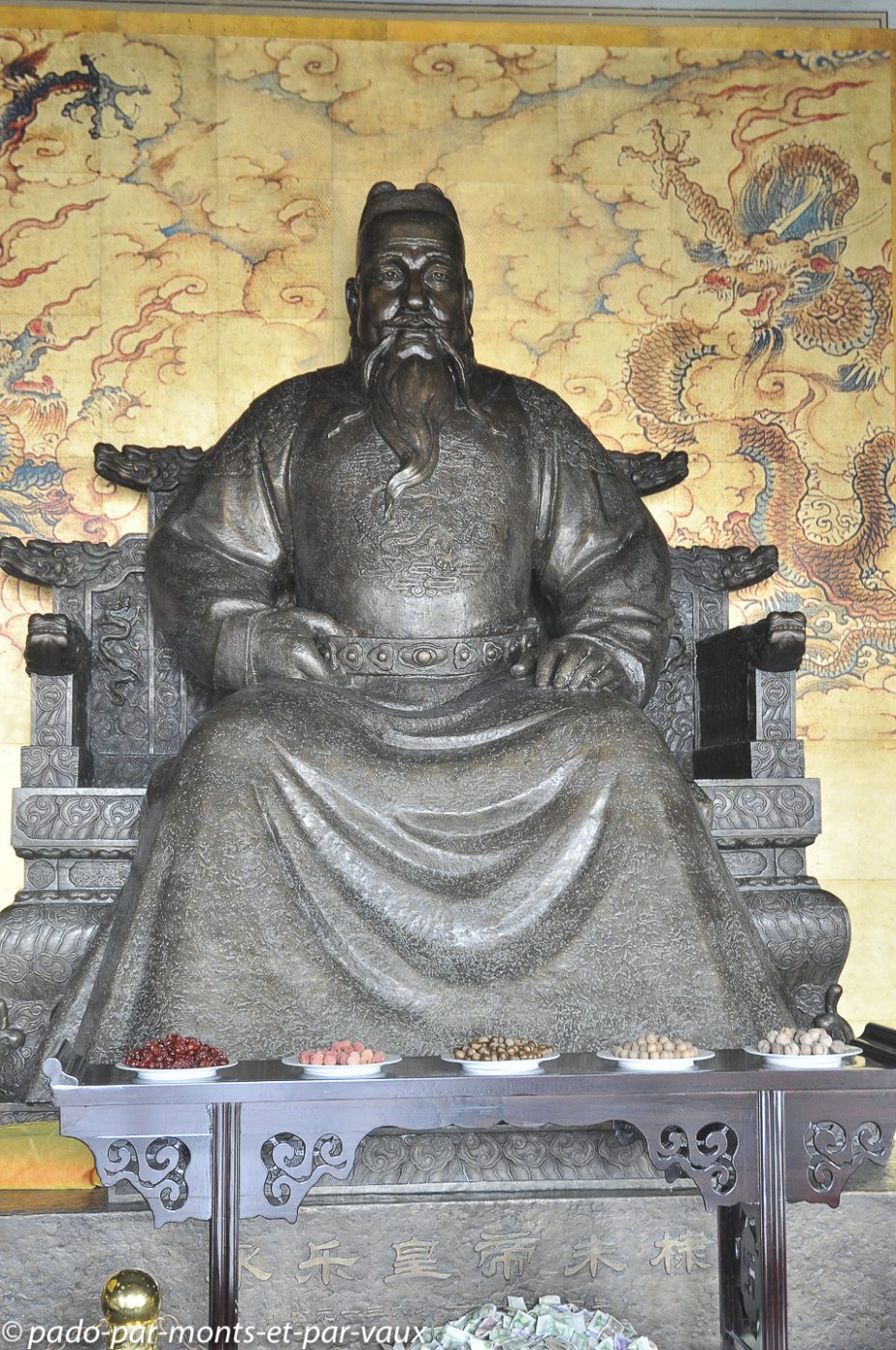 Nous reprenons le minibus pour gagner quelques kilomètres plus loin le tombeau Changling, tombeau de l’empereur Yongle mort en 1424. Treize des 16 empereurs de la dynastie Ming sont enterrés sur le site, mais seuls trois tombeaux se visitent. Celui de Yongle comporte trois bâtiments en surface et une tombe souterraine qui ne se visite pas. Jolis bâtiments colorés dont les toitures vernissées sont décorées de petits animaux en céramique.