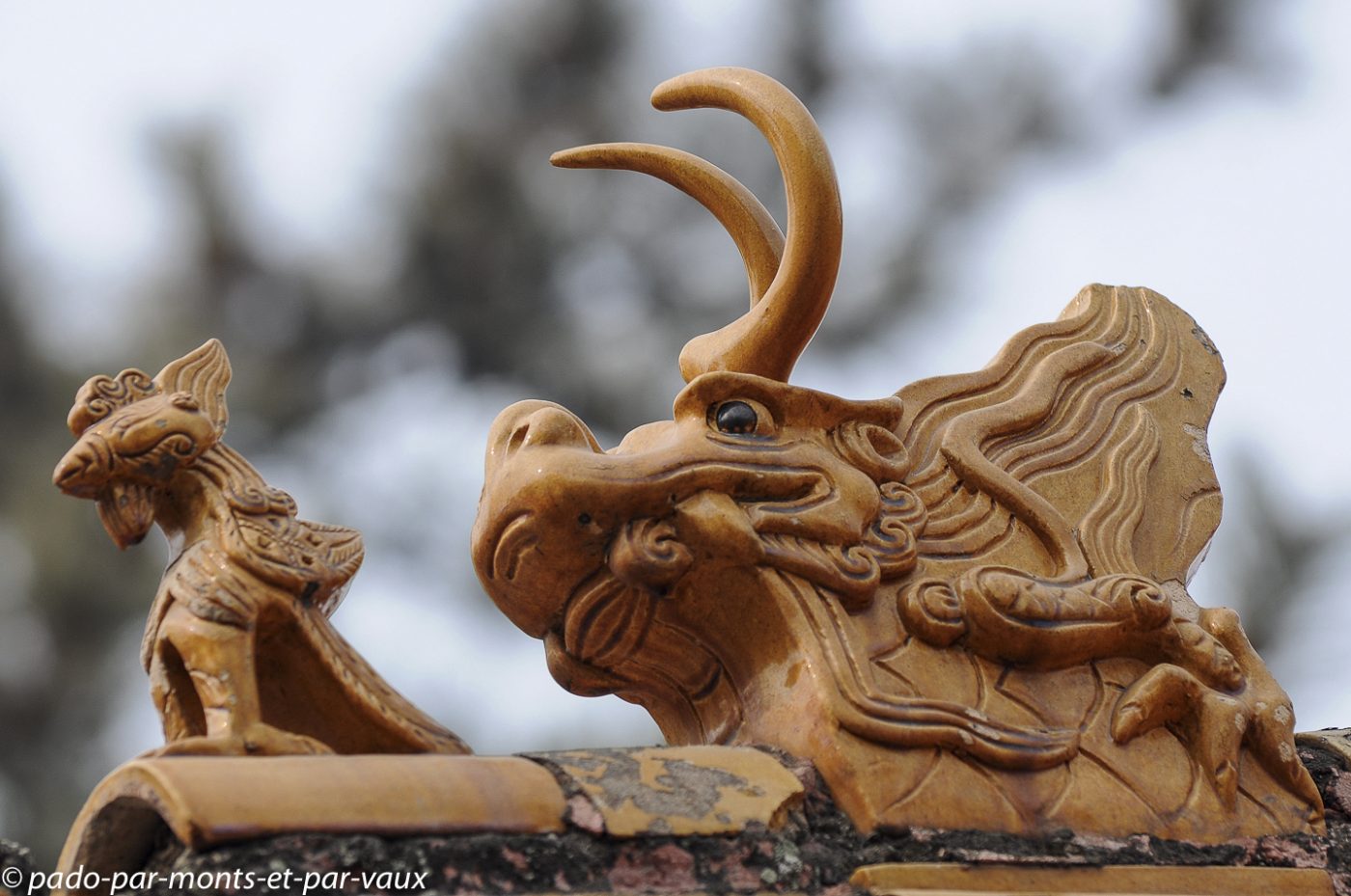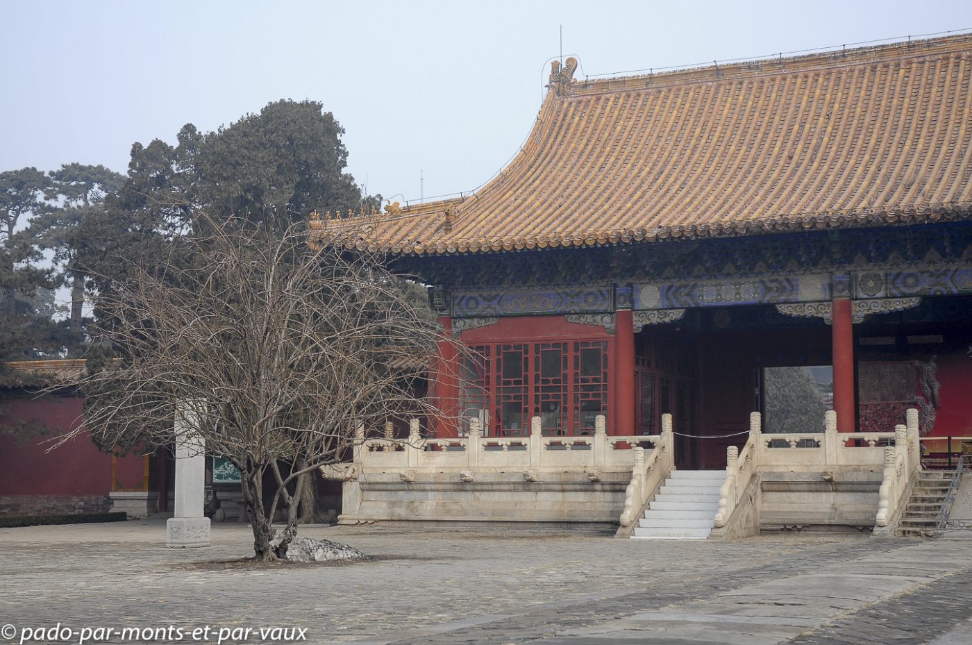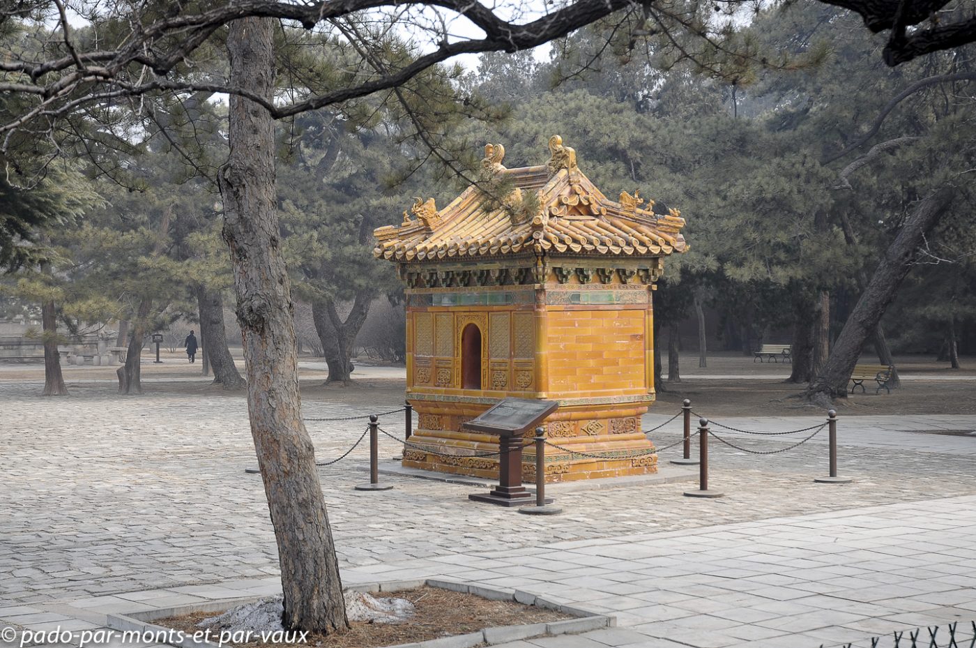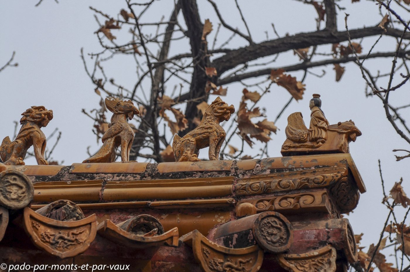 Nous reprenons le minibus pour gagner quelques kilomètres plus loin le tombeau Changling, tombeau de l’empereur Yongle mort en 1424. Treize des 16 empereurs de la dynastie Ming sont enterrés sur le site, mais seuls trois tombeaux se visitent. Celui de Yongle comporte trois bâtiments en surface et une tombe souterraine qui ne se visite pas. Jolis bâtiments colorés dont les toitures vernissées sont décorées de petits animaux en céramique.