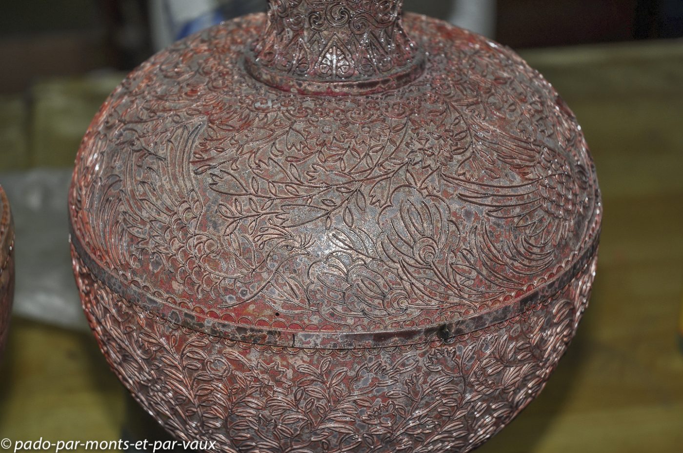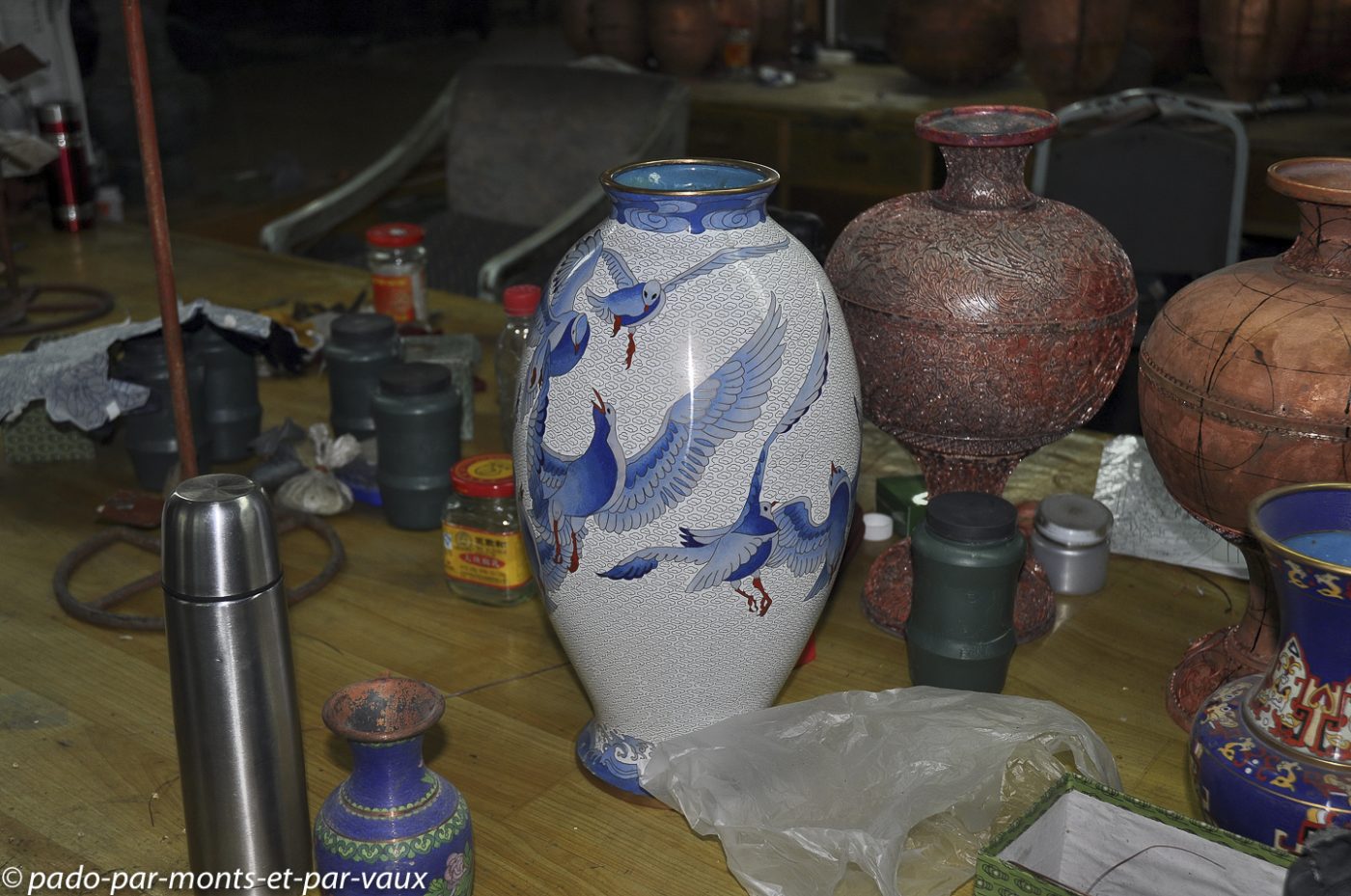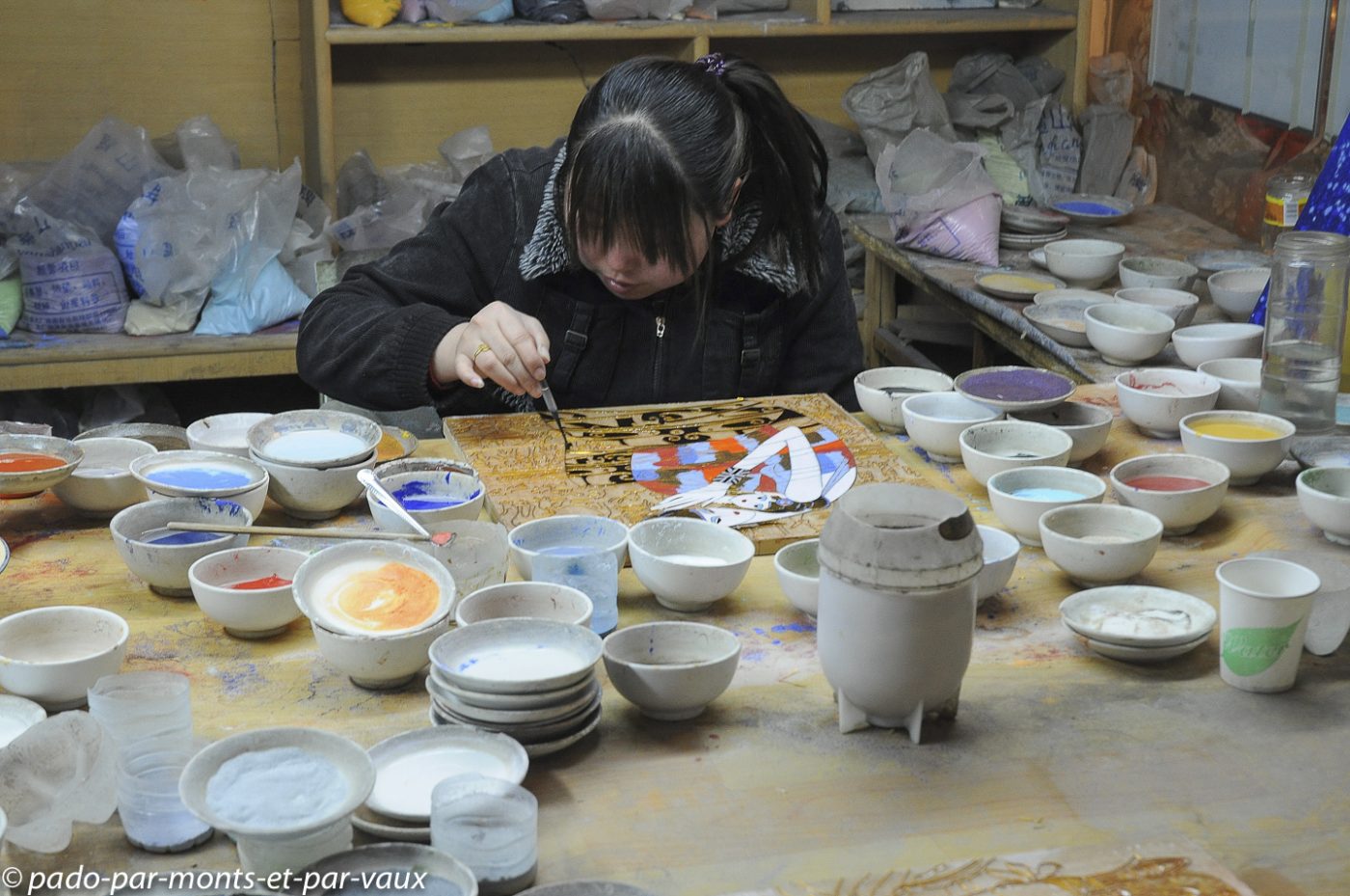 Arrêt dans une fabrique-magasin d’Etat de cloisonnés et visite des ateliers. Le cloisonné est une technique qui consiste, sur des objets en cuivre brut, à réaliser un lacis de dessins avec des fils de cuivre, délimitant des « cloisons » dont l’intérieur est ensuite émaillé. Naturellement après cuisson il y a tout un travail de ponçage pour que l’ensemble ait un rendu brillant. Le travail est beau, mais les motifs très chinois et très colorés sont assez peu compatibles avec nos goûts d’européens. Nous achetons quand même deux petits poissons et deux étoiles pour décorer l’arbre de Noël.