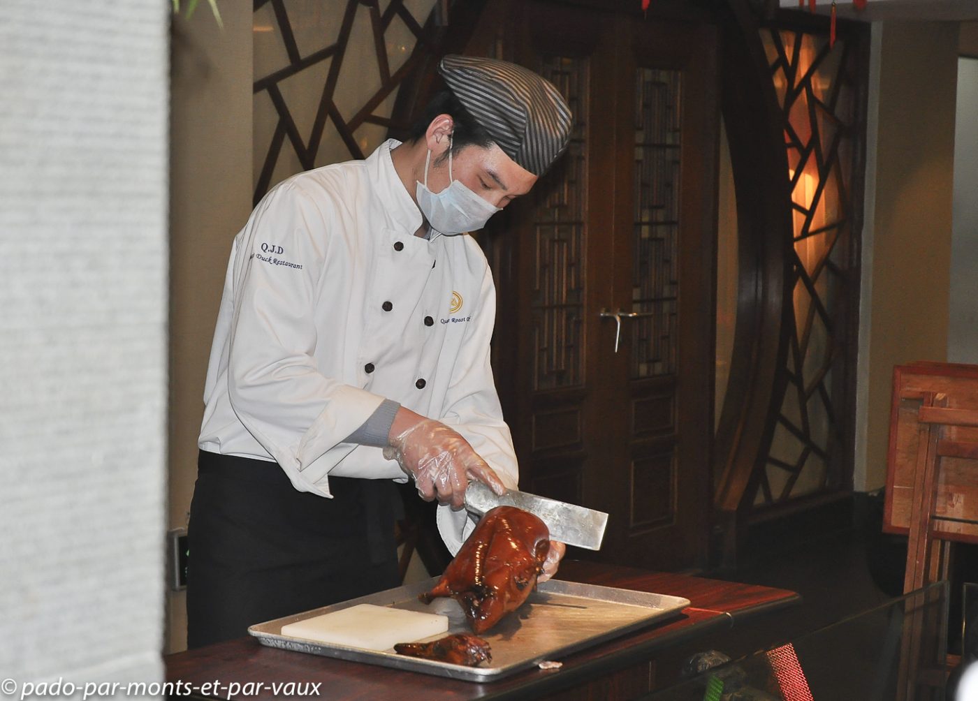 Retour à Pékin à la nuit. Ce soir nous avons décidé de manger du canard et nous nous rendons au Quanjude roast duck restaurant dont l’entrée est décorée d’un énorme canard façon Donald. Installation dans une grande salle en sous-sol avec une scène dans un coin, un peu dans le style des restaurants de Hong-Kong. Excellent repas : canard pékinois (avec ses petites crêpes et une très bonne sauce), aubergines très goûteuses et très bon plat de champignons et pousses de bambous. Avant d’entamer le canard, on nous apporte des morceaux de peau, croustillants d’un côté et avec leur gras de l’autre. Il faut les tremper dans du sucre avant dégustation. Personnellement ce n’est pas ma tasse de thé, mais Patrice se régale. En dessert nous optons pour un yaourt et des pommes au caramel. Le yaourt arrive tout de suite et nous pensons qu’ils ont oublié les pommes quand nous arrive sur la table une pyramide de beignets aux pommes englués dans du caramel ! Nous attaquons l’ensemble avec des baguettes ! Il faut décrocher un beignet, le tremper dans l’eau froide pour ne pas se brûler et le manger. C’est quasi-mission impossible avec des baguettes et voyant la nappe se maculer de bouts de beignets ils finissent par nous apporter des fourchettes ! Il y a à manger pour quatre et nous n’arrivons pas au bout…