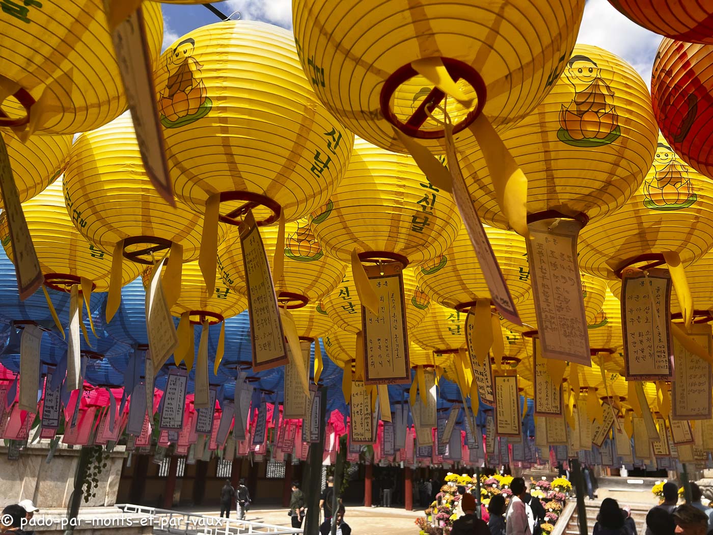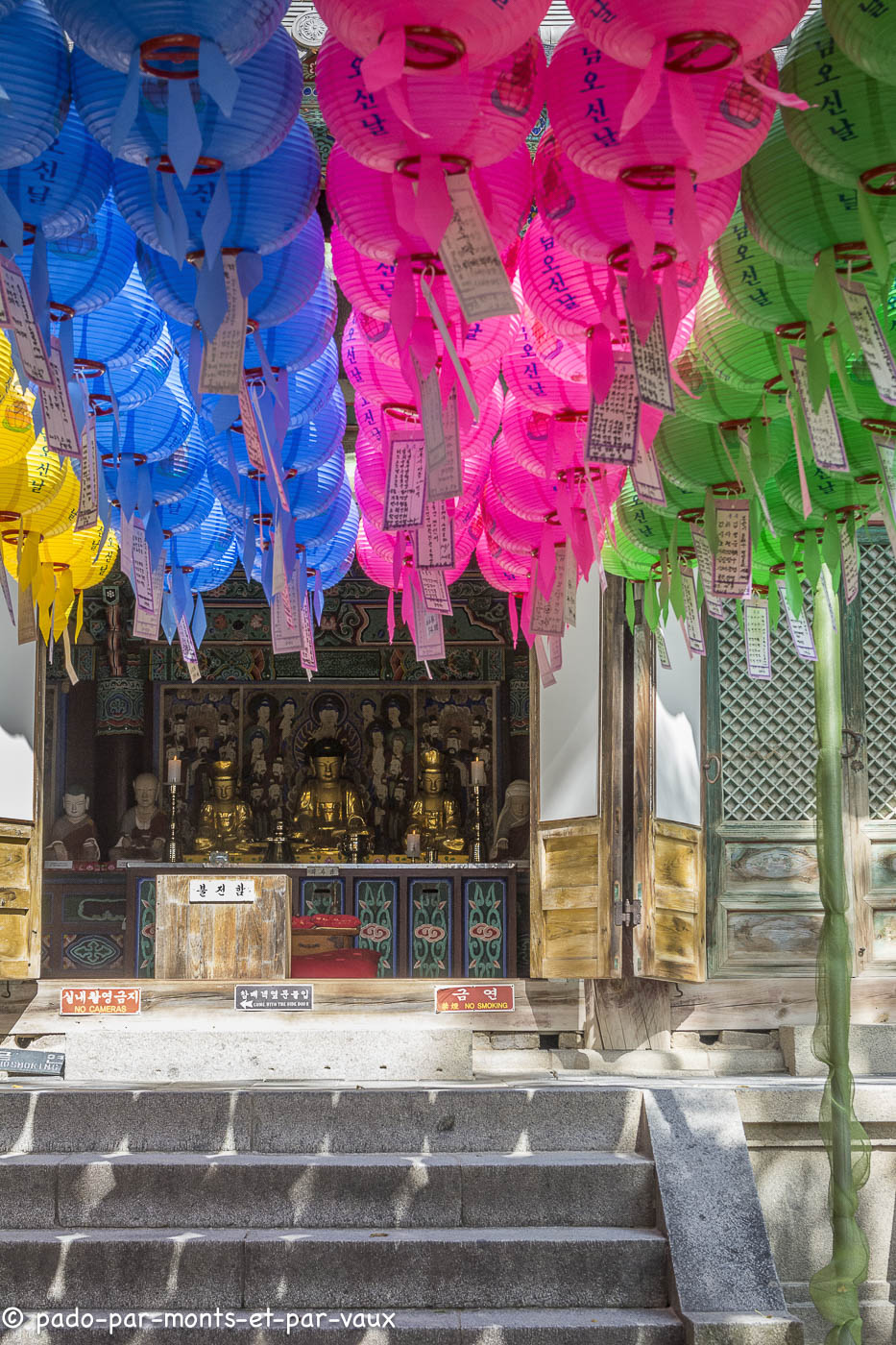 Deux pagodes trônent dans la cour principale. Le reste du complexe est bâti sur le même modèle que les autres temples : un ensemble de bâtiments, séparés par des petites cours décorées de chrysanthèmes et de lanternes et reliées par des galeries et des escaliers. A noter qu’ici les photos sont interdites dans l’intérieur de tous les bâtiments, y compris dans le petit musée qui n’a d’ailleurs aucun intérêt (entrée 2000W). Il y a plusieurs écoles en visite, dont des petits écoliers en uniforme qui sont particulièrement mignons.