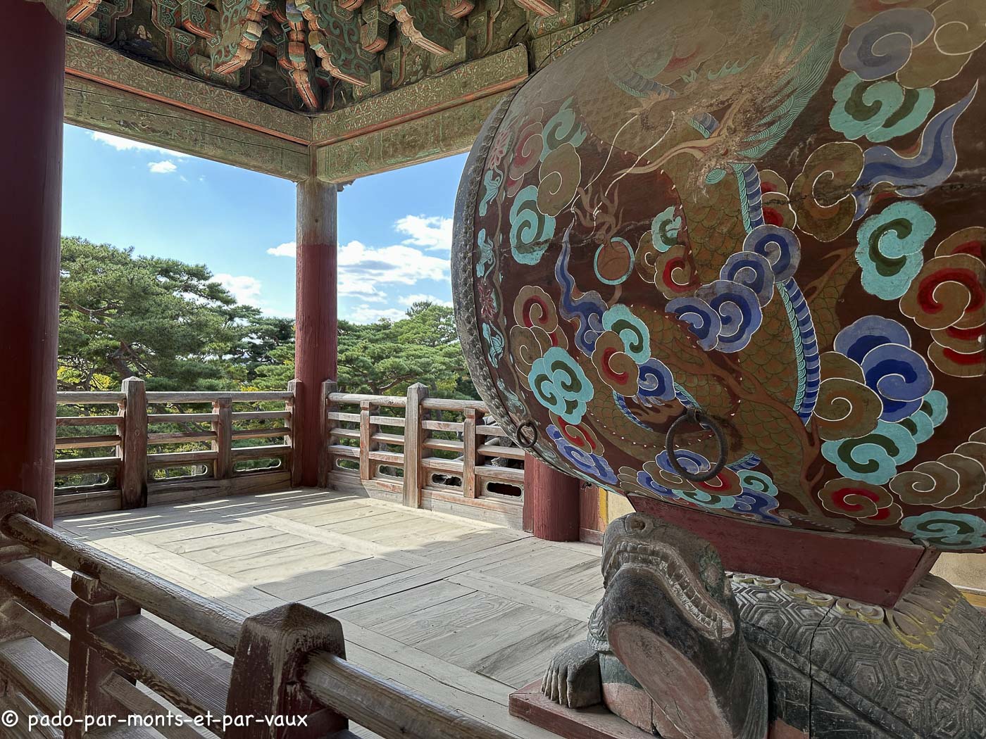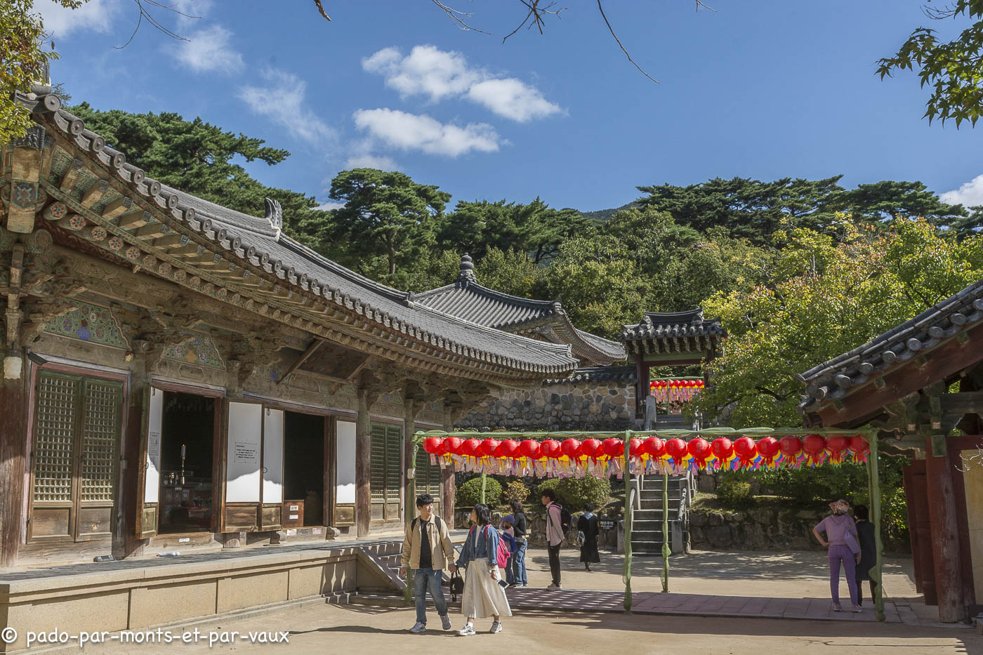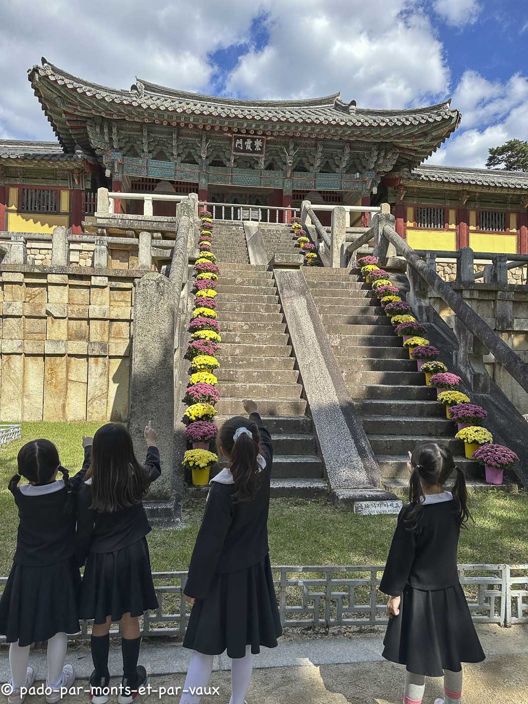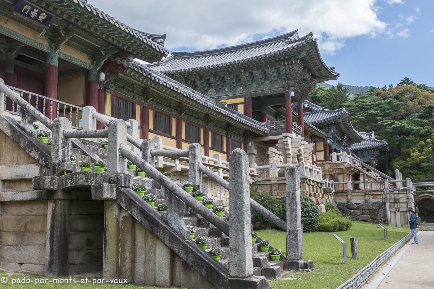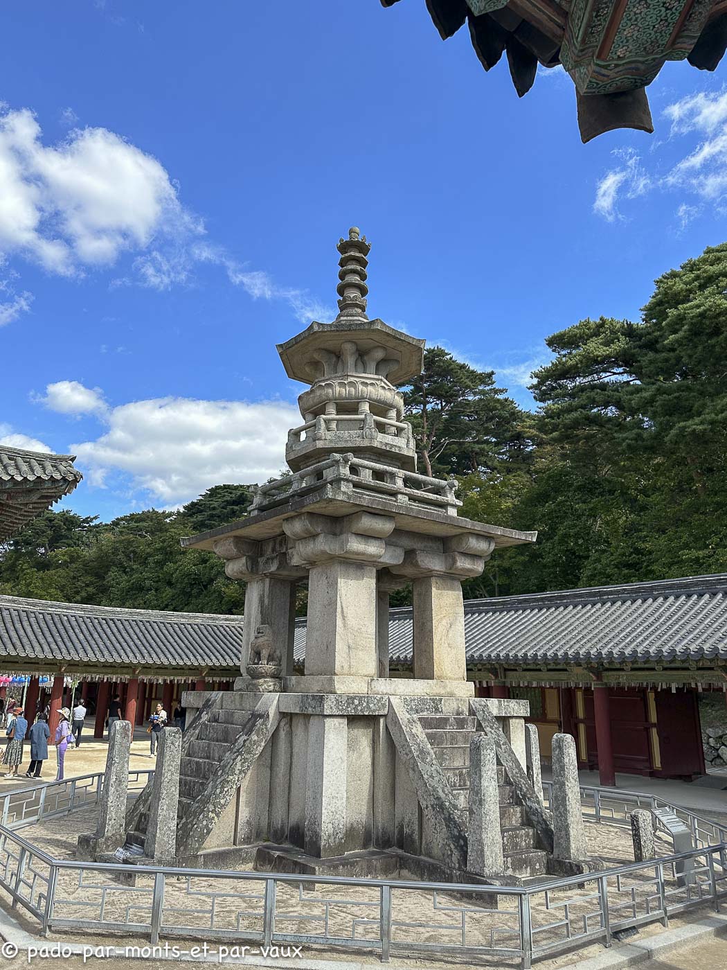 A environ une quinzaine de kilomètres de la ville, sur les pentes du Tohamsan (745m) se trouve le temple Bulguk. Fondé vers 500, reconstruit vers l’an 800, détruit au XVIème siècle lors de l’invasion japonaise et de nouveau reconstruit. Il a été édifié conformément au sutra du Lotus, avec pour objectif de créer sur terre un palais éternel pour Bouddha ! Deux escaliers monumentaux relient l’extérieur au bâtiment principal. A l’ouest, deux rangées de marches (pont du Lotus et pont des Sept Trésors qui mènent au hall du Paradis) et pareil à l’est (pont des Nuages bleus et pont des Nuages blancs avec chacun 33 marches évoquant les 33 étapes vers l’illumination). J’avoue qu’en lisant la description du guide avant d’aller visiter le temple, je m’attendais à des escaliers plus élégants. En fait ils sont très massifs et alourdissent plutôt la structure pavillonnaire.