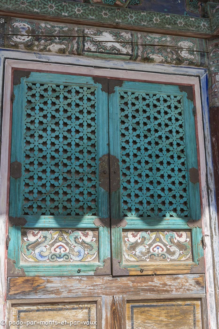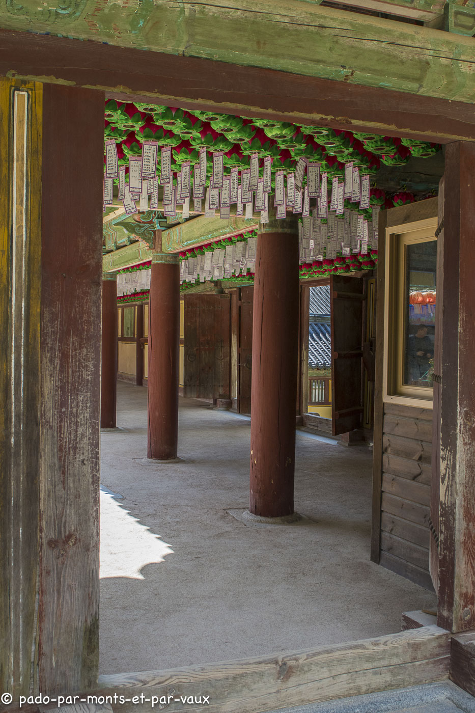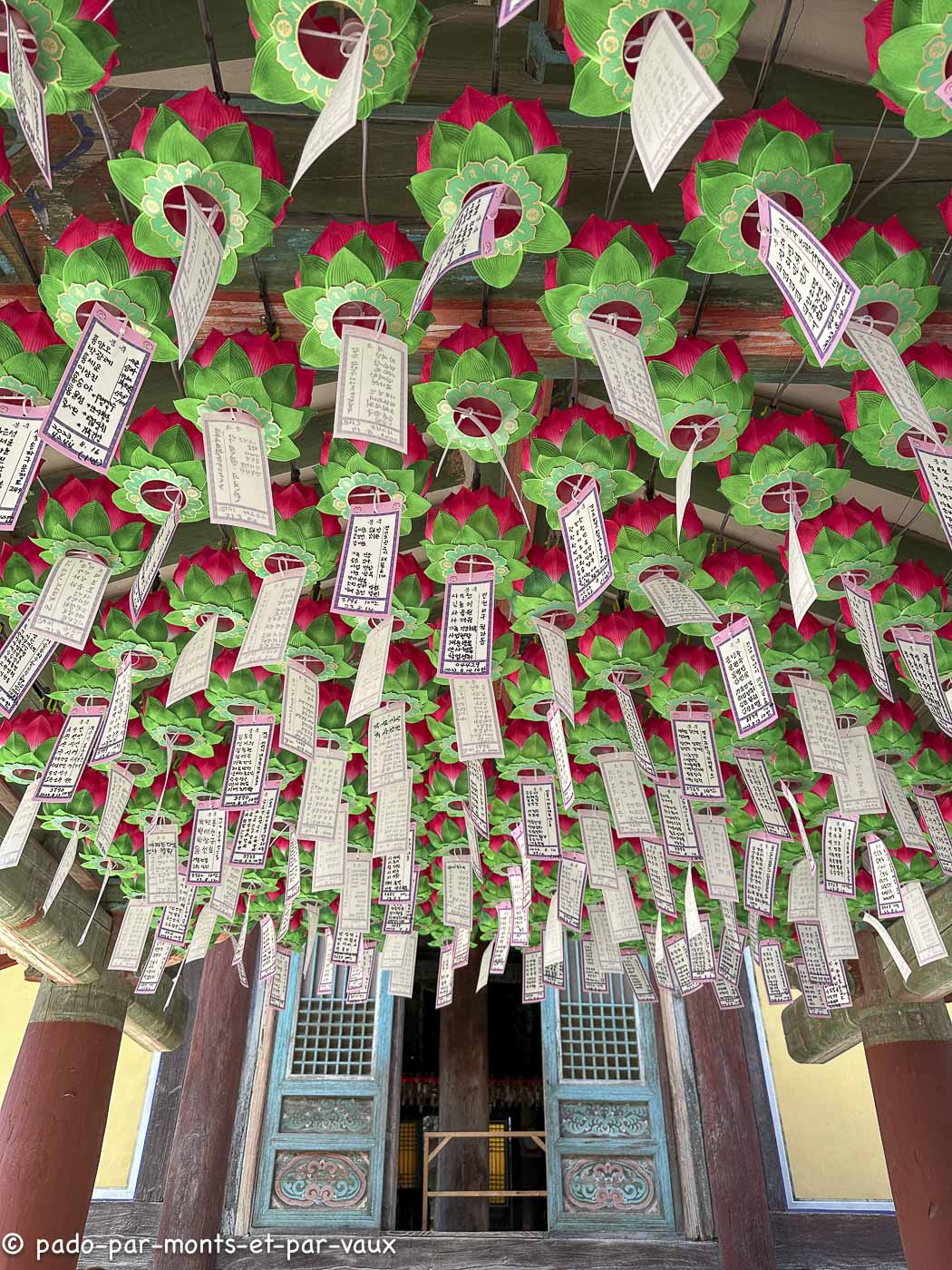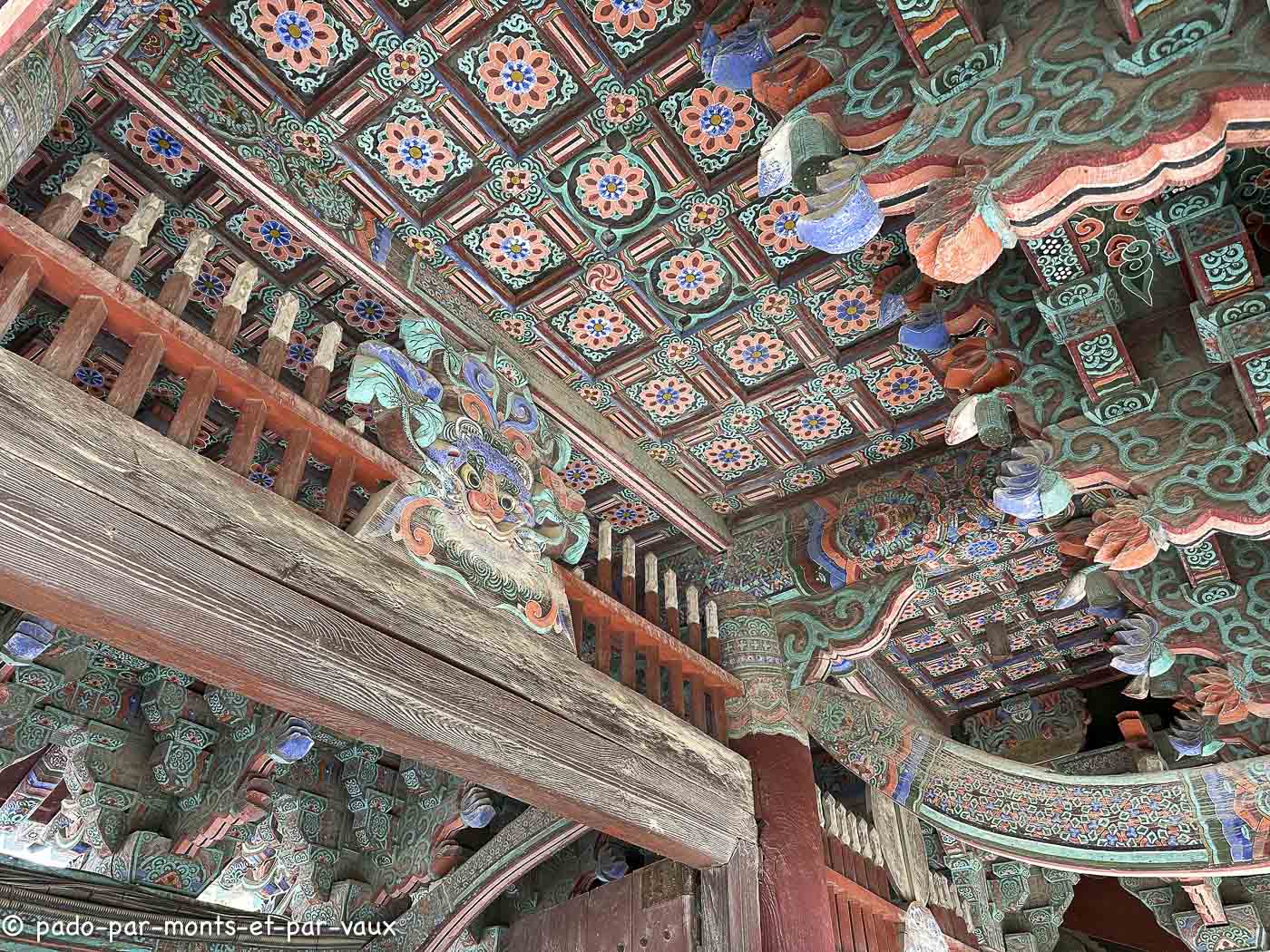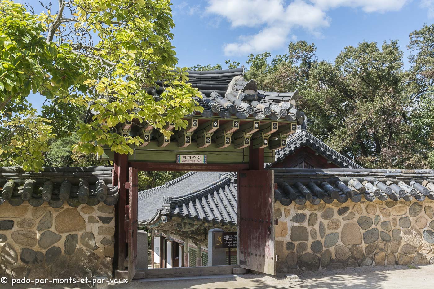 A environ une quinzaine de kilomètres de la ville, sur les pentes du Tohamsan (745m) se trouve le temple Bulguk. Fondé vers 500, reconstruit vers l’an 800, détruit au XVIème siècle lors de l’invasion japonaise et de nouveau reconstruit. Il a été édifié conformément au sutra du Lotus, avec pour objectif de créer sur terre un palais éternel pour Bouddha ! Deux escaliers monumentaux relient l’extérieur au bâtiment principal. A l’ouest, deux rangées de marches (pont du Lotus et pont des Sept Trésors qui mènent au hall du Paradis) et pareil à l’est (pont des Nuages bleus et pont des Nuages blancs avec chacun 33 marches évoquant les 33 étapes vers l’illumination). J’avoue qu’en lisant la description du guide avant d’aller visiter le temple, je m’attendais à des escaliers plus élégants. En fait ils sont très massifs et alourdissent plutôt la structure pavillonnaire.