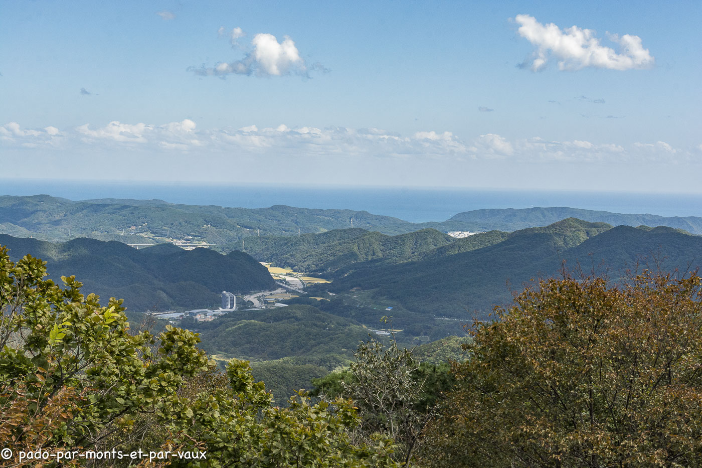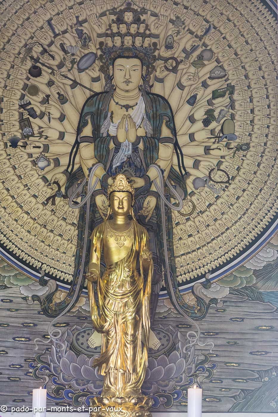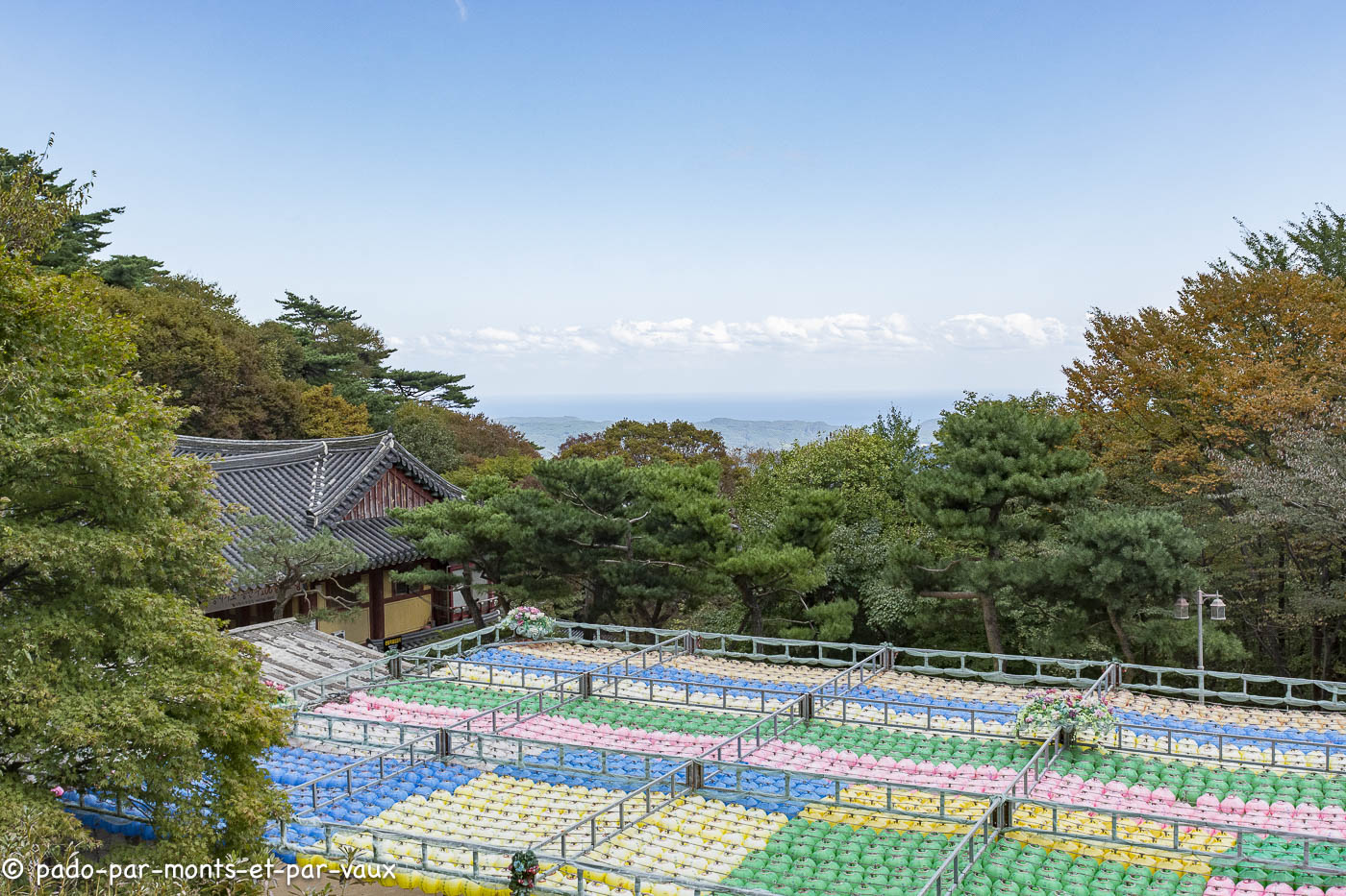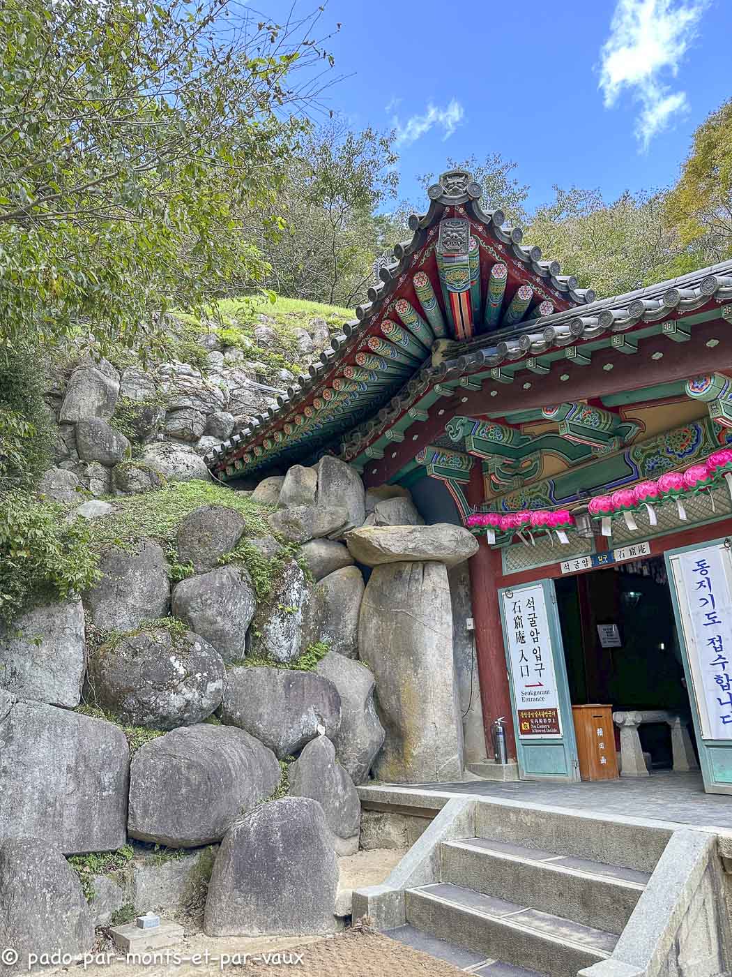 Quelques kilomètres plus loin, au bout d’une route en tortillons, nous allons voir un autre sanctuaire, Seokguram grotto. Dans un très bel environnement de forêts, une grotte (en fait une pièce voûtée recouverte par un tertre artificiel) abrite une statue de Bouddha en pierre de 3,5 mètres de haut reposant sur un lotus de granit blanc. Elle est entourée de 42 autres statues de divinités taillées dans la pierre. L’ensemble est très beau mais on est maintenus à distance par une barrière et une vitre qui gênent la vision et là encore les photos sont interdites. Belle vue depuis le parking sur les montagnes et sur la mer au loin.