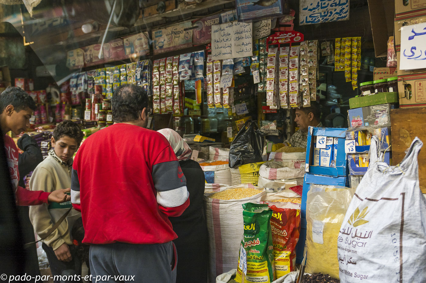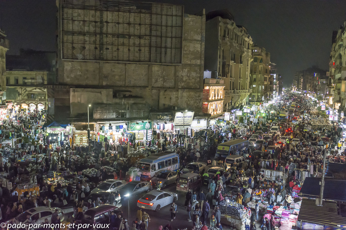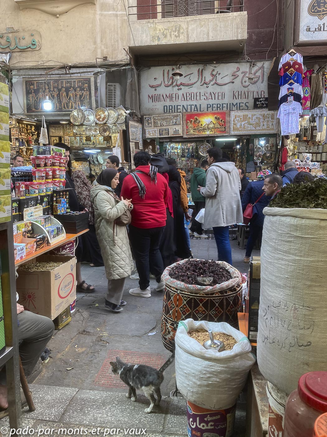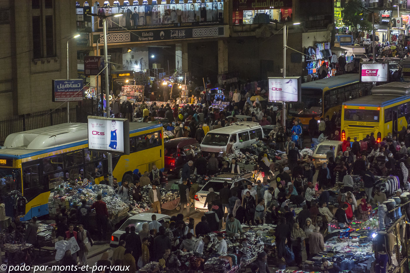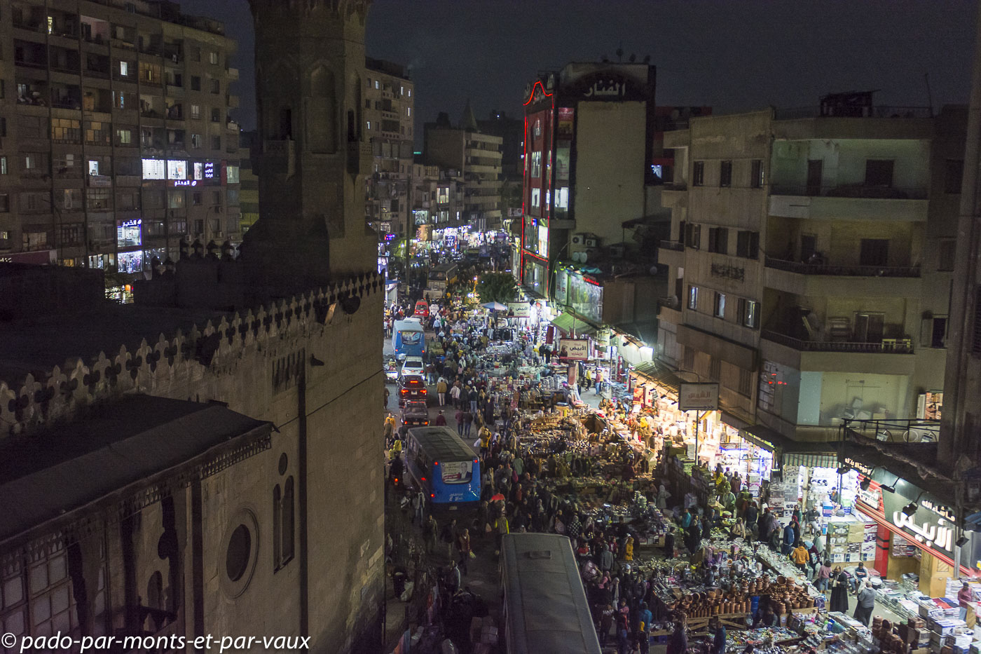 En fin d’après-midi nous partons vers le souk dans le quartier de la mosquée El-Azhar. Les embouteillages sont assez monstrueux, mais le chauffeur assure que l’on peut y passer une heure avant de partir à la gare. Il faut jouer des coudes pour avancer à pieds dans les rues en évitant les voitures, les bus de tourisme, les deux-roues, les porteurs et le flot des piétons. Le quartier vaut vraiment le coup d’œil. Achat de mélanges d’épices, de fleurs d’hibiscus séchées pour le karkadé (tisane très populaire qui se boit chaude ou froide) et de dattes séchées qui doivent être réhydratées avant d’être consommées. Nous prenons un petit moment pour déguster un karkadé dans un bistrot en face de la mosquée en regardant les gens passer.