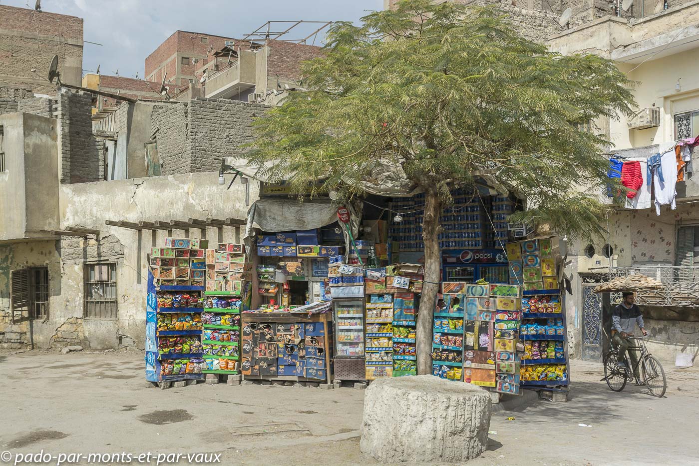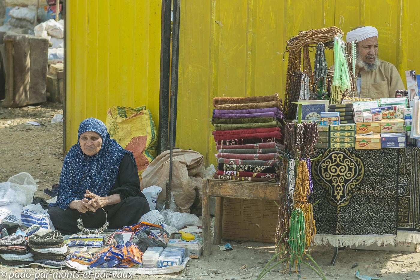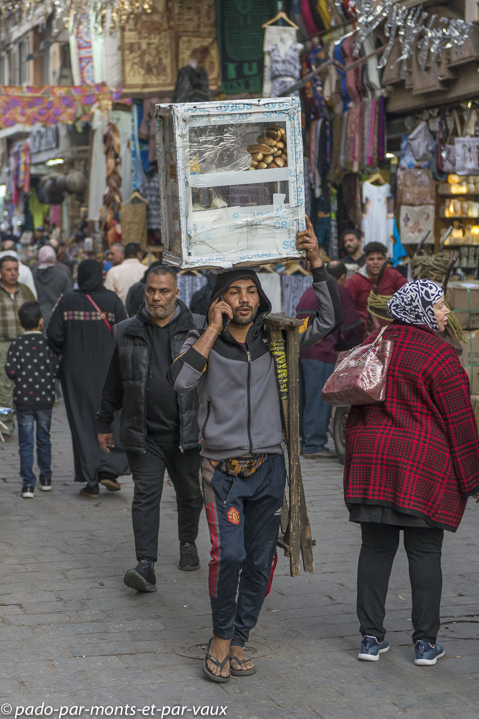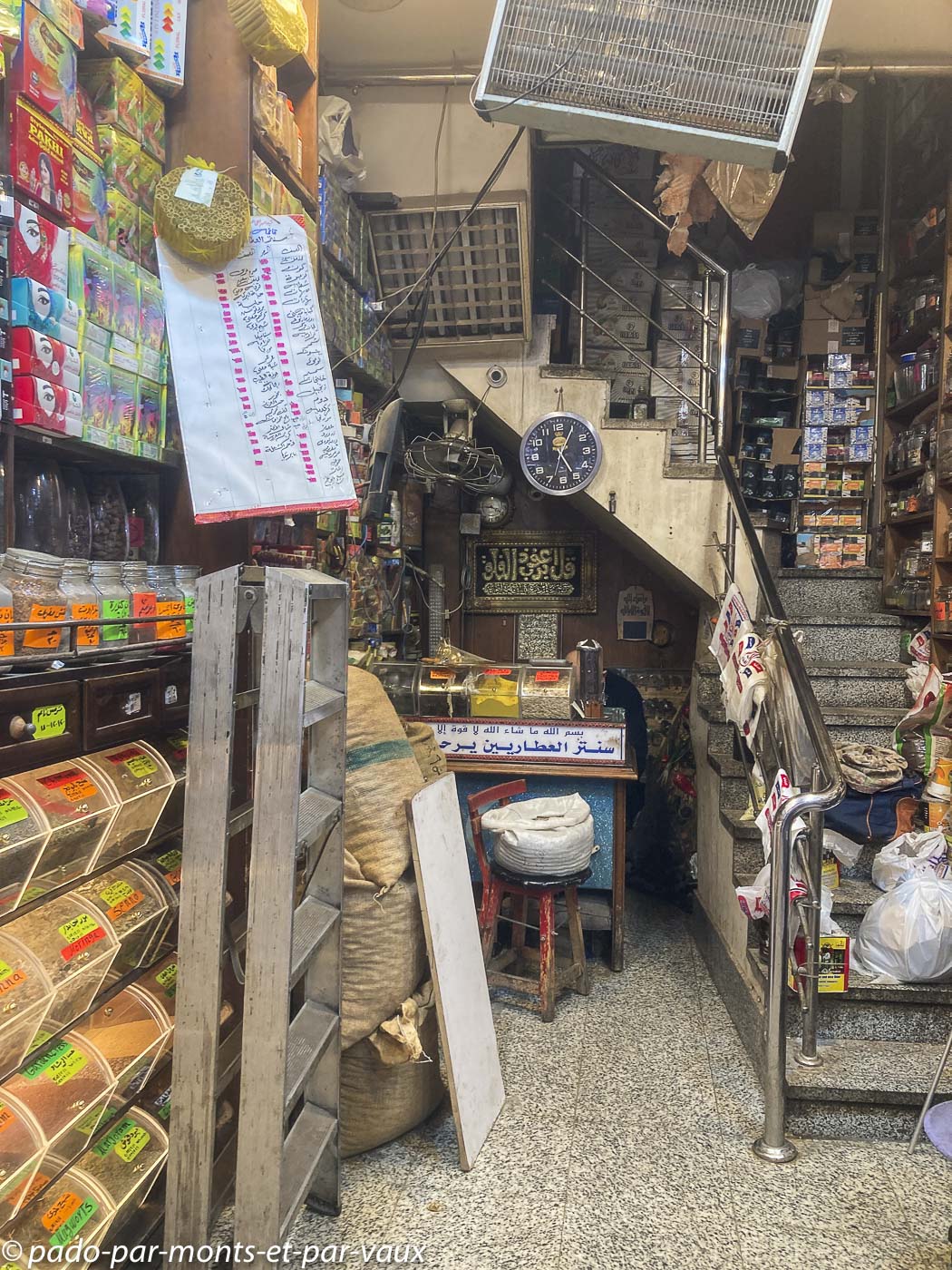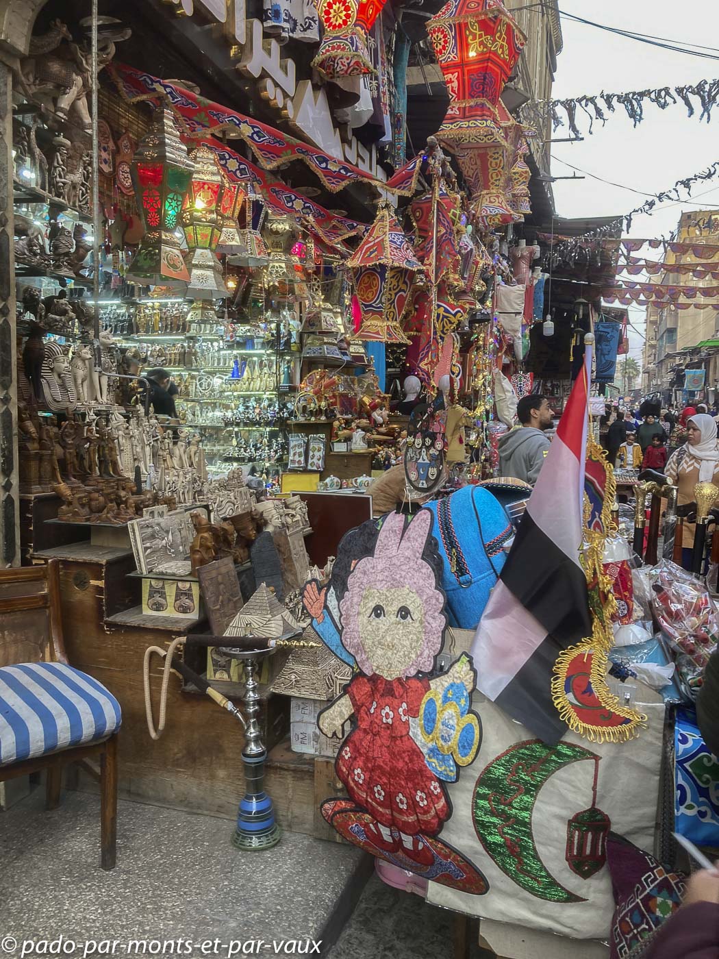 En fin d’après-midi nous partons vers le souk dans le quartier de la mosquée El-Azhar. Les embouteillages sont assez monstrueux, mais le chauffeur assure que l’on peut y passer une heure avant de partir à la gare. Il faut jouer des coudes pour avancer à pieds dans les rues en évitant les voitures, les bus de tourisme, les deux-roues, les porteurs et le flot des piétons. Le quartier vaut vraiment le coup d’œil. Achat de mélanges d’épices, de fleurs d’hibiscus séchées pour le karkadé (tisane très populaire qui se boit chaude ou froide) et de dattes séchées qui doivent être réhydratées avant d’être consommées. Nous prenons un petit moment pour déguster un karkadé dans un bistrot en face de la mosquée en regardant les gens passer.