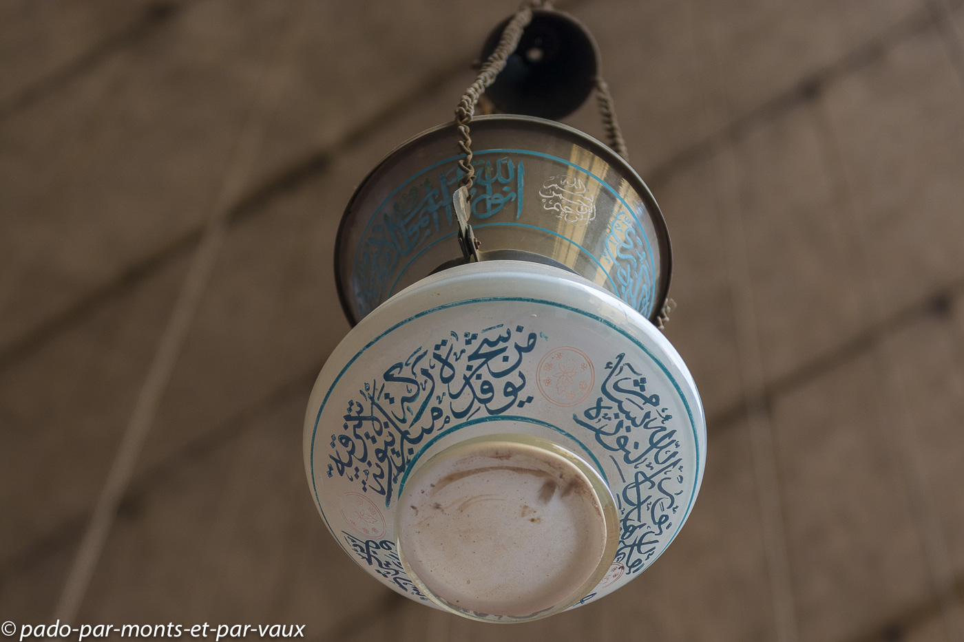 Après un passage en double chicane, on débouche dans une très belle cour centrale avec un pavement de marbre. Salle de prière éclairée par des dizaines de lampes en verre émaillé. L’acoustique est parfaite et nous pouvons en juger grâce à la démonstration d’un officiant qui se met à chanter.