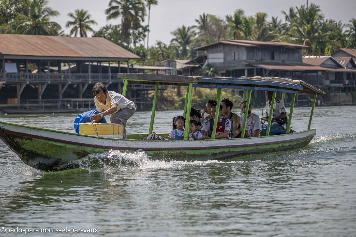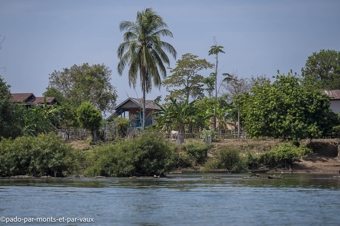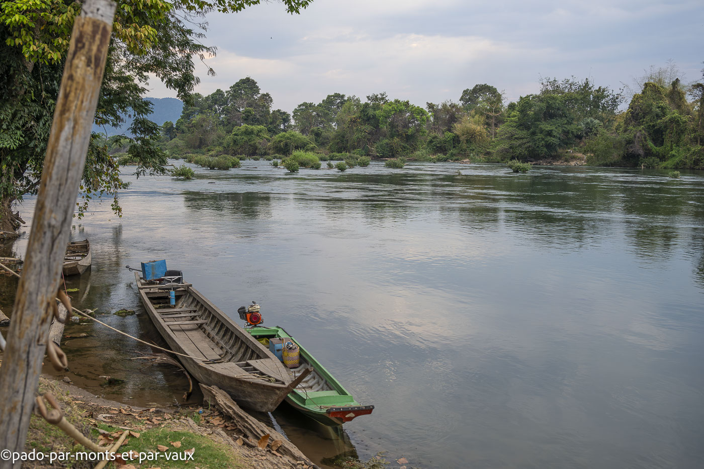 Au petit port de Nakasang où de nombreuses pirogues déchargent des victuailles et embarquent des passagers, nous prenons un bateau en direction de l’île de Khone. Le chauffeur laisse la voiture et nous accompagne. Nous sommes dans la zone dite des « 4000 îles », un réseau d’îlots couverts de végétation, éparpillés au milieu du Mékong.