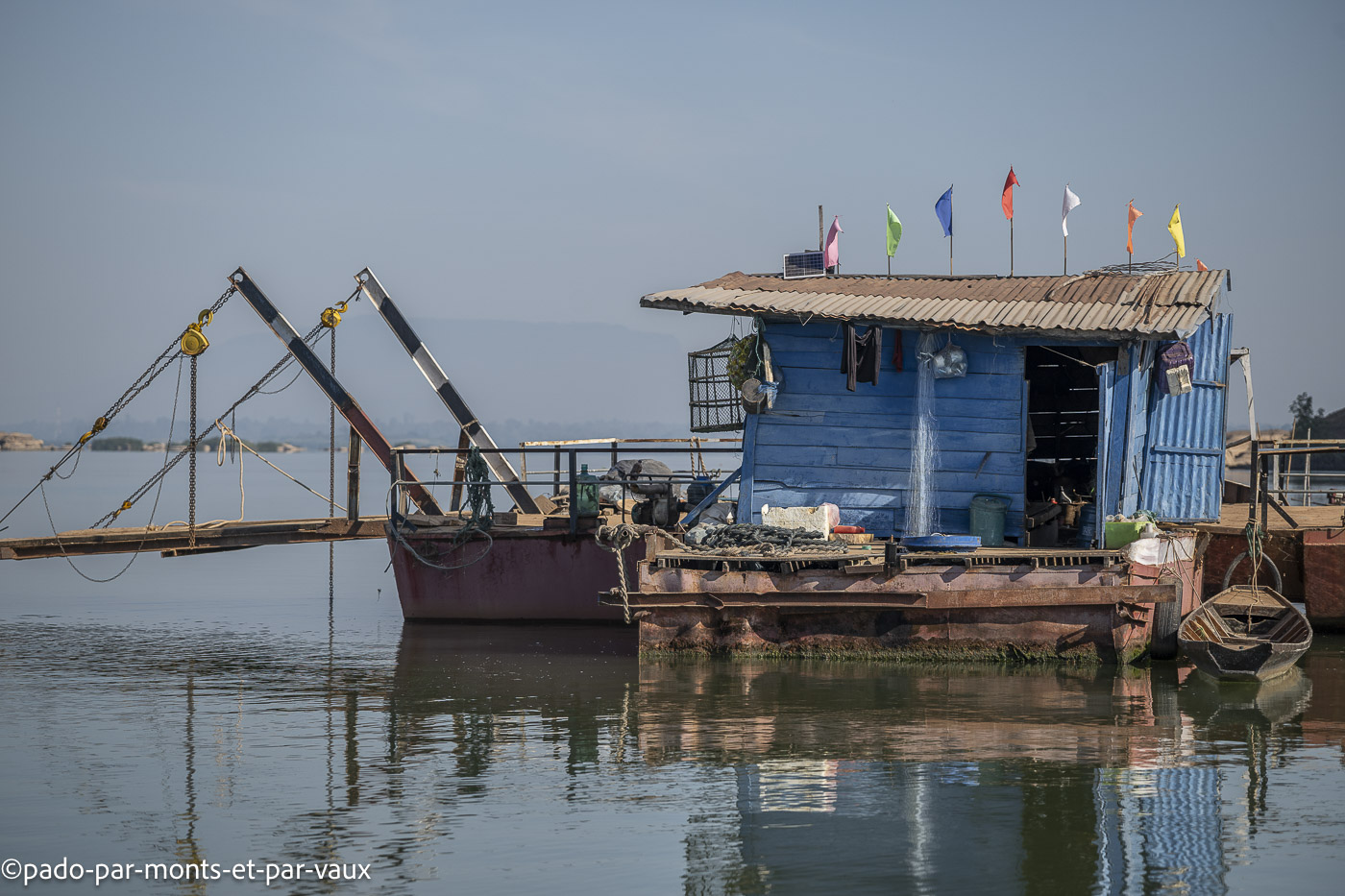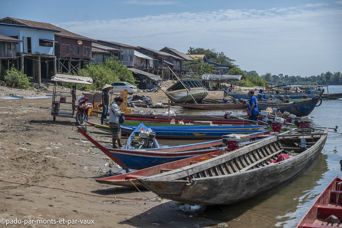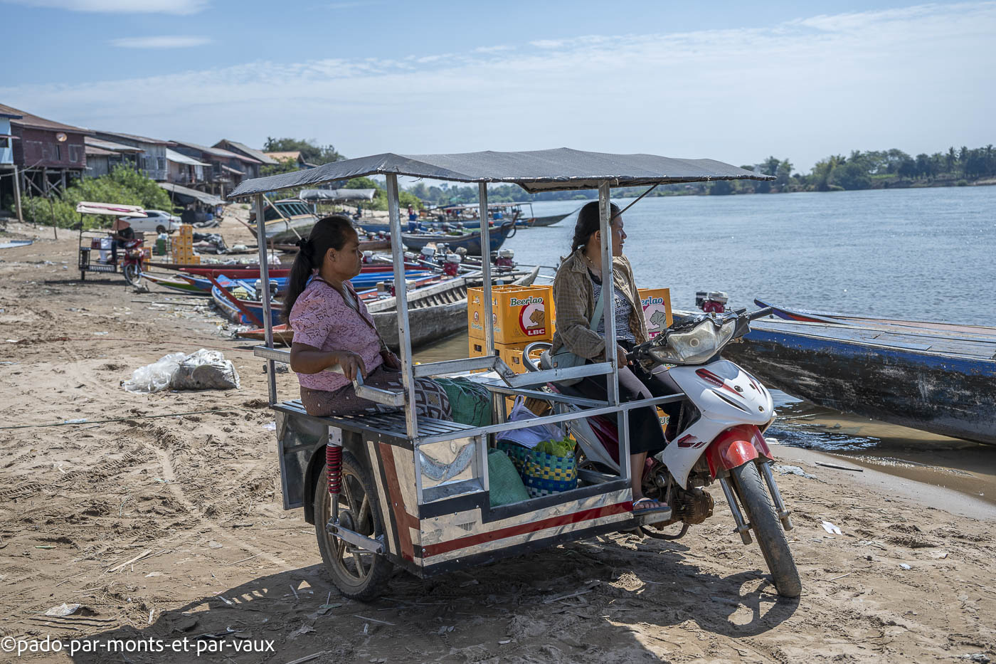 Au petit port de Nakasang où de nombreuses pirogues déchargent des victuailles et embarquent des passagers, nous prenons un bateau en direction de l’île de Khone. Le chauffeur laisse la voiture et nous accompagne. Nous sommes dans la zone dite des « 4000 îles », un réseau d’îlots couverts de végétation, éparpillés au milieu du Mékong.