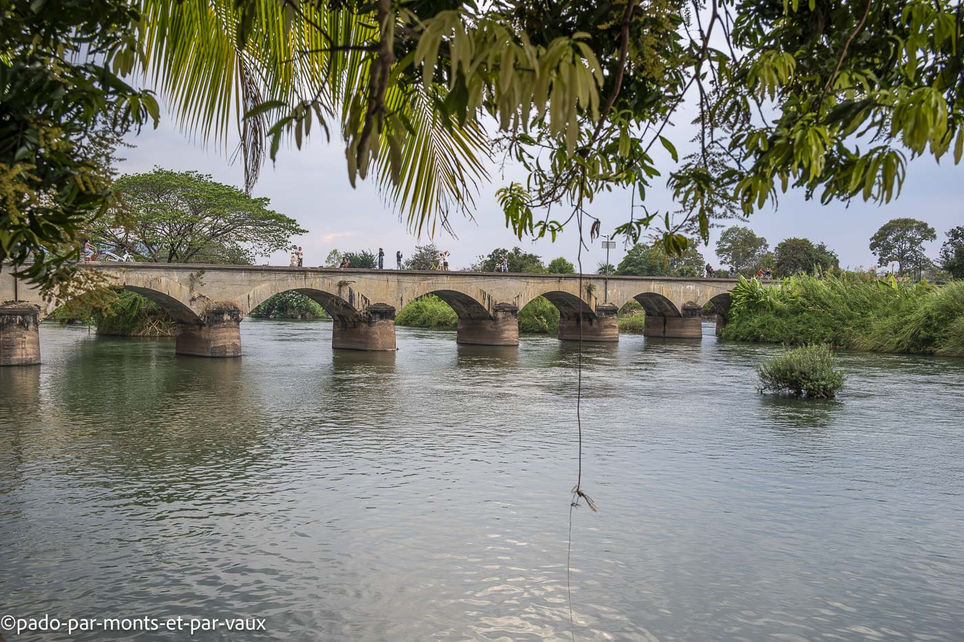 Le chauffeur nous raccompagne à l’hôtel en tuk-tuk puis nous partons promener de notre côté. Plus intéressant à mon goût que le pont et autres locomotives, il reste quelques anciennes maisons coloniales dont certaines bien retapées. C’est le cas de la villa patrimoniale française qui a été construite en 1896 pour accueillir les officiers français travaillant pour la « Saïgonaise de navigation et de transports » et « Compagnie des messageries fluviales de Cochinchine » dans le cadre des travaux de construction de la ligne de chemin de fer et du pont. L’ancienne maison coloniale est devenue un hôtel. Nous retournons jusqu’au pont pour le traverser à pied puis nous poussons jusqu’à un temple entouré d’un grand cimetière avec des mini-pagodes de toutes les tailles. Les bouddhistes laotiens pratiquent la crémation. A l’issue de celle-ci, des fragments d’os sont récupérés et placés dans des petites pagodes (bone pagodas) qui peuvent contenir les cendres d’une personne ou de plusieurs membres d’une même famille.
