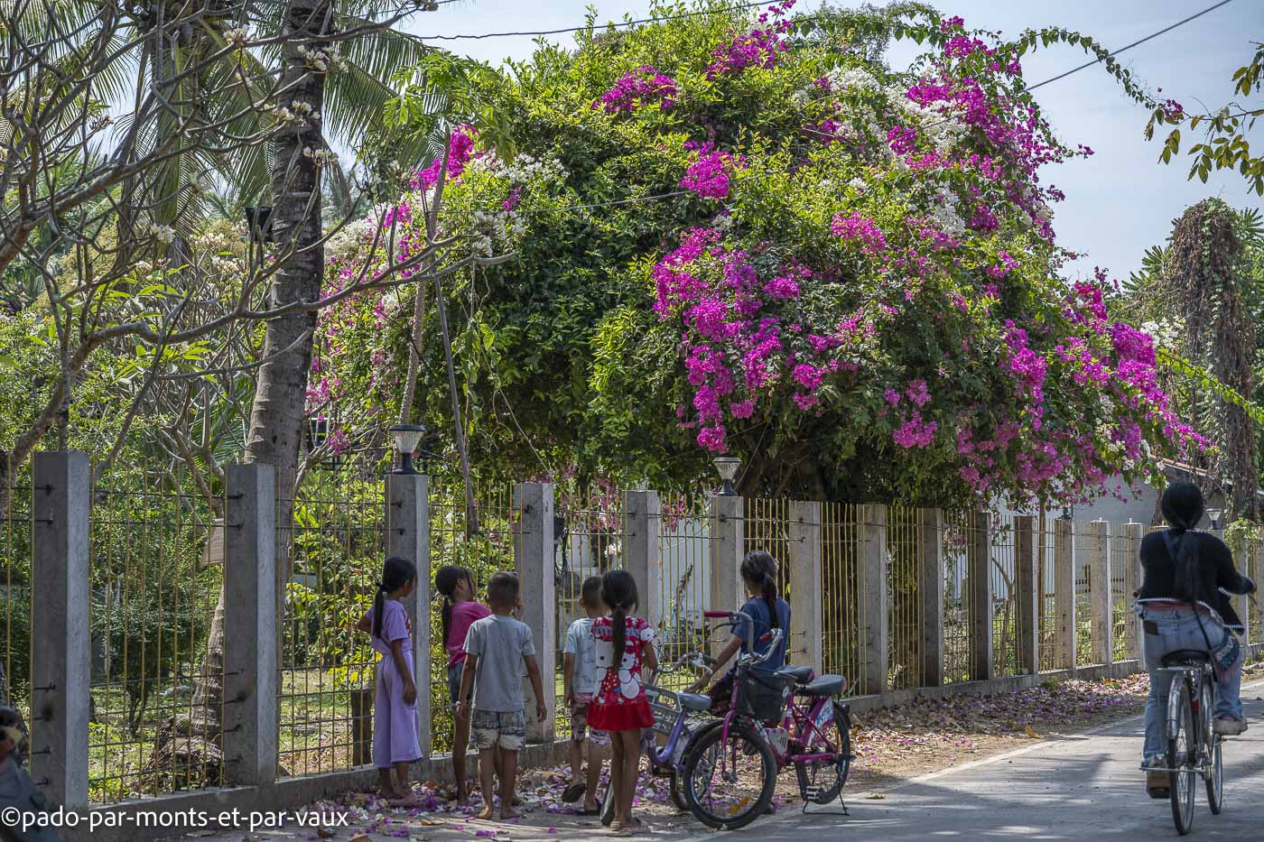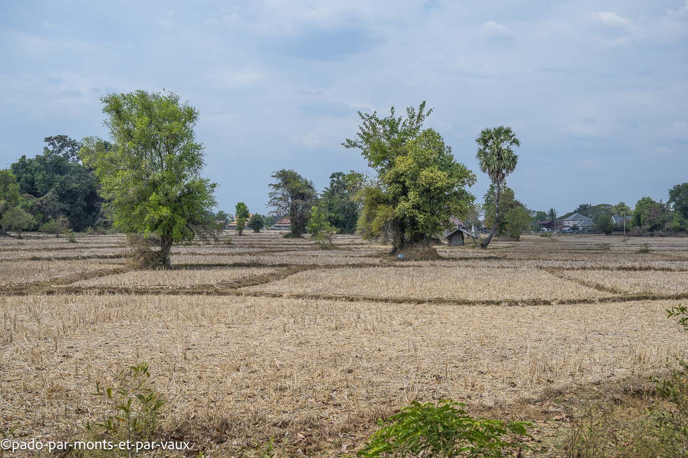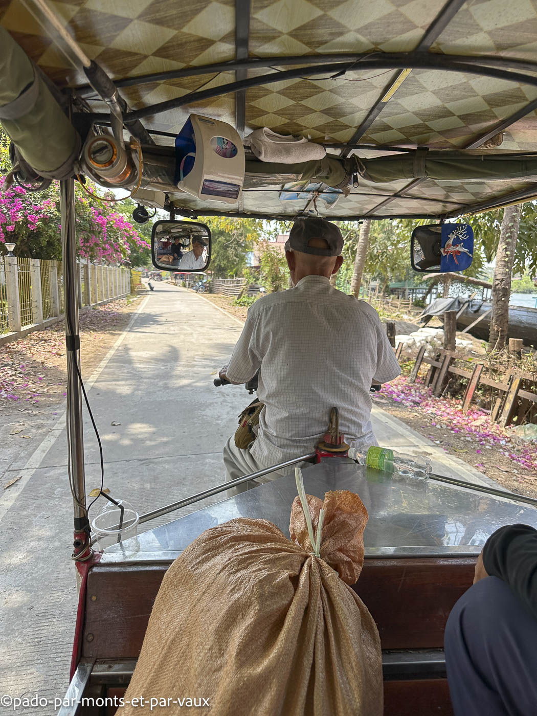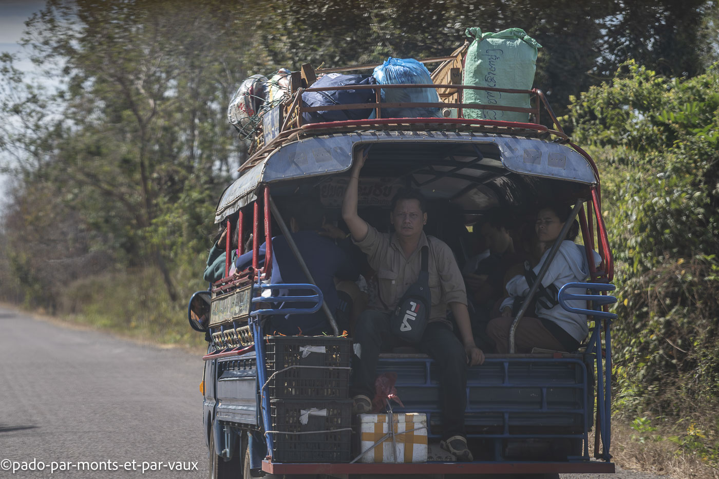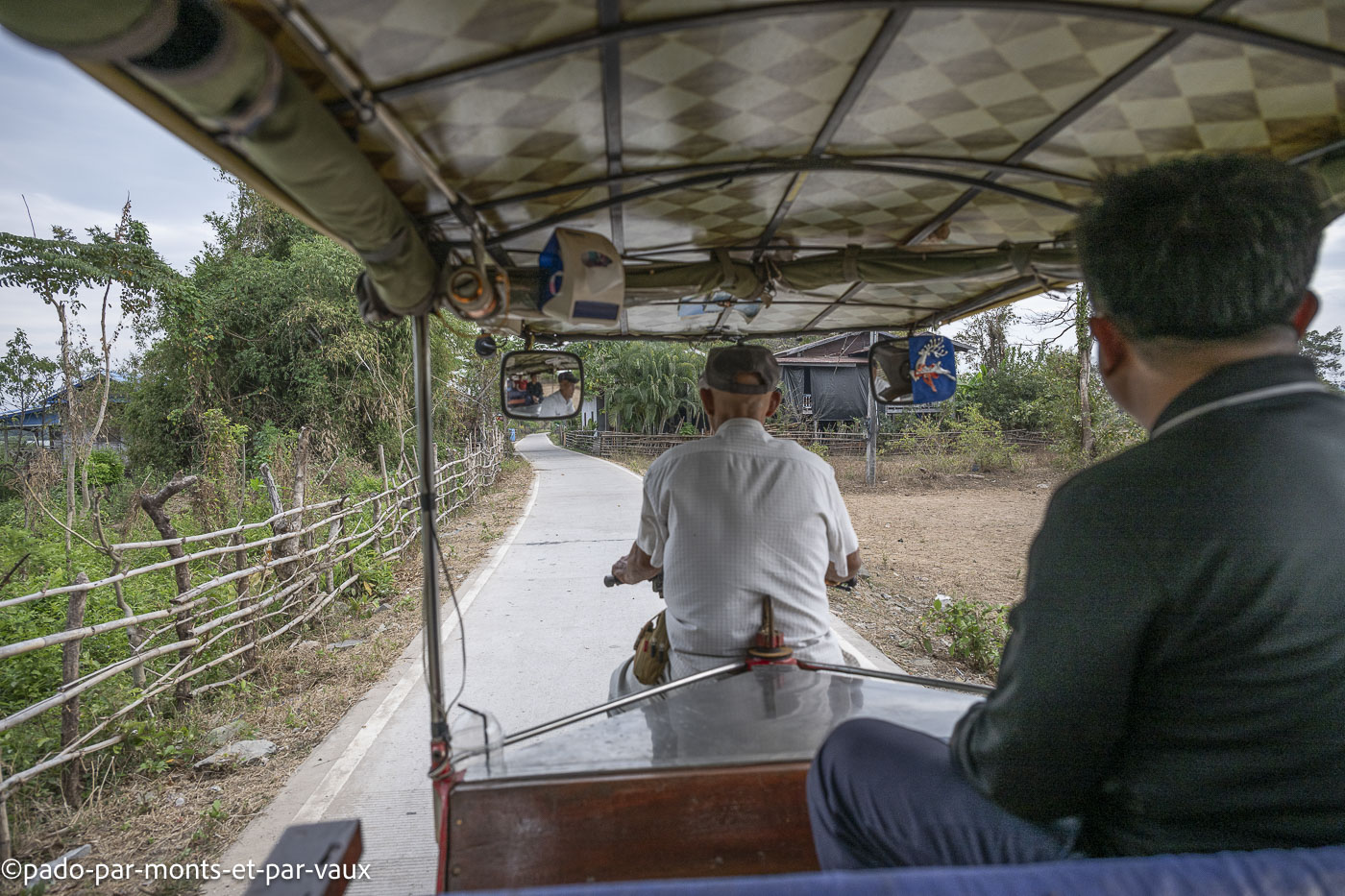 Le chauffeur nous attend et nous voilà partis pour deux heures de mauvaise route bosselée en direction du sud et de Nakasang. Sur la route nous croisons des petits camions qui font transport en commun. Les passagers sont assis à l’arrière et se prennent toute la poussière de la route dans la figure. Motos et mobylettes sont parfois équipées d’une sorte de side-car sommaire protégé par une toile dans lequel peuvent prendre place plusieurs passagers. Autre véhicule très présent : une sorte de demi tracteur avec deux grosses roues, un moteur et une barre de direction. L’ensemble est fixé à une cariole dans laquelle on transporte tout, gens, légumes, bêtes et matériaux divers. Notre chauffeur appelle ces véhicules des « chinese buffalos » car ils ont remplacé les buffles.