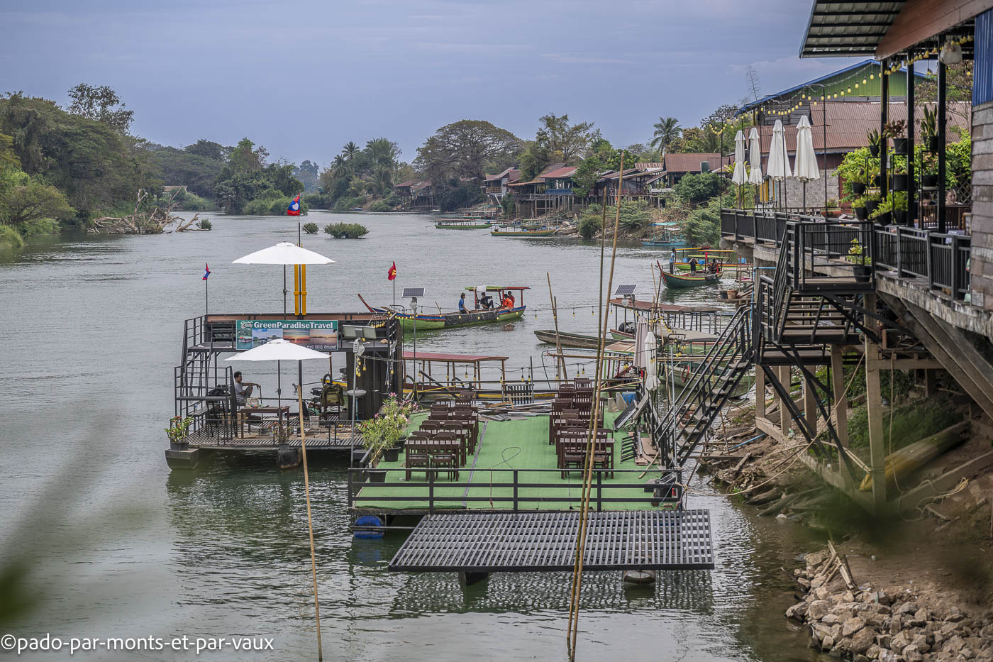 Citronnade fraîche au restaurant de l’hôtel dont la terrasse surplombe la rivière. L’endroit est agréable et nous y restons tranquillement jusqu’à l’heure de dîner (et ce d’autant que notre chambre très sombre n’invite pas au farniente). Hamburger pour Patrice et Pad Thai pour moi. C’est correct sans plus. La clim de la chambre n’a plus d’âge et n’envoie qu’un faible zéphir d’air frais avec un bruit de casserole. On espère qu’on va arriver à dormir !