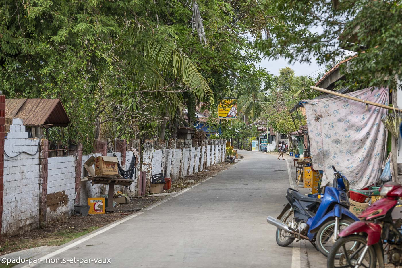 Poursuite de notre virée en tuk-tuk pour voir les restes de l’ancien protectorat français. A la fin du 19ème siècle, 4 kms de voie ferrée ont été construits pour traverser l’île de Don Khone, permettant de faire passer les chutes de Khone aux navires en empruntant une voie terrestre, la voie maritime étant infranchissable. En 1893, deux canonnières ont été chargées sur des chariots tractés par une locomotive et remises à l’eau de l’autre côté des rapides. En 1910, les Messageries fluviales ont bâti un pont ferroviaire entre les îles de Don Khone et Don Det et ont poursuivi la ligne de chemin de fer. On peut encore voir une vieille locomotive, quelques photos anciennes, l’ancien débarcadère et naturellement le pont qui relie les deux îles.