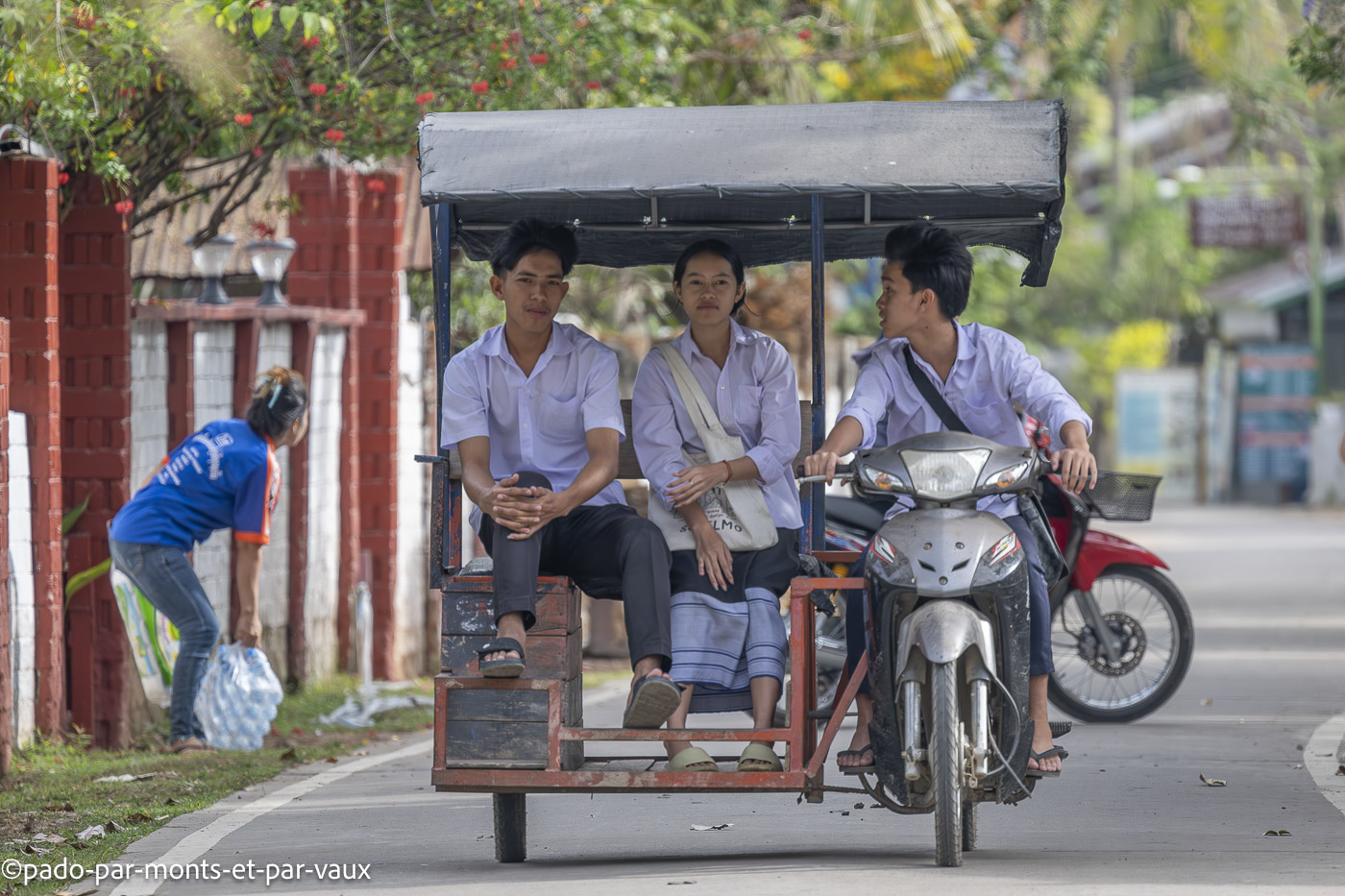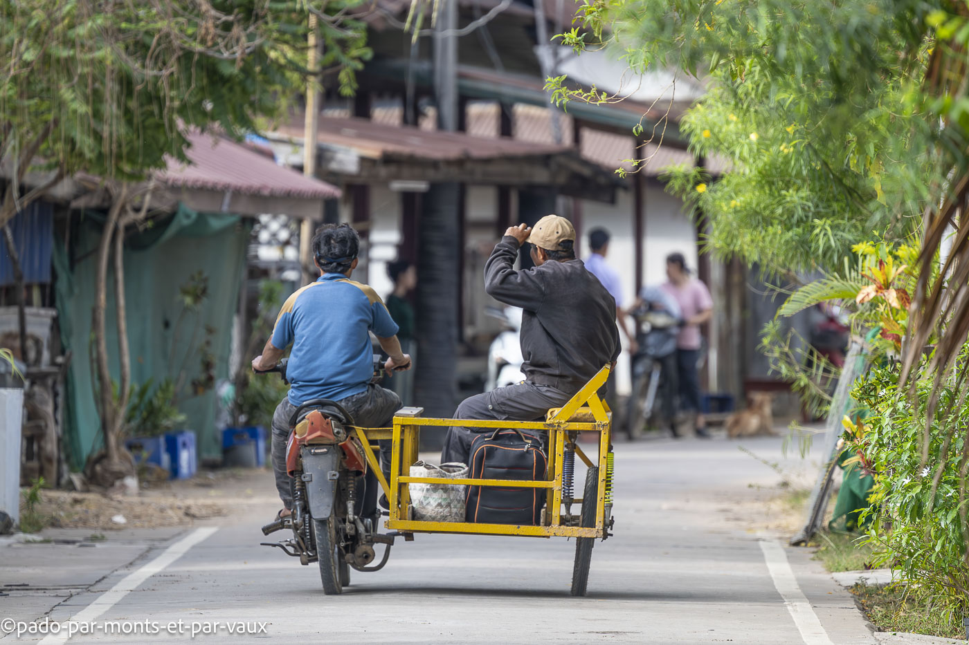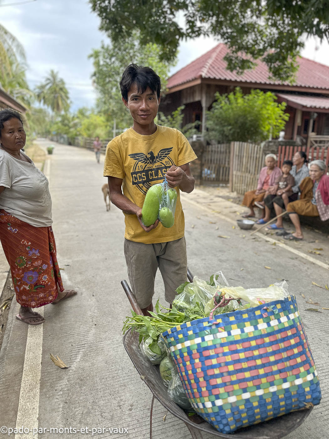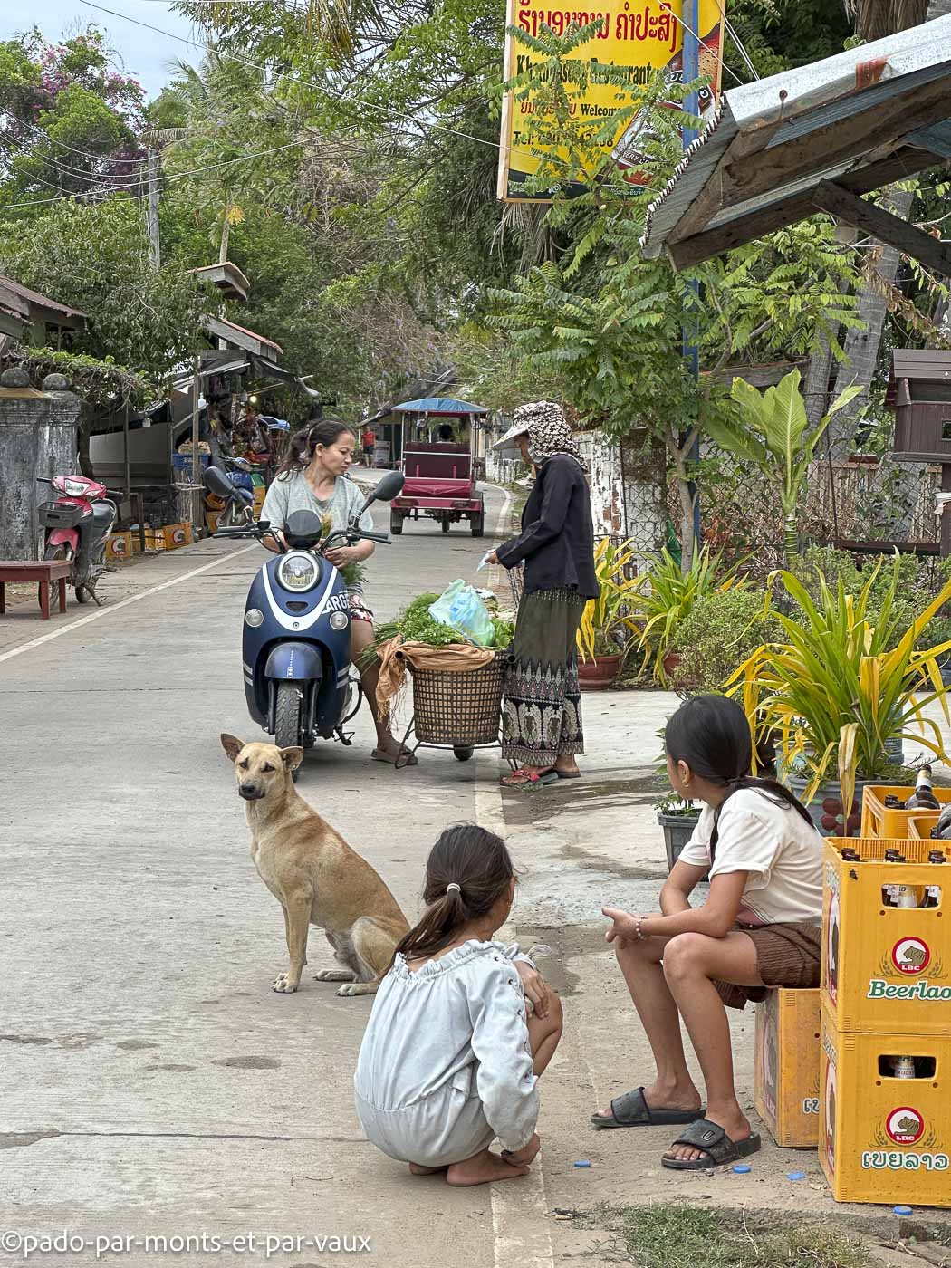 J’ai la chance d’assister à quelques scènes sympathiques : mamies qui discutent devant leurs portes, enfants qui jouent avec des chiens, vendeuses de légumes qui arrivent en barque puis déchargent leurs marchandises sur des petits chariots et partent faire du porte-à-porte ou encore ados qui partent à l’école. Il y a une quantité impressionnante de chiens, chats, poulets et bœufs dans les villages. Tout ce petit monde cavale de tous les côtés, sauf les chats qui somnolent à l’ombre des hamacs.