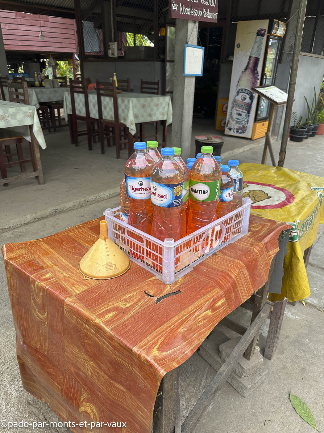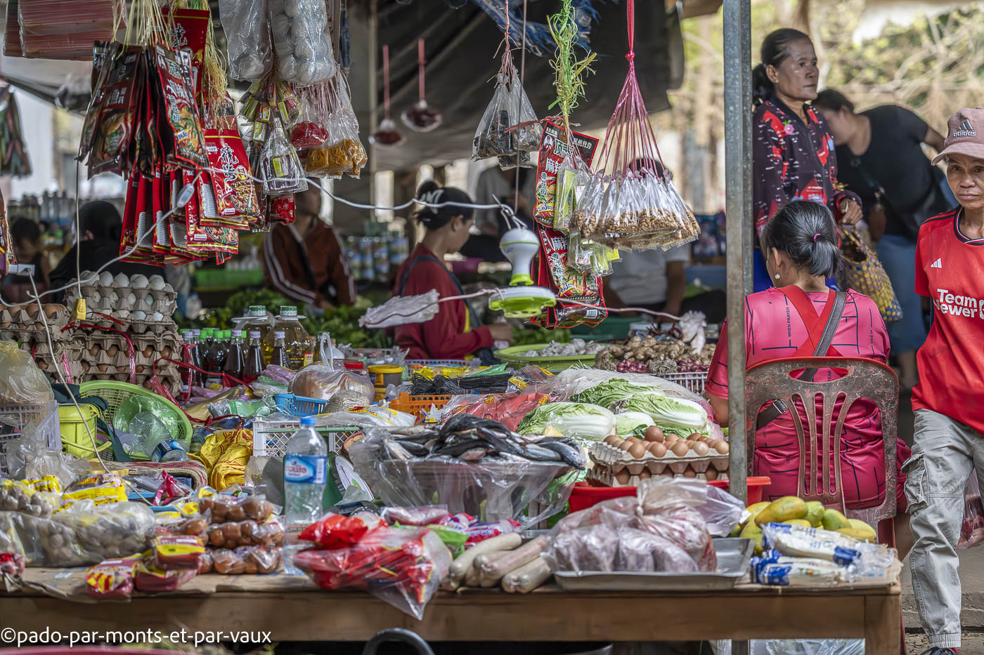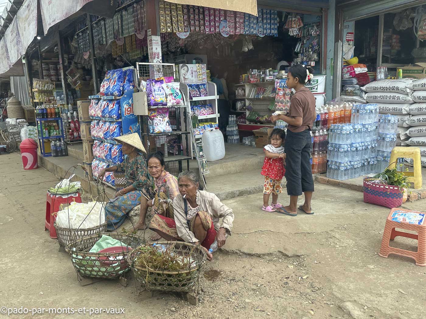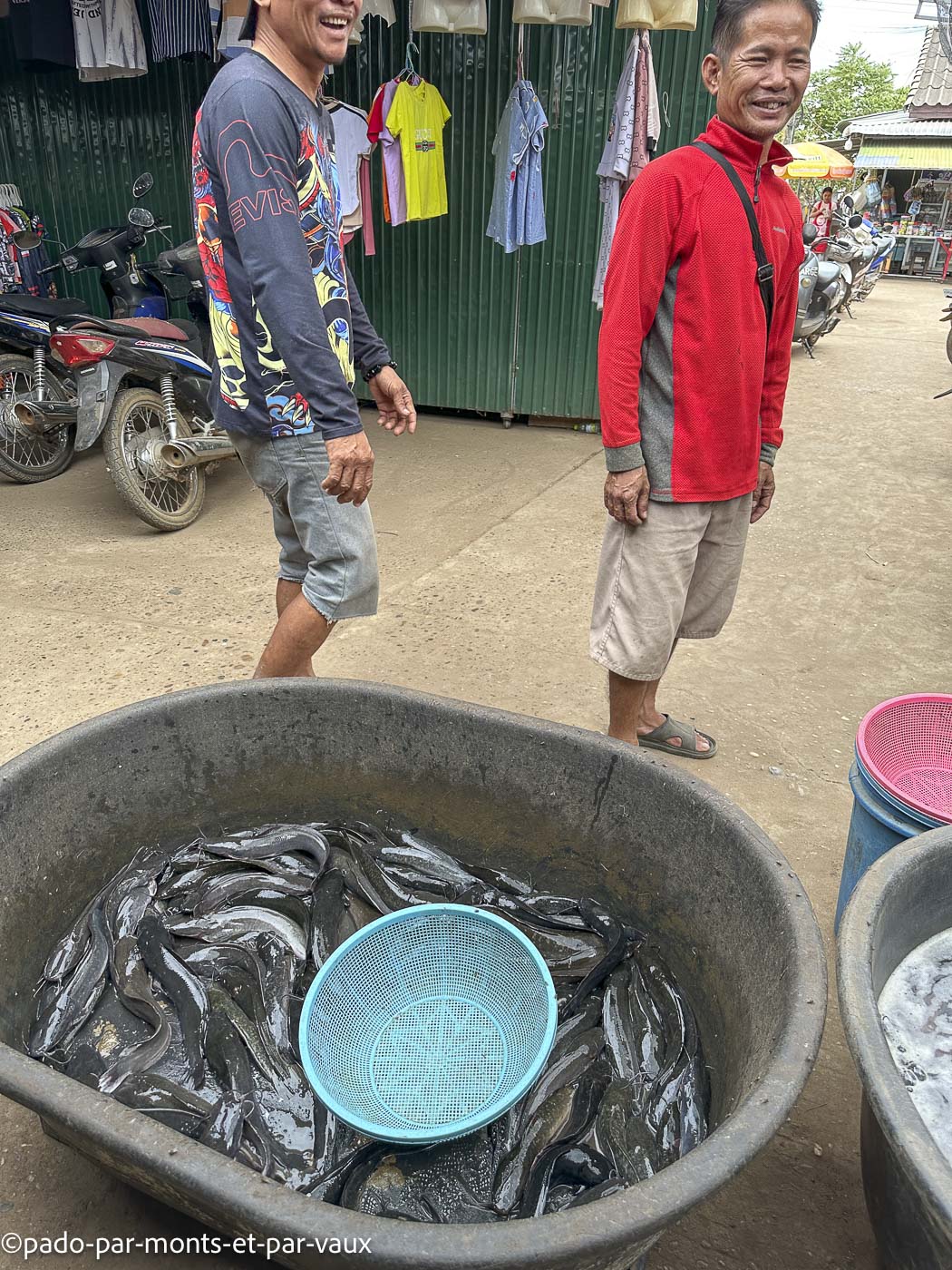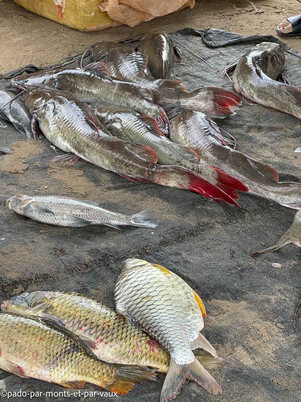 Quelques kilomètres plus loin, nous nous arrêtons dans un marché où notre chauffeur fait quelques courses (ce soir il dort chez lui et il amène à sa belle-mère de quoi préparer le repas). Il a beaucoup de beaux légumes, de nouilles de riz, de poissons vivants dans des baquets.