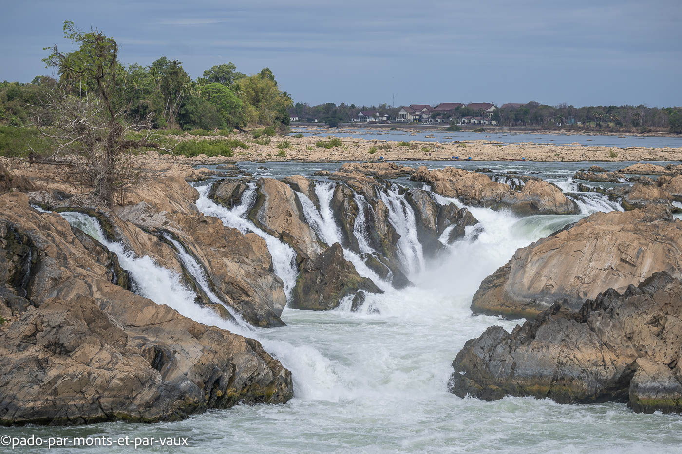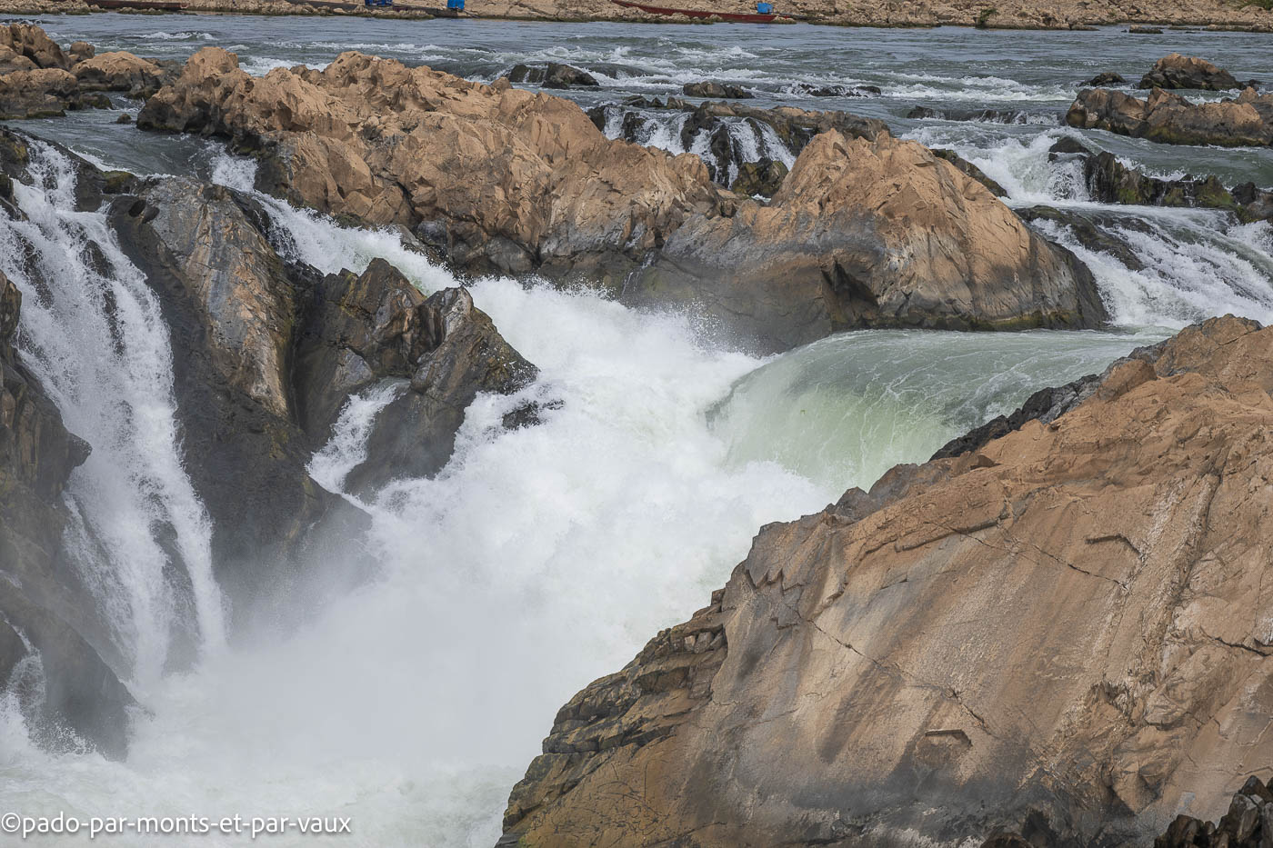 Les chutes de Khone Phapheng s’étalent sur plusieurs kilomètres et constituent un obstacle infranchissable pour la navigation sur le Mékong. A cette période de l’année les eaux sont basses, mais la partie centrale des chutes garde un débit impressionnant. De nombreuses hirondelles tournent au-dessus de l’eau mais elles sont trop loin pour être identifiées.