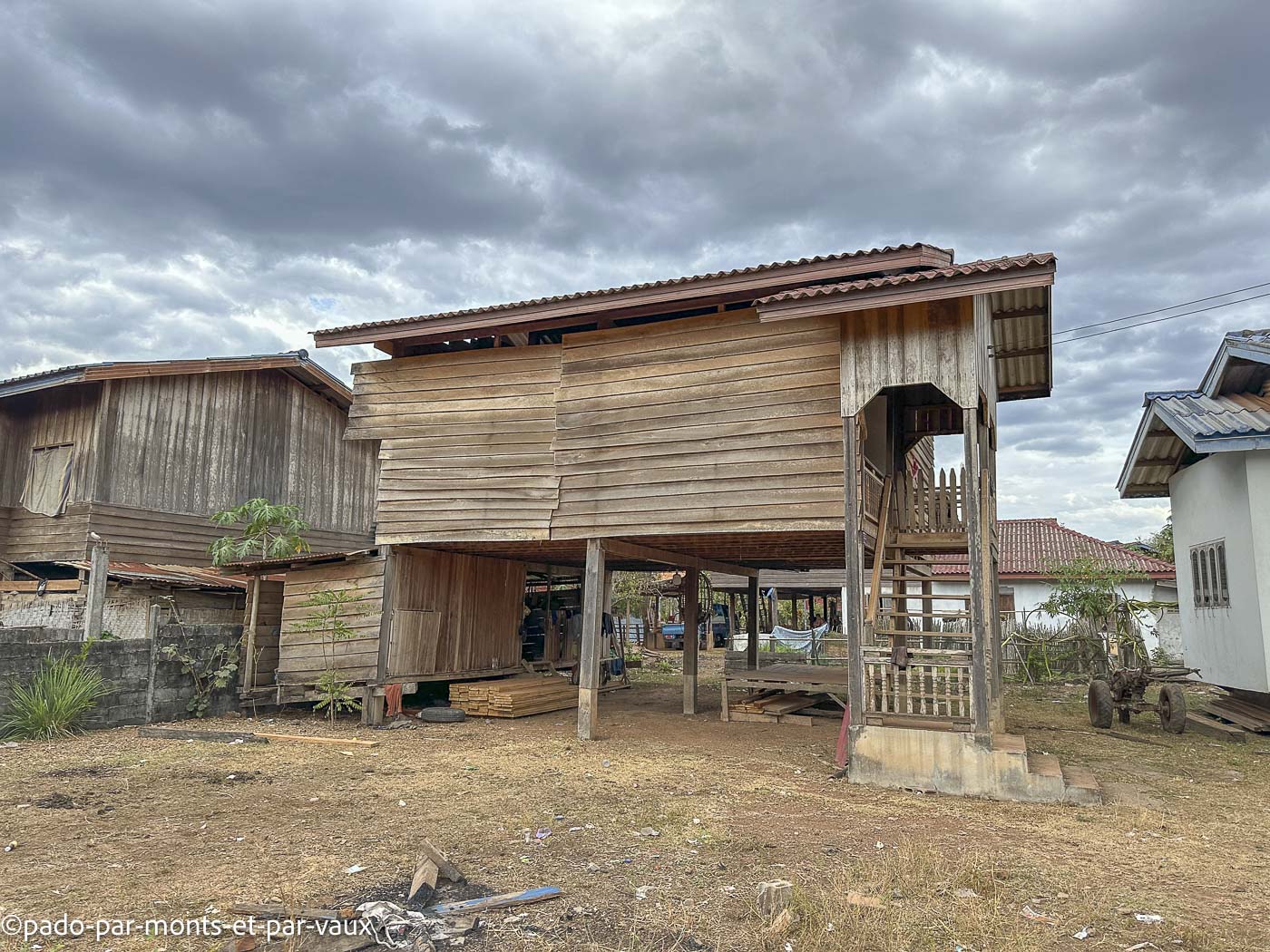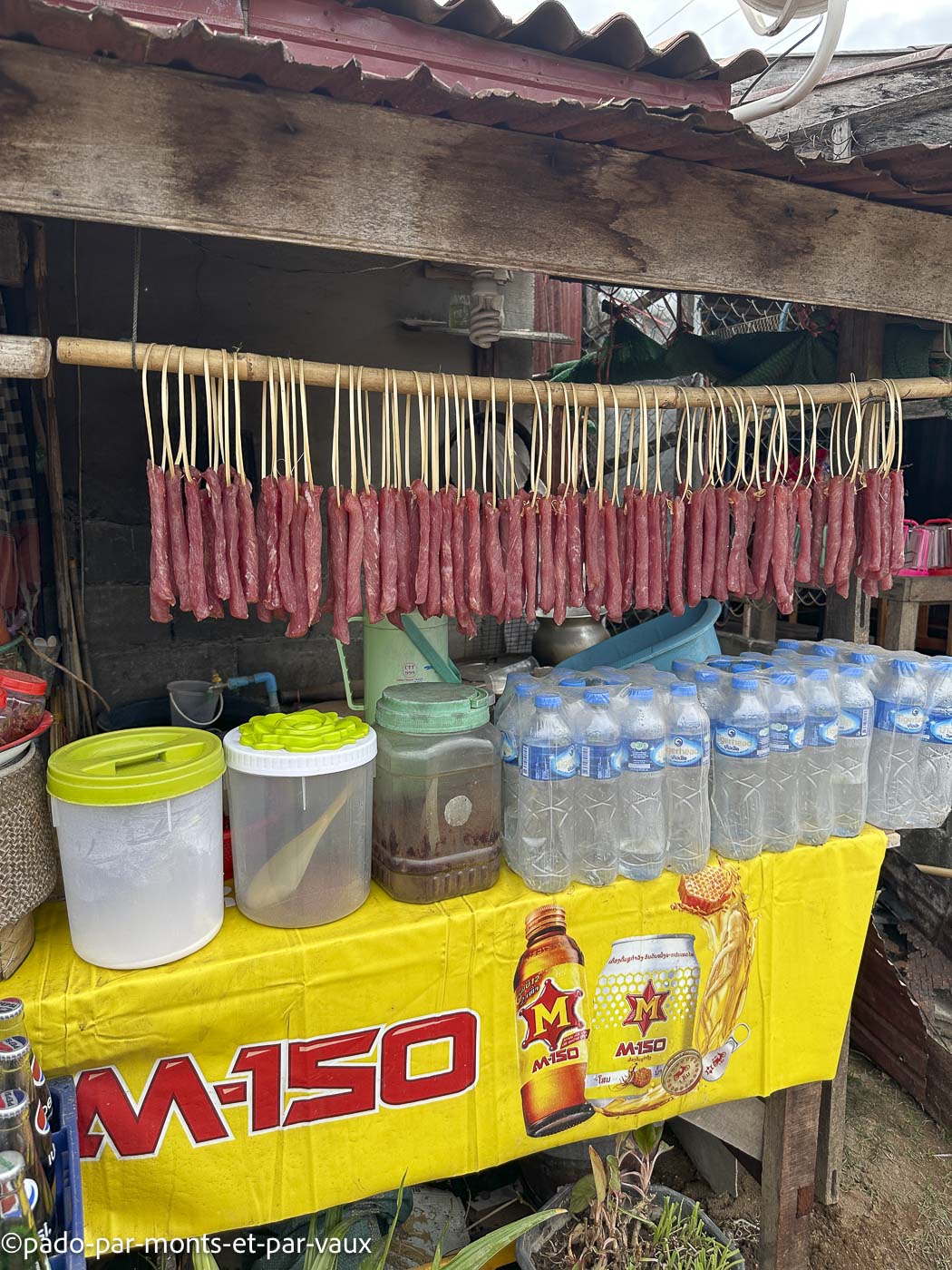 En remontant en voiture, en direction du parc national de Xé Pian qui est notre prochaine étape, nous faisons un nouvel arrêt dans un village où la viande coupée en lamelles sèche au soleil et où, tous les petits commerces de bord de route vendent des brochettes de viande et de banane. Notre chauffeur fait le plein de brochettes.