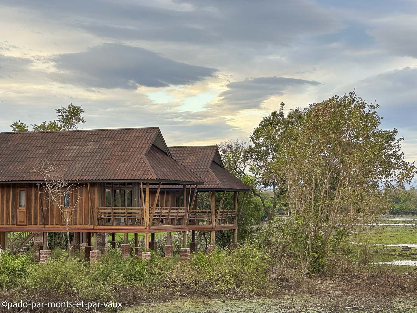 Arrivée au King Fisher Écolodge en début d’après-midi. C’est un joli établissement avec des bungalows sur pilotis installés face à une zone marécageuse qui attire de nombreux oiseaux (hérons, aigrettes, échasses). Tout est en bois et joliment décoré. Déjeuner tardif avec une salade avant d’aller se promener.