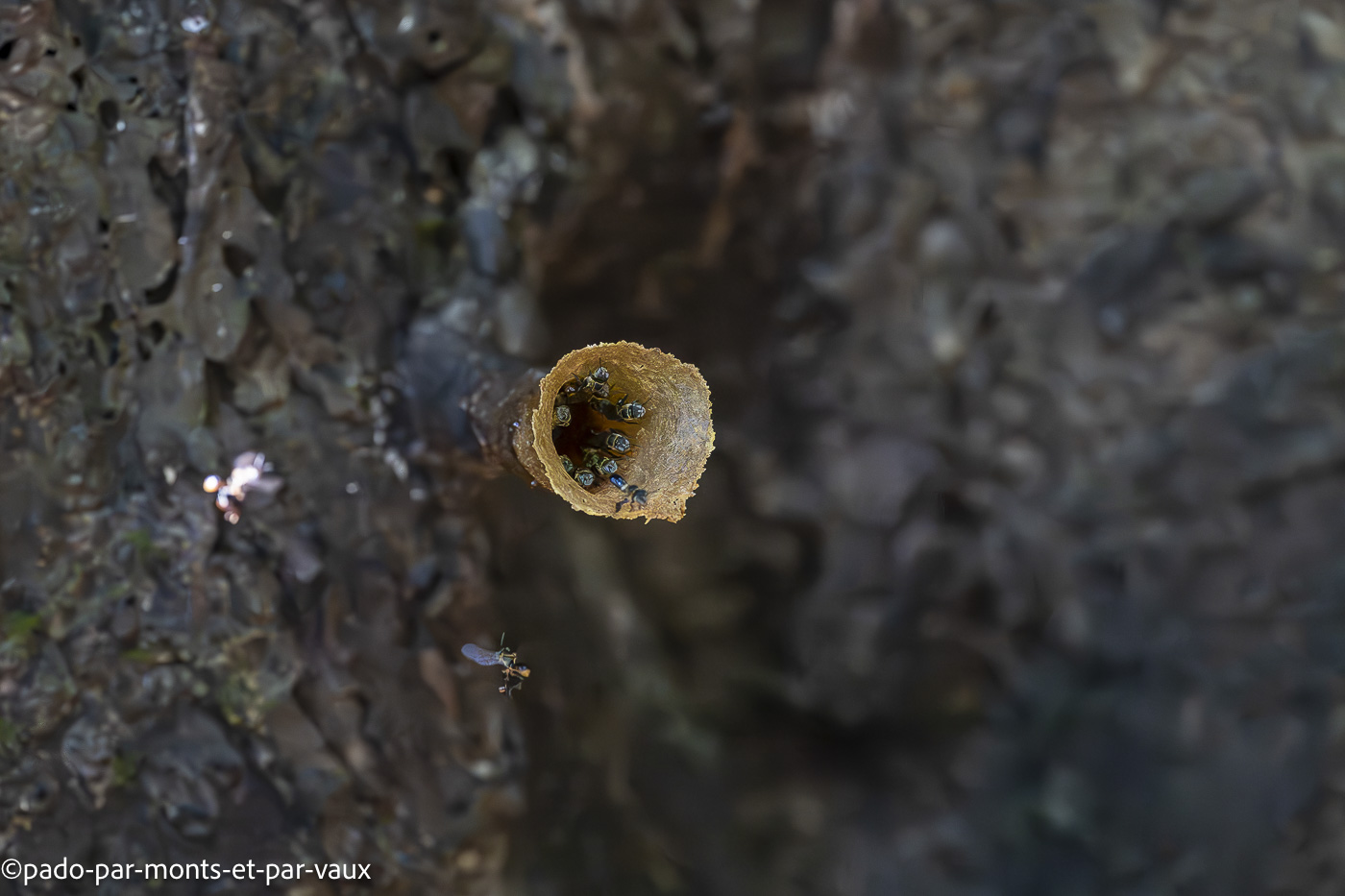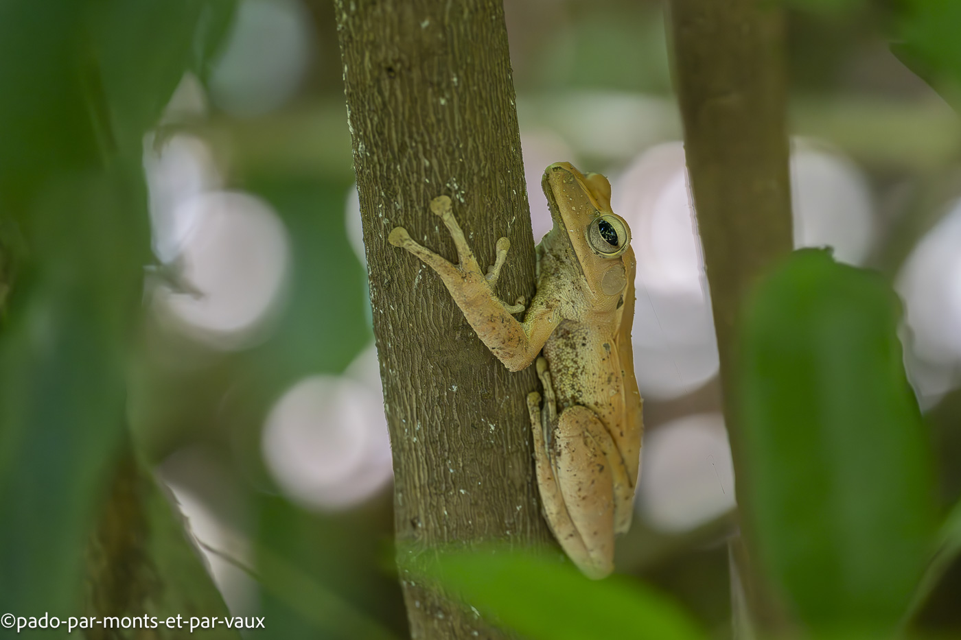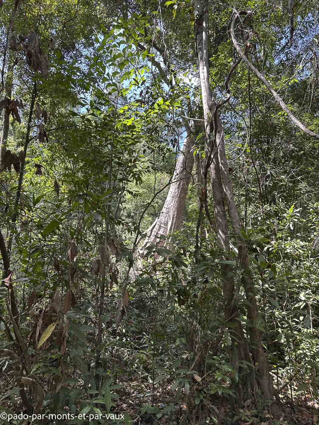Côté animaux, les oiseaux sont bien présents (on les entend chanter à tue-tête) mais ils sont totalement invisibles car installés au sommet des arbres immenses. Les deux seuls que nous ayons réellement vus sont des rapaces (trop loin pour une identification sûre). En revanche, nous avons rencontré des abeilles sauvages dont les ruches sont en forme de cornet ou d’entonnoir, des jolies grenouilles jaunes avec de grands yeux et des sauterelles parfaitement camouflées dans les feuilles mortes. Pique-nique sous les arbres avec du riz au poulet et des fruits (mangues et fruits du dragon).