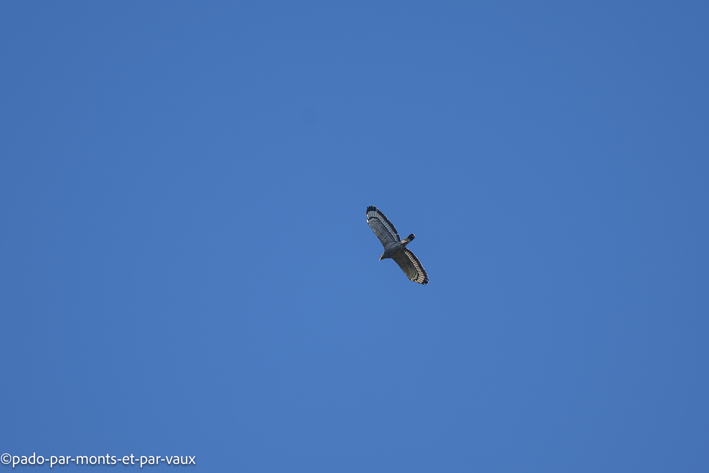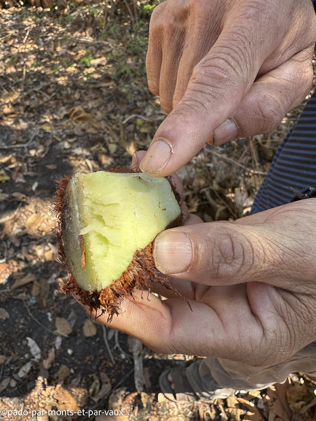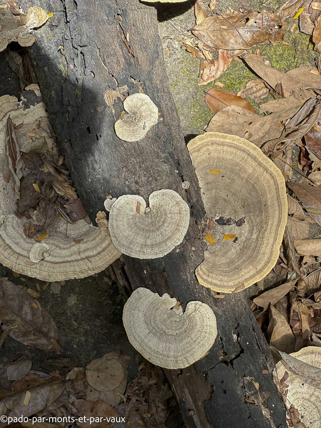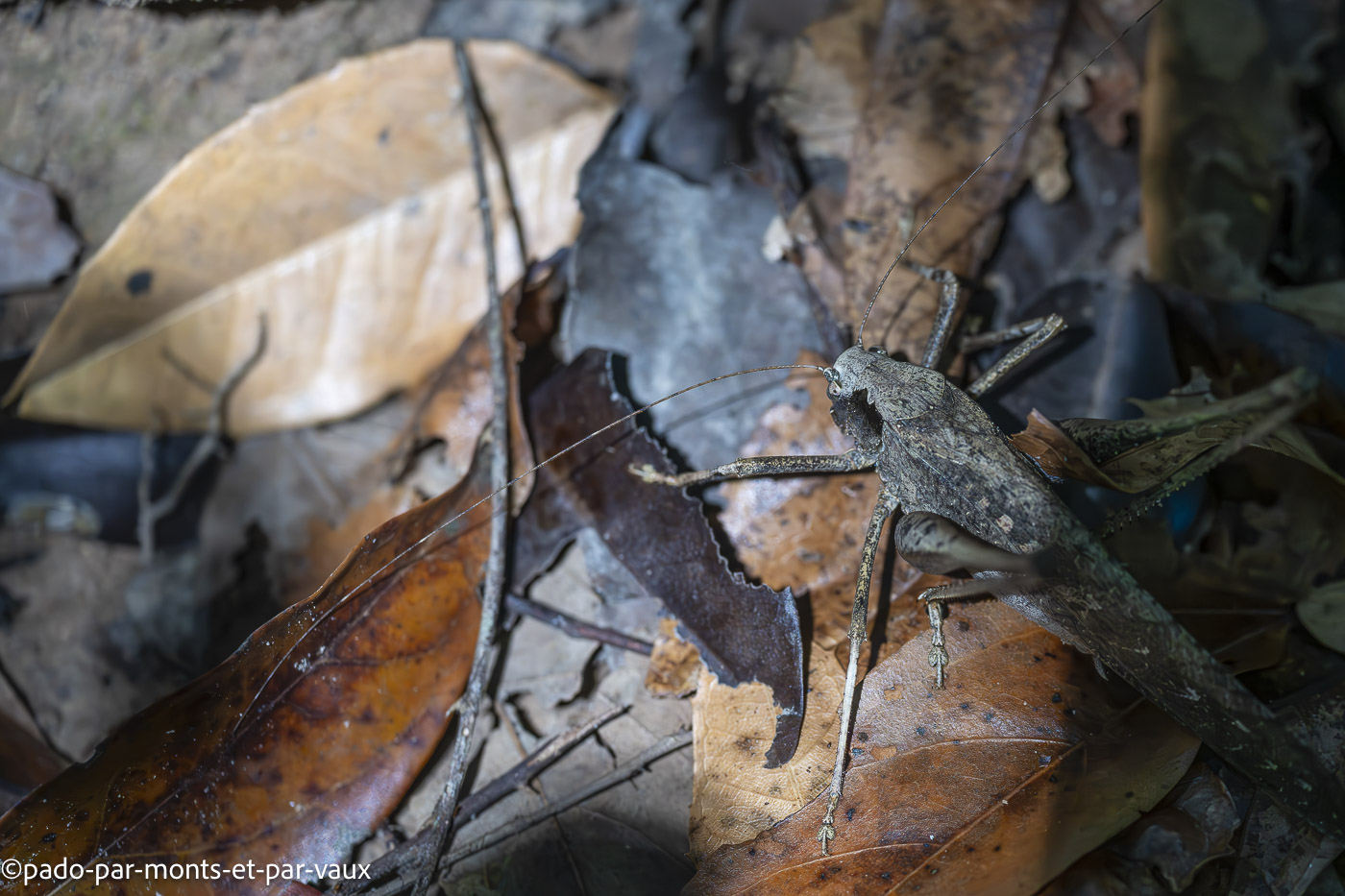 Côté animaux, les oiseaux sont bien présents (on les entend chanter à tue-tête) mais ils sont totalement invisibles car installés au sommet des arbres immenses. Les deux seuls que nous ayons réellement vus sont des rapaces (trop loin pour une identification sûre). En revanche, nous avons rencontré des abeilles sauvages dont les ruches sont en forme de cornet ou d’entonnoir, des jolies grenouilles jaunes avec de grands yeux et des sauterelles parfaitement camouflées dans les feuilles mortes. Pique-nique sous les arbres avec du riz au poulet et des fruits (mangues et fruits du dragon).