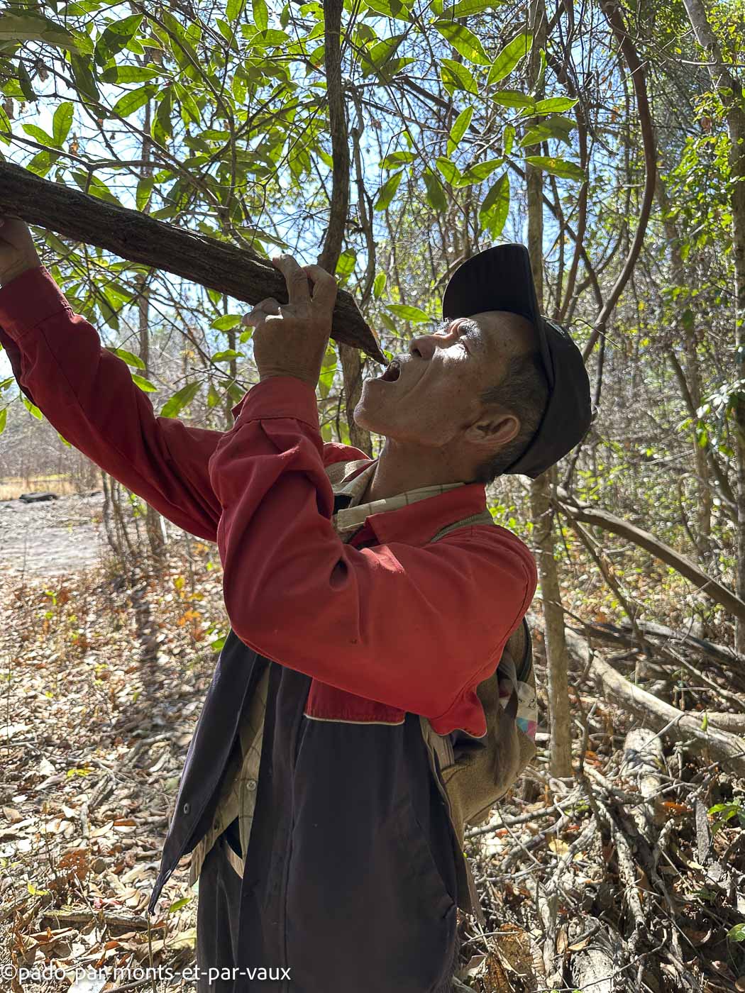 Un gars du lodge qui parle un peu anglais et un guide du village nous accompagnent. C’est une très jolie promenade, heureusement le plus souvent sous le couvert des arbres car en terrain dégagé la température est pénible. Nous nous engageons dans un chemin forestier bien délimité. Le guide nous montre une ombre furtive et nous dit, via son collègue, qu’il s’agit d’un cobra royal. Il y en aurait beaucoup dans le coin. Il nous dit cependant que les serpents sont plutôt peureux et qu’il faut simplement ne pas marcher dessus et éviter de les effrayer. Sur ces bonnes paroles, il sort une machette de son sac et s’enfonce dans le sous-bois au milieu des racines, des troncs d’arbres morts et des tapis de feuilles. Nous lui emboitons le pas, à demi rassurés. Le gros de notre promenade va se dérouler en sous-bois, avec de nombreux arrêts pour nous faire découvrir les plantes et arbres qui servent dans la pharmacopée locale.