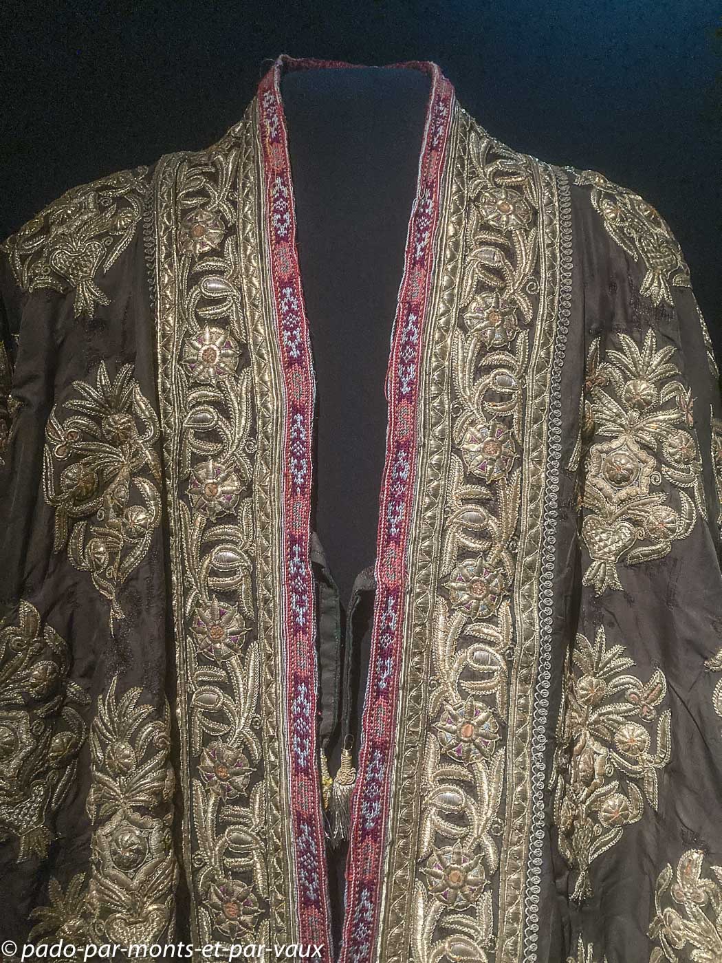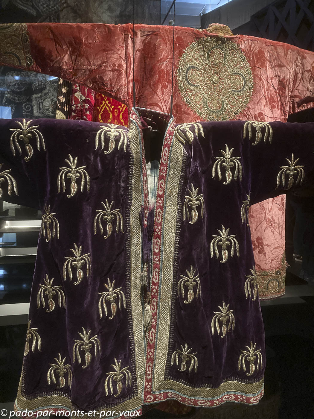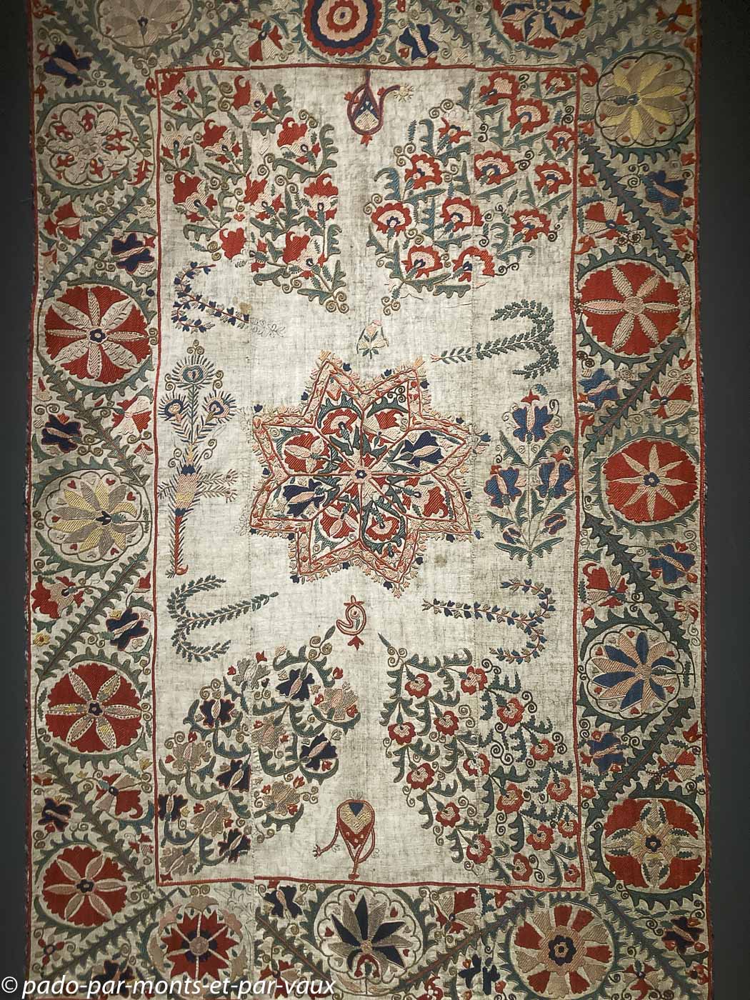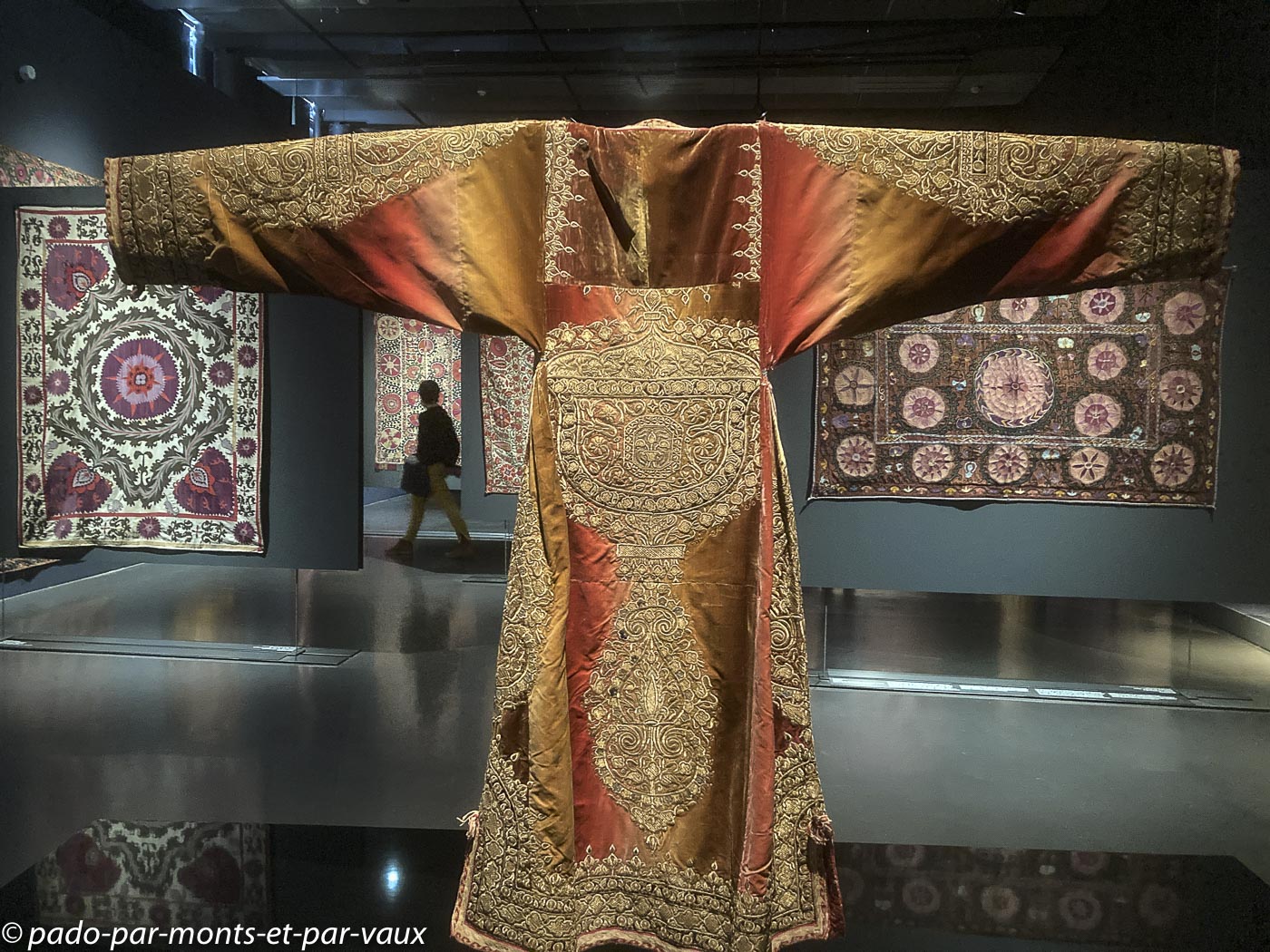 « Le parcours de l’exposition présente près de 300 pièces inédites représentatives des trésors de l’Ouzbékistan. Somptueux manteaux chapans et accessoires brodés d’or de la cour de l’Émir, selles en bois peintes, harnachements de chevaux en argent sertis de turquoises, précieuses tentures brodées suzanis, tapis, ikats de soie, bijoux et costumes de la culture nomade ainsi qu’une quinzaine de peintures orientalistes« .