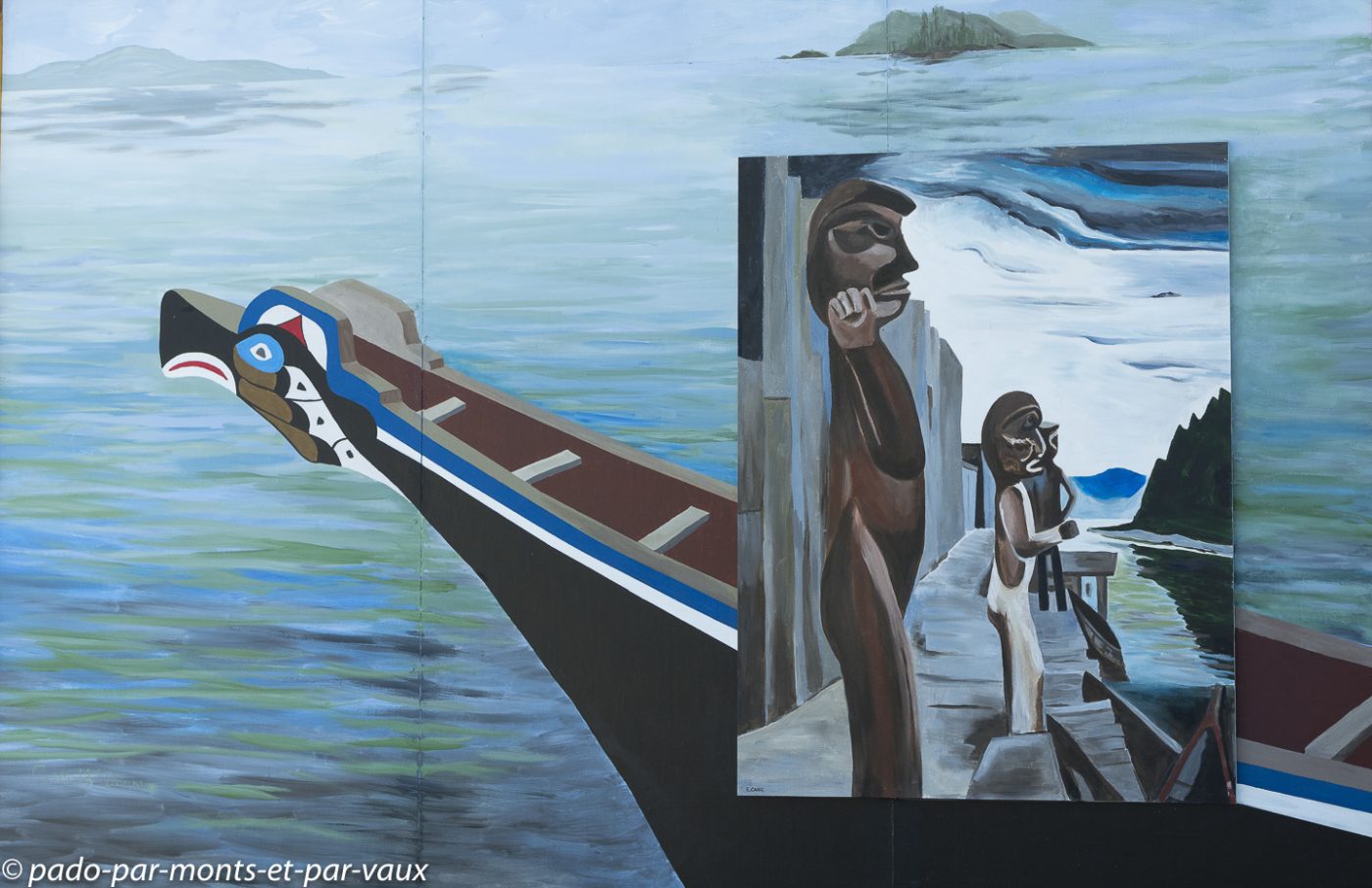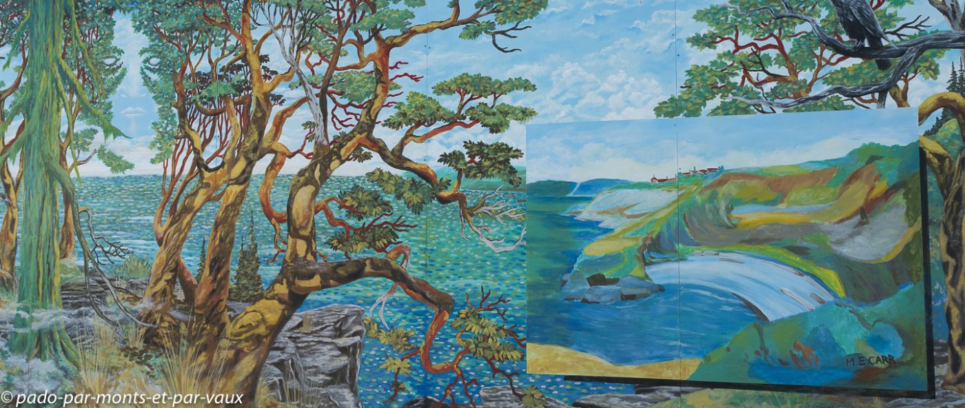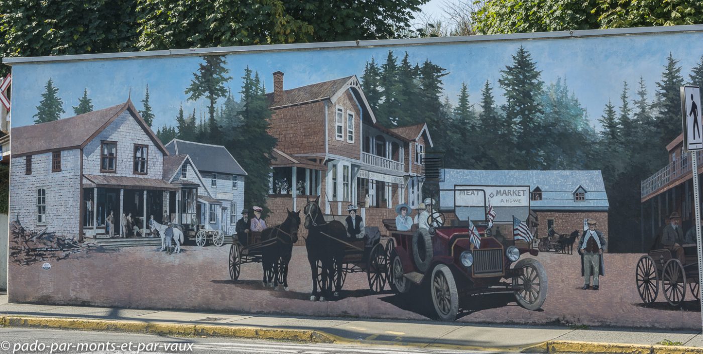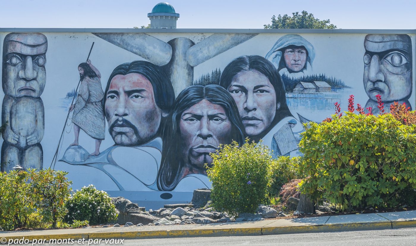 Nous faisons étape à Chemainus, une petite ville qui vivait traditionnellement du commerce du bois et qui, depuis les années 80, a essayé de développer le tourisme en initiant la décoration de ses murs avec des peintures retraçant l’histoire de la ville et de ses habitants. Le résultat est plutôt sympathique même si certaines fresques murales sont un peu kitsch. L’une des peintures les plus réussies représente les portraits de trois indiens entourés de totems. Il y a également toute une série de fresques inspirées des œuvres d’Emily Carr, célèbre peintre originaire de Colombie Britannique. Nous profitons de l’arrêt pour nous acheter une bricole dans une boulangerie et pour faire du lèche-vitrine dans un magasin entièrement dédié aux décorations de Noël. Je finis par craquer pour un ours avec un bonnet rouge qui trouvera sans mal sa place dans notre prochain sapin.