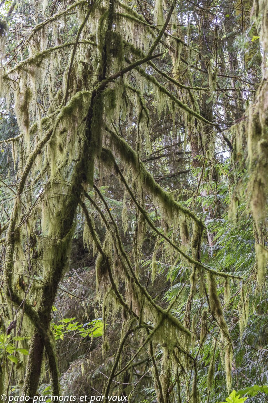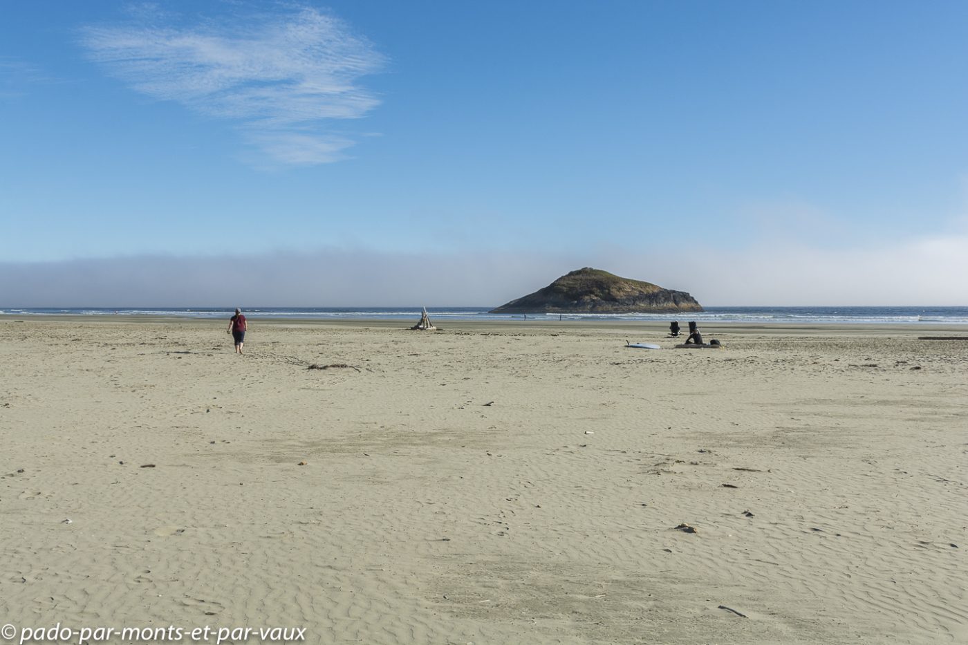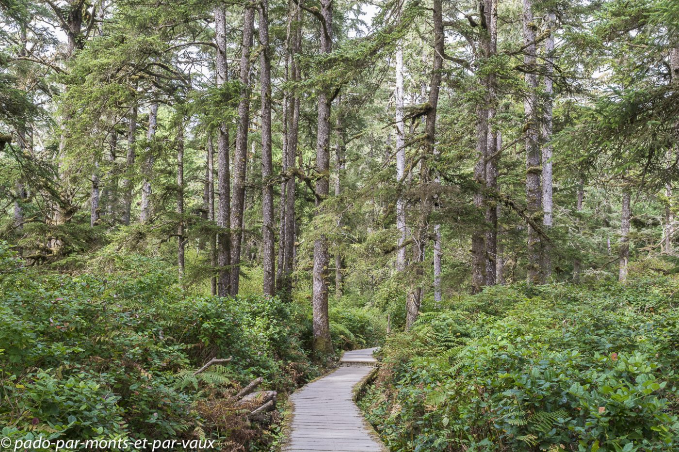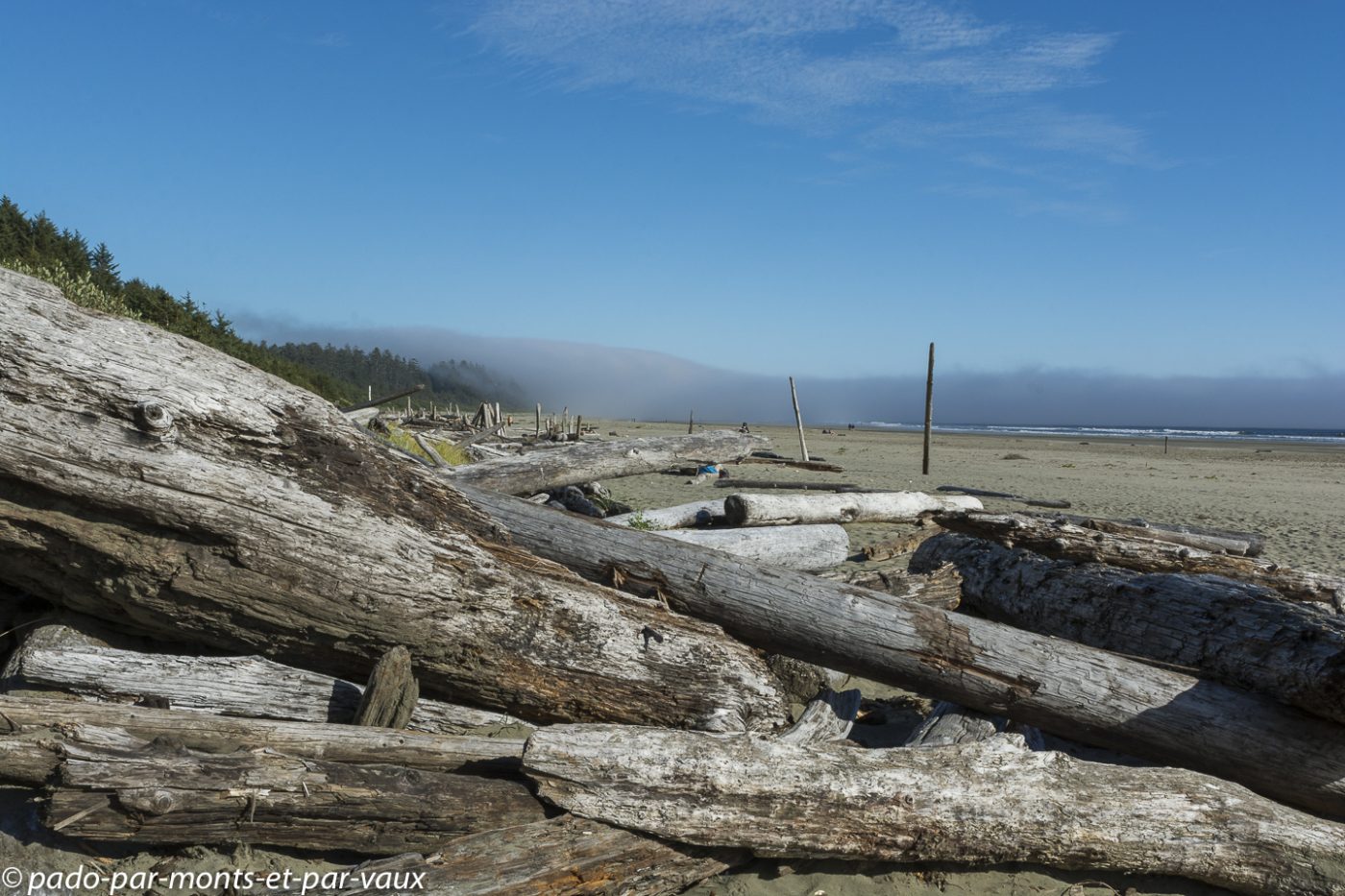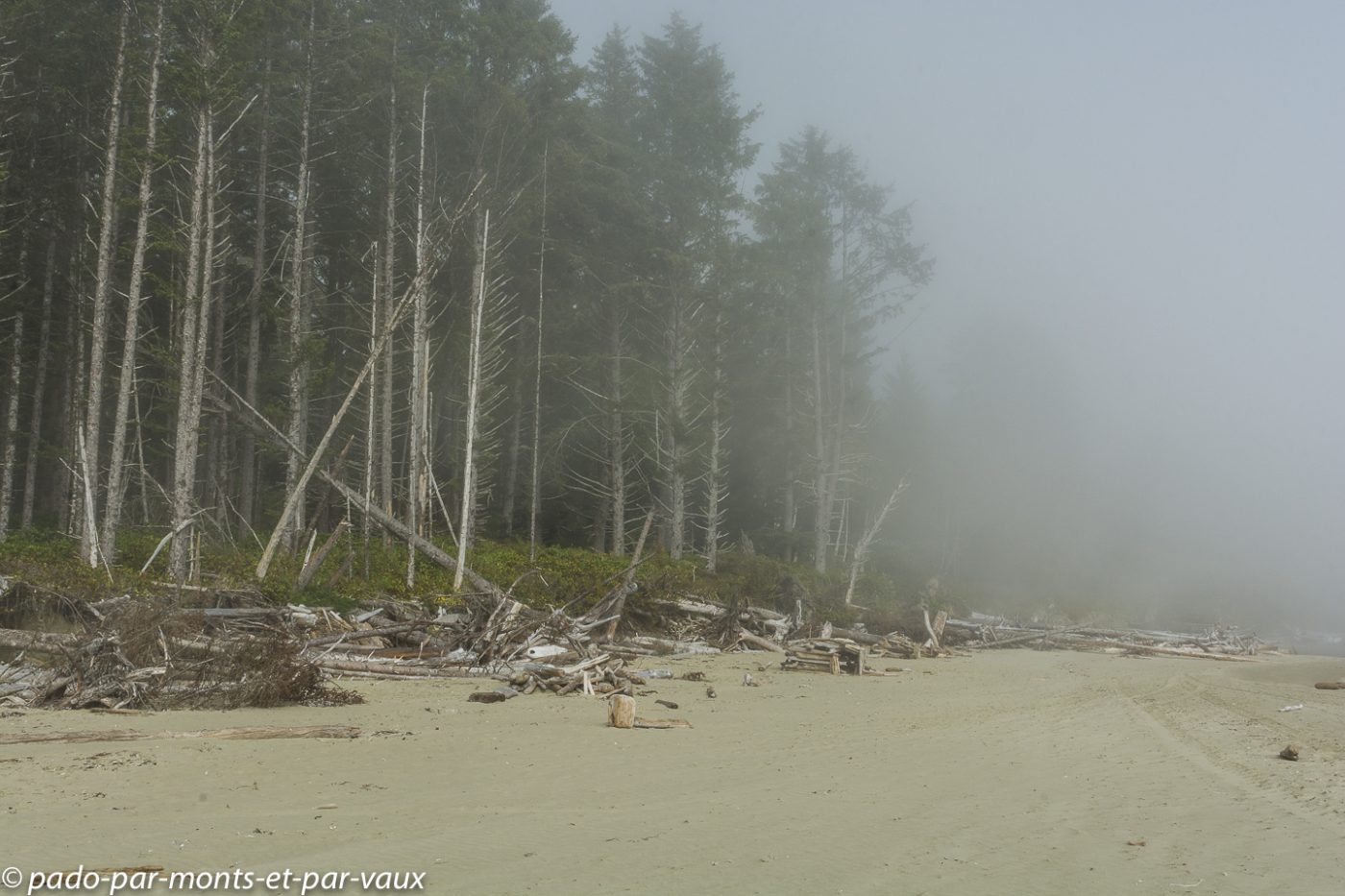 A l’entrée du parc national Pacific Rim nous achetons notre pass pour les parcs nationaux. Le ticket est nominatif et valable pendant une année pour tous les parcs nationaux du Canada. Cela va nous éviter d’acheter des tickets quotidiens et côté budget le pass revient moins cher car nous avons prévu de visiter plusieurs parcs. Nous glanons quelques informations sur les ours auprès des rangers qui insistent sur les précautions à prendre avec la nourriture et essaient de responsabiliser les promeneurs : il est formellement interdit de nourrir les ours. Ceux qui goûtent de la nourriture humaine sont systématiquement tués car ils associent la nourriture à l’homme et deviennent dangereux! Petit arrêt à Combers beach. Une courte et jolie promenade à travers la forêt pluviale aux superbes arbres moussus, nous amène jusqu’à la plage : on entend la mer mais on ne la voit pas à cause du brouillard !