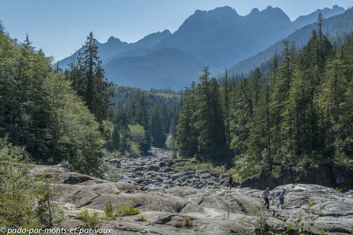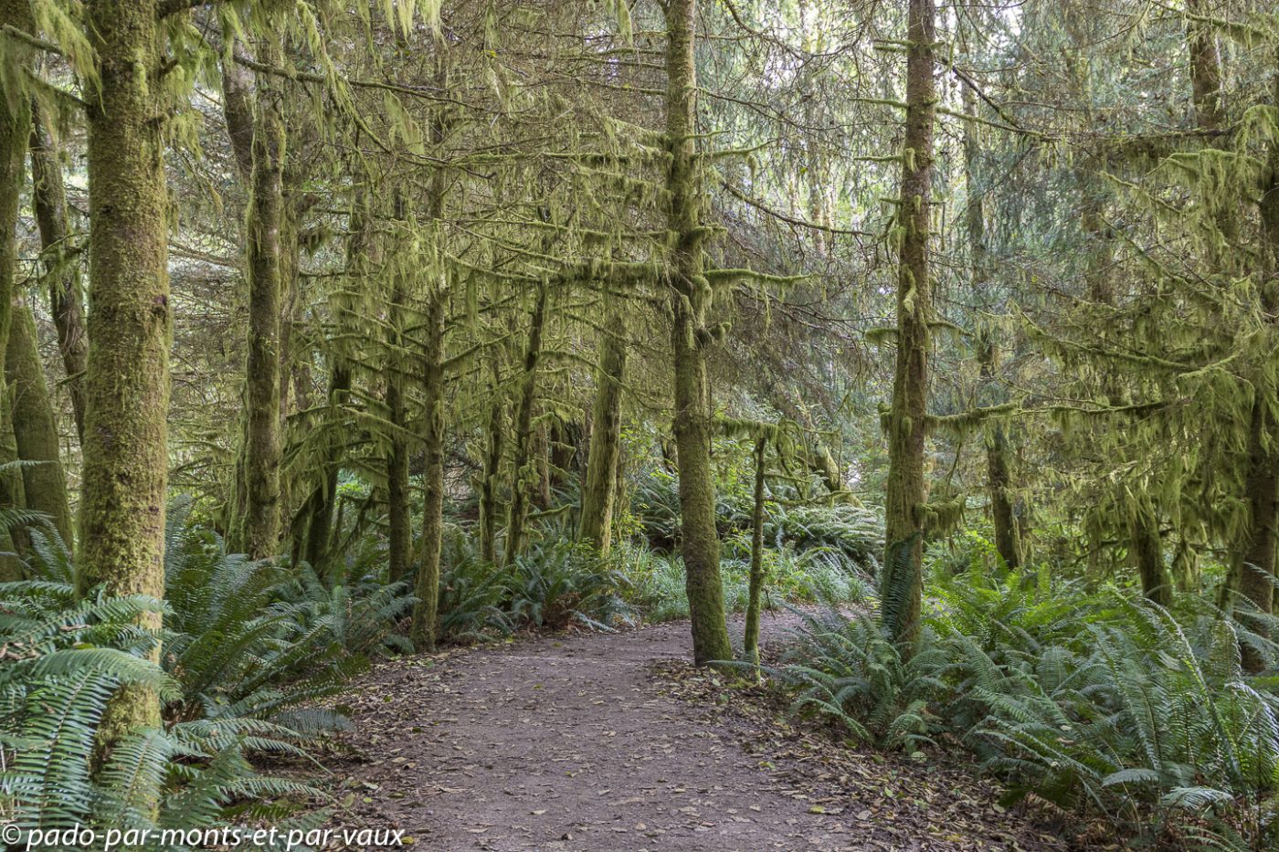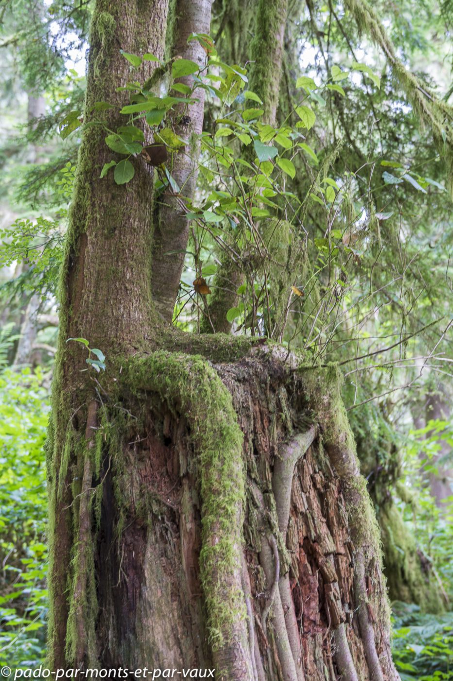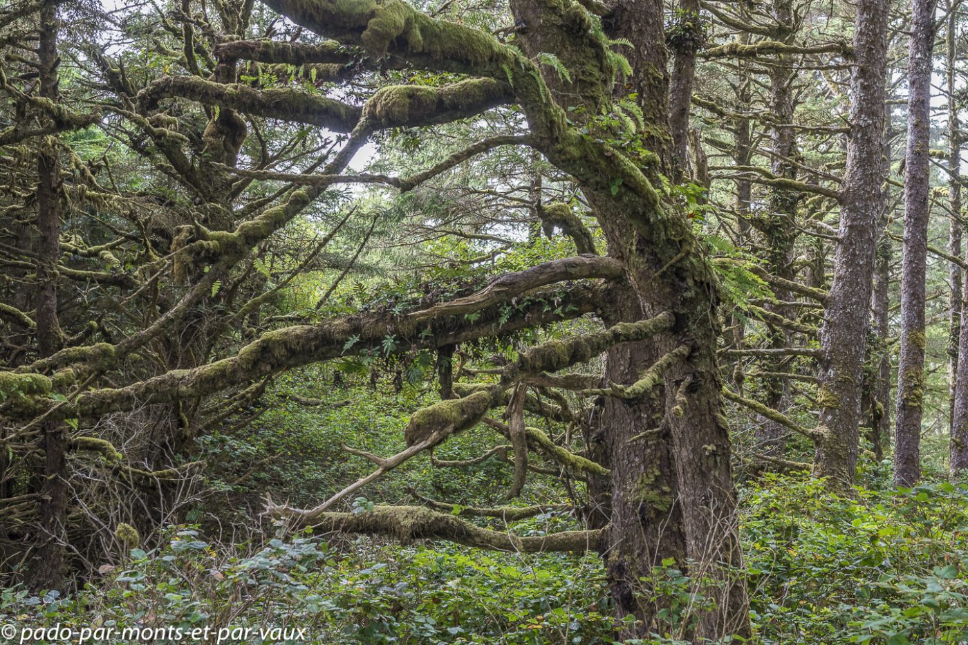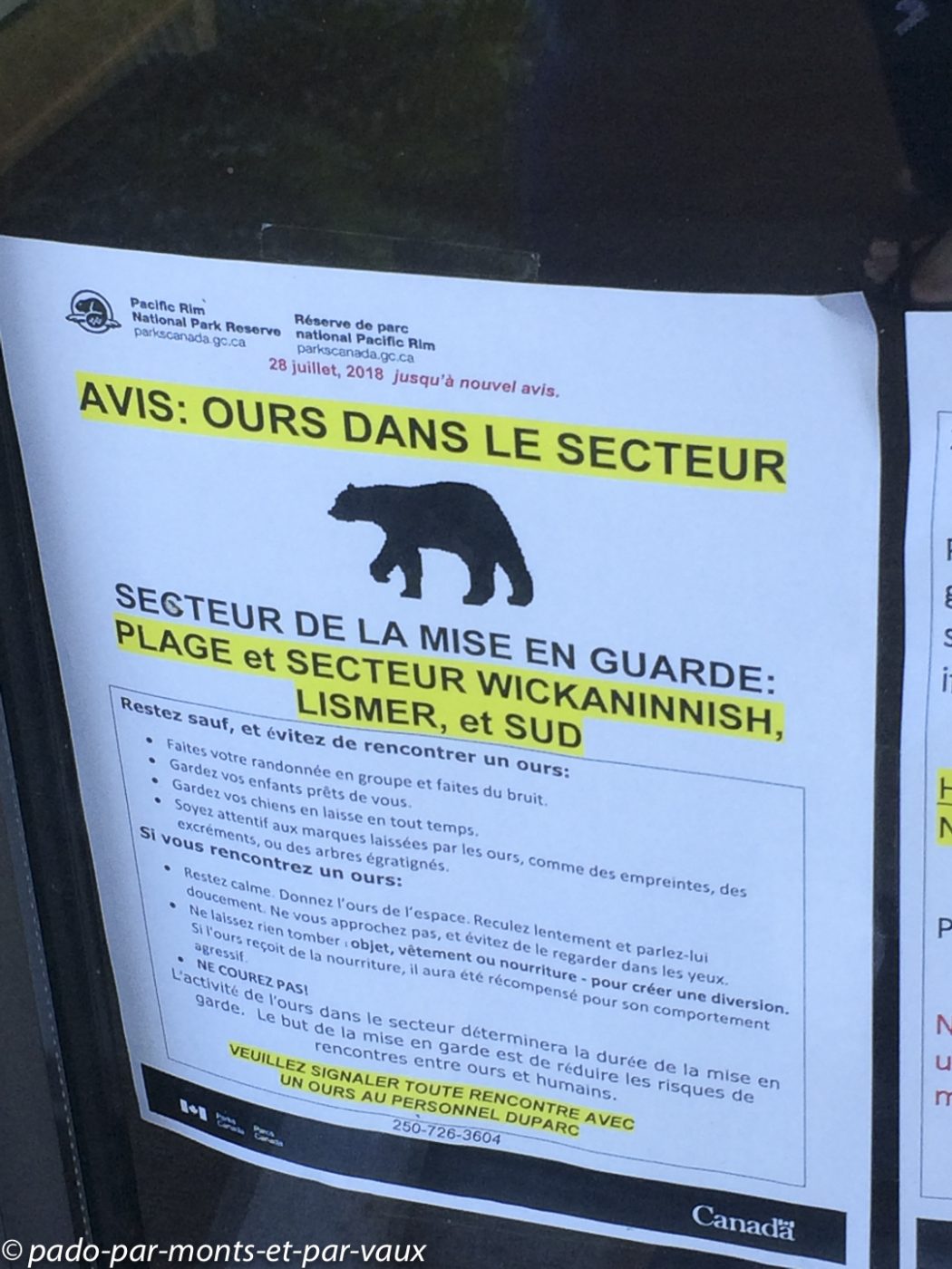 A l’entrée du parc national Pacific Rim nous achetons notre pass pour les parcs nationaux. Le ticket est nominatif et valable pendant une année pour tous les parcs nationaux du Canada. Cela va nous éviter d’acheter des tickets quotidiens et côté budget le pass revient moins cher car nous avons prévu de visiter plusieurs parcs. Nous glanons quelques informations sur les ours auprès des rangers qui insistent sur les précautions à prendre avec la nourriture et essaient de responsabiliser les promeneurs : il est formellement interdit de nourrir les ours. Ceux qui goûtent de la nourriture humaine sont systématiquement tués car ils associent la nourriture à l’homme et deviennent dangereux! Petit arrêt à Combers beach. Une courte et jolie promenade à travers la forêt pluviale aux superbes arbres moussus, nous amène jusqu’à la plage : on entend la mer mais on ne la voit pas à cause du brouillard !