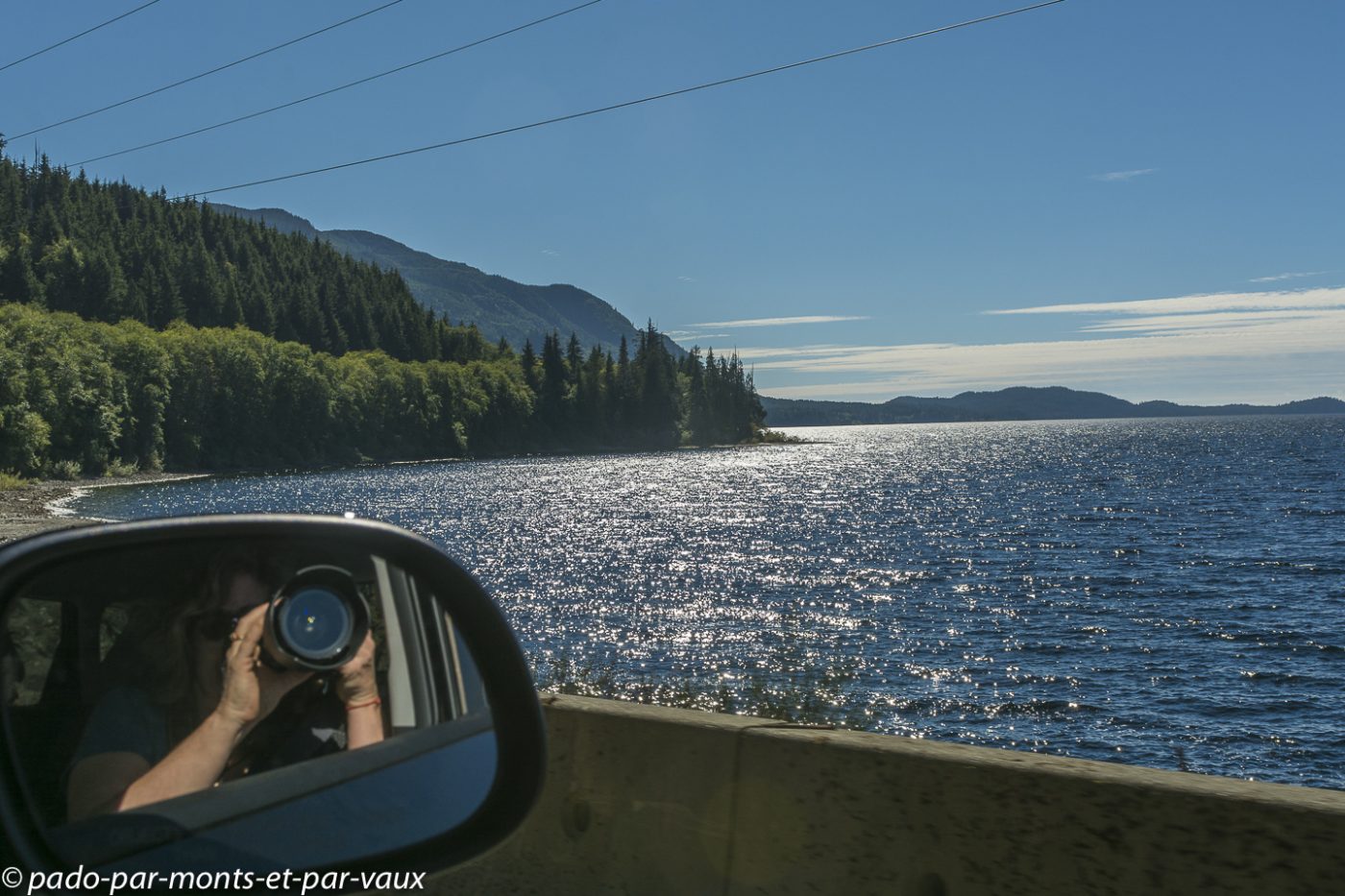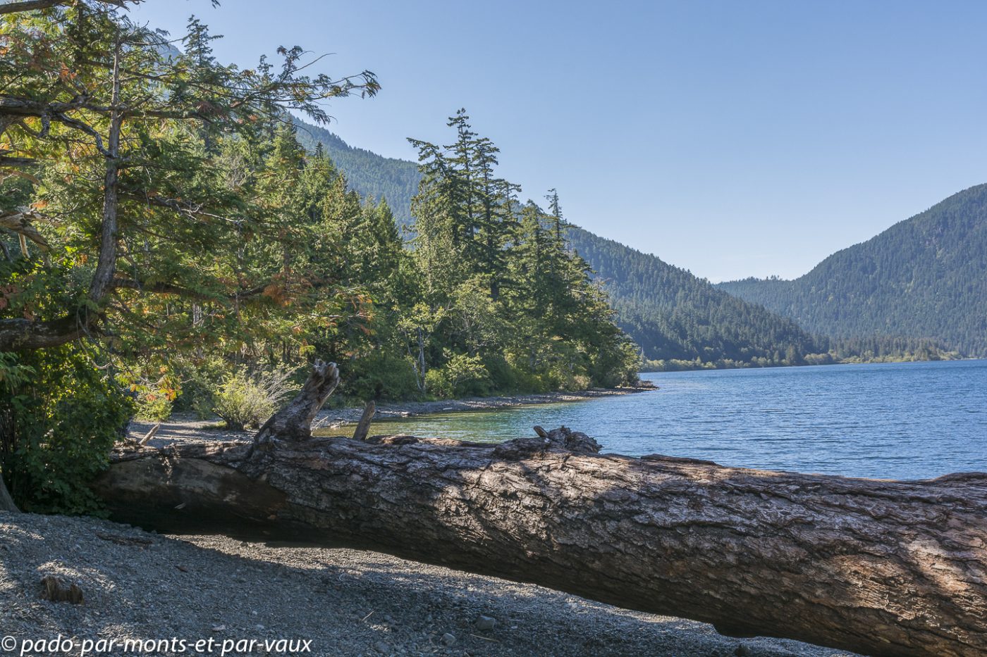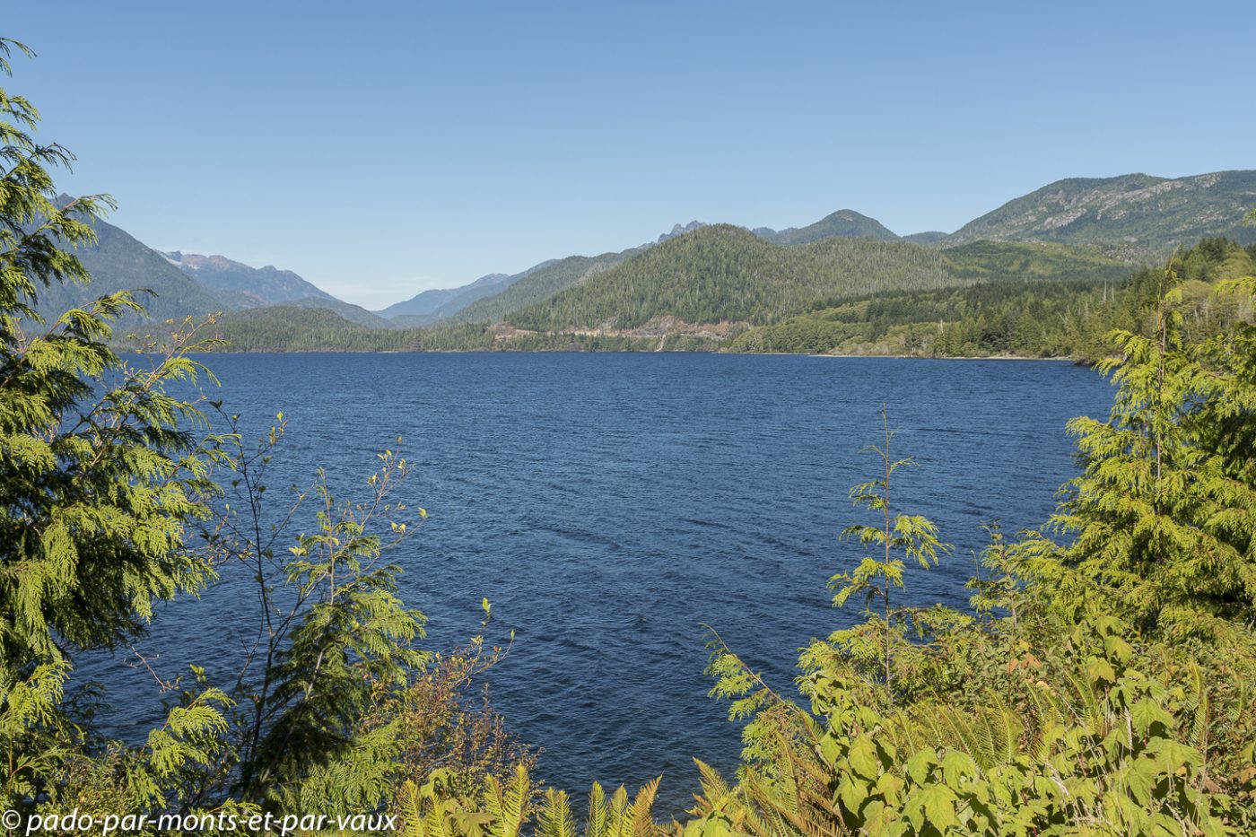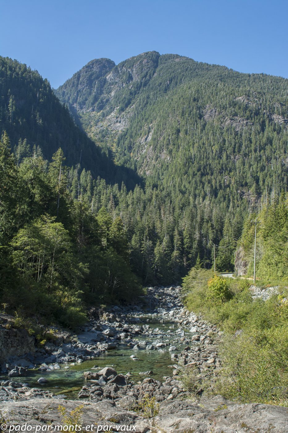 Quelques kilomètres après Nanaimo, au niveau de Nanoose bay, nous prenons une route vers Port Alberni, l’intérieur de l’île et plus loin le Pacifique. La circulation, qui jusqu’à présent était assez dense, se raréfie, la route devient particulièrement jolie après Port Alberni, nous traversons des forêts, longeons des lacs et des rivières. La chaussée est en mauvais état et tout un tronçon de route est en travaux (nous arrivons à passer car dans l’après-midi il y a un système de circulation alternée, mais le soir la route est complètement fermée à la circulation).