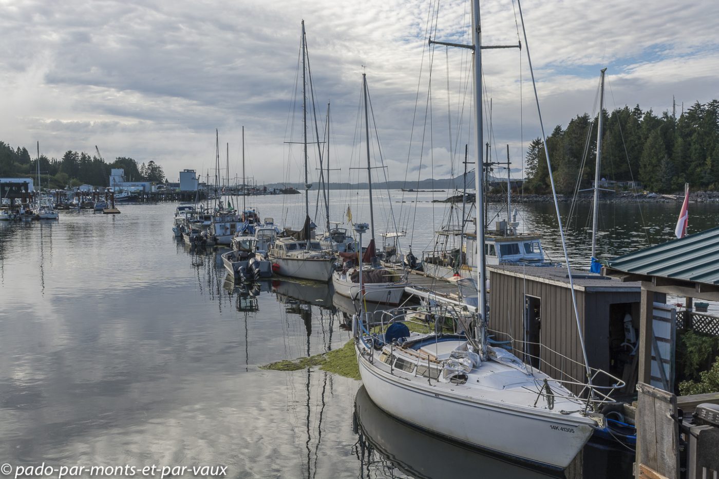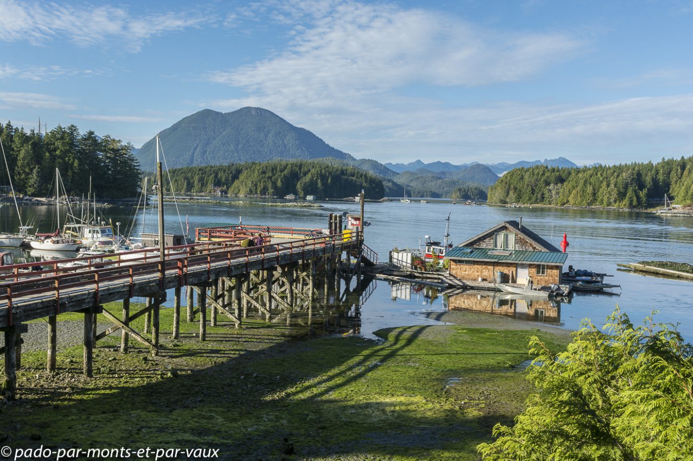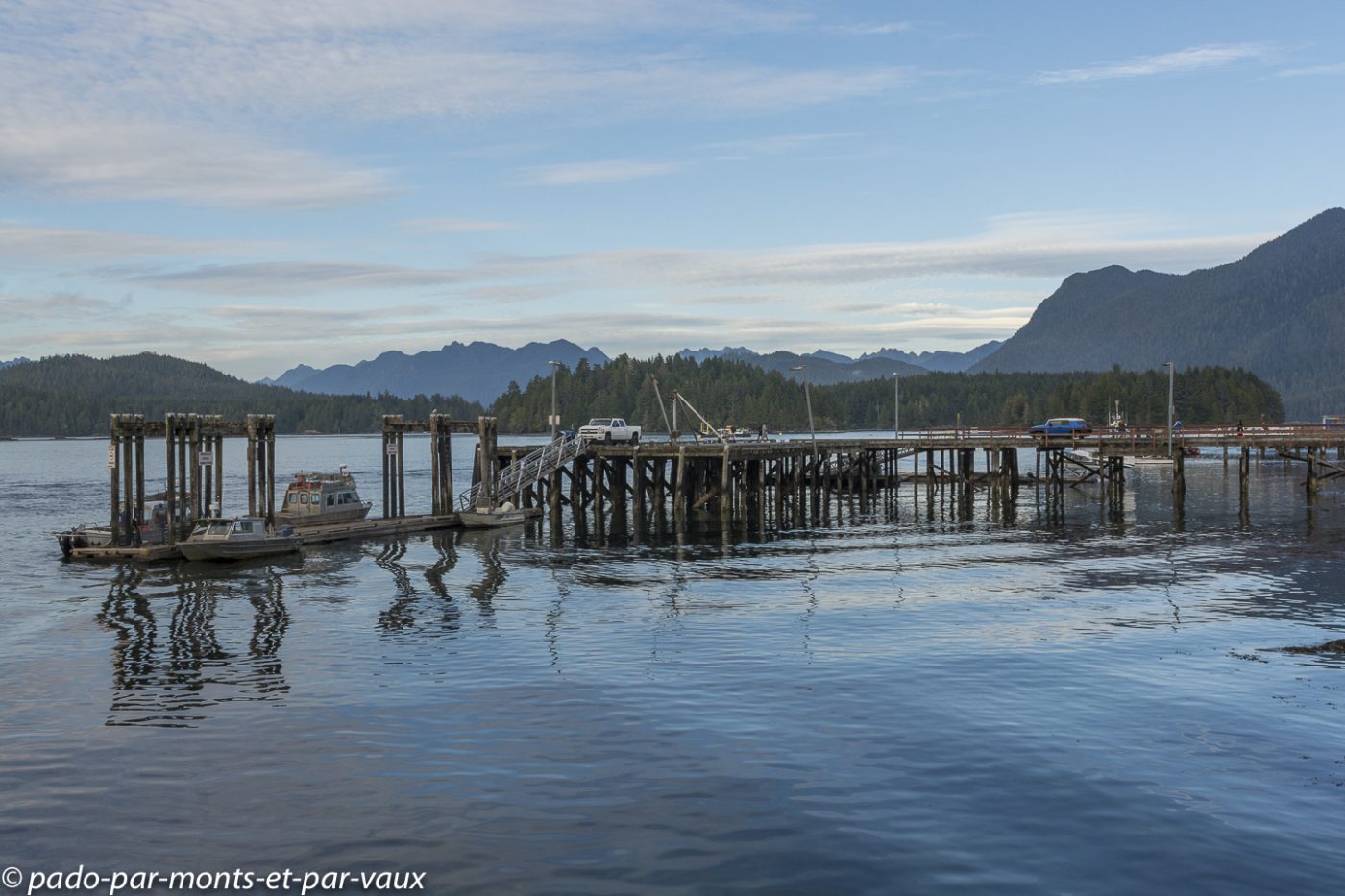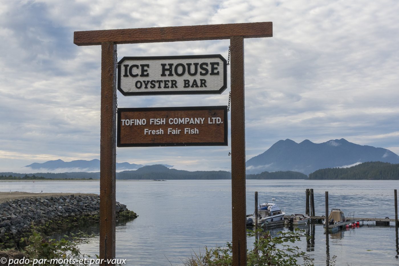 Petit tour « en ville ». Bien que réputé pour accueillir de nombreux surfeurs en été, Tofino est avant tout un petit village de pêcheurs avec quelques maisons alignées le long de la route et une usine pour conditionner le poisson. C’est assez charmant car le village donne sur un ensemble de petites îles recouvertes de forêt.
