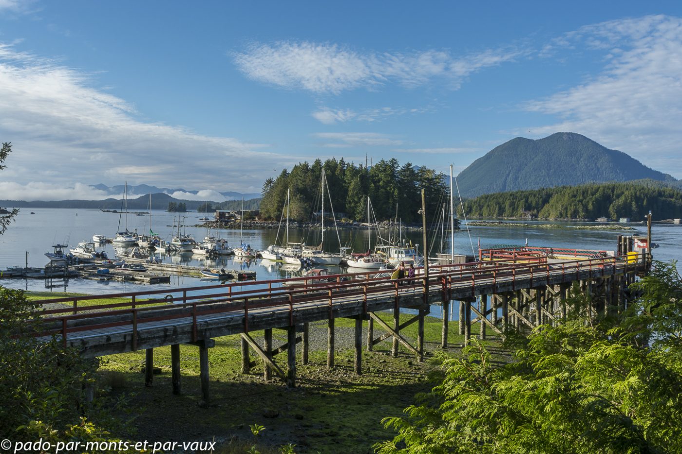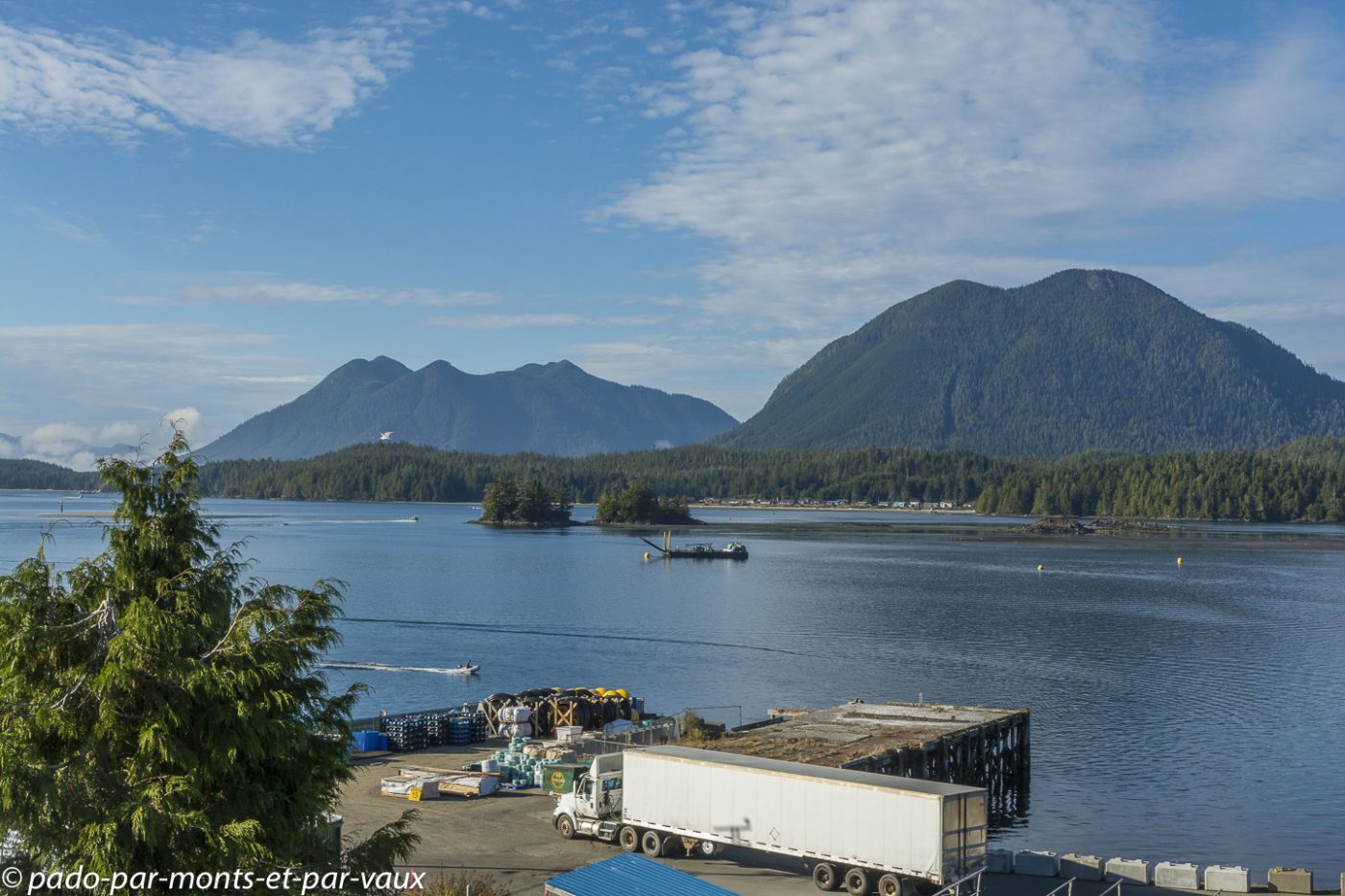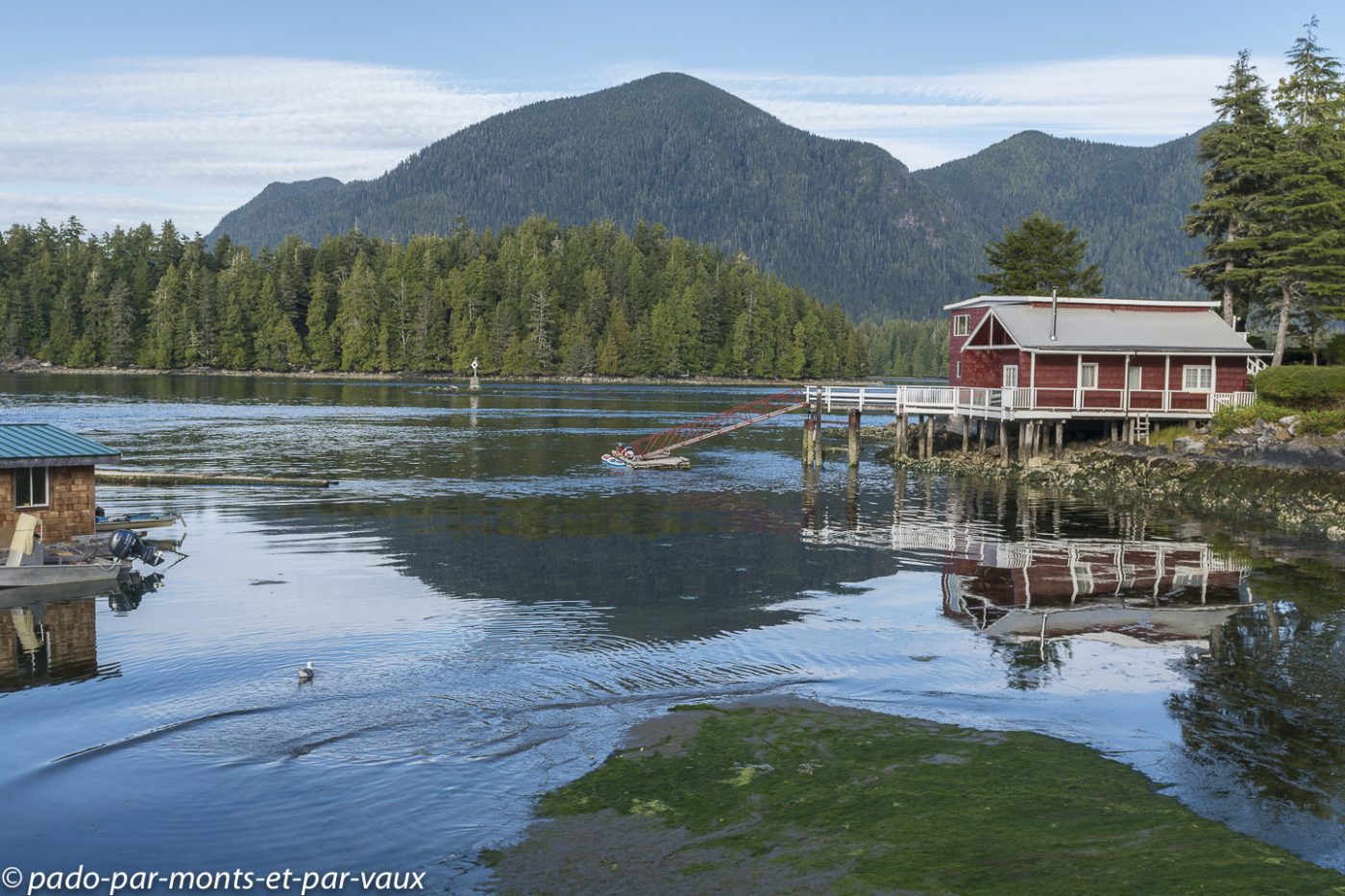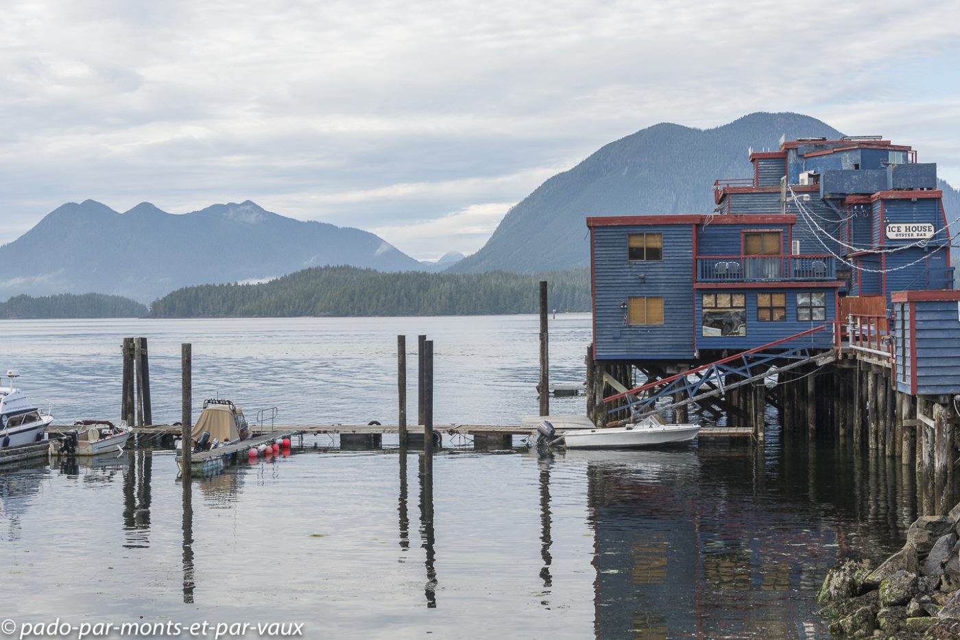 Petit tour « en ville ». Bien que réputé pour accueillir de nombreux surfeurs en été, Tofino est avant tout un petit village de pêcheurs avec quelques maisons alignées le long de la route et une usine pour conditionner le poisson. C’est assez charmant car le village donne sur un ensemble de petites îles recouvertes de forêt.