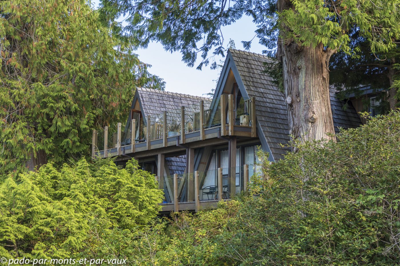Arrivés à Tofino, nous allons directement jusqu’au Shore Line. Il n’y a personne à l’accueil qui ferme à 17 heures, mais nous trouvons un petit mot à notre attention avec les indications permettant de nous installer. Notre hébergement est une sorte de « chalet » avec un petit salon donnant sur la mer, une kitchenette, une chambre et une salle de bains. Très jolie vue depuis notre canapé.