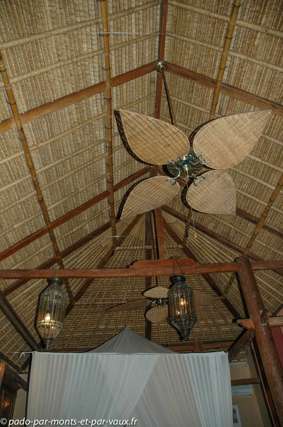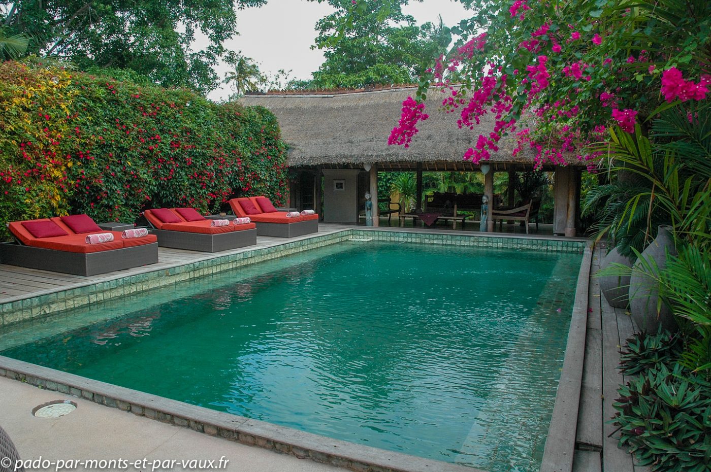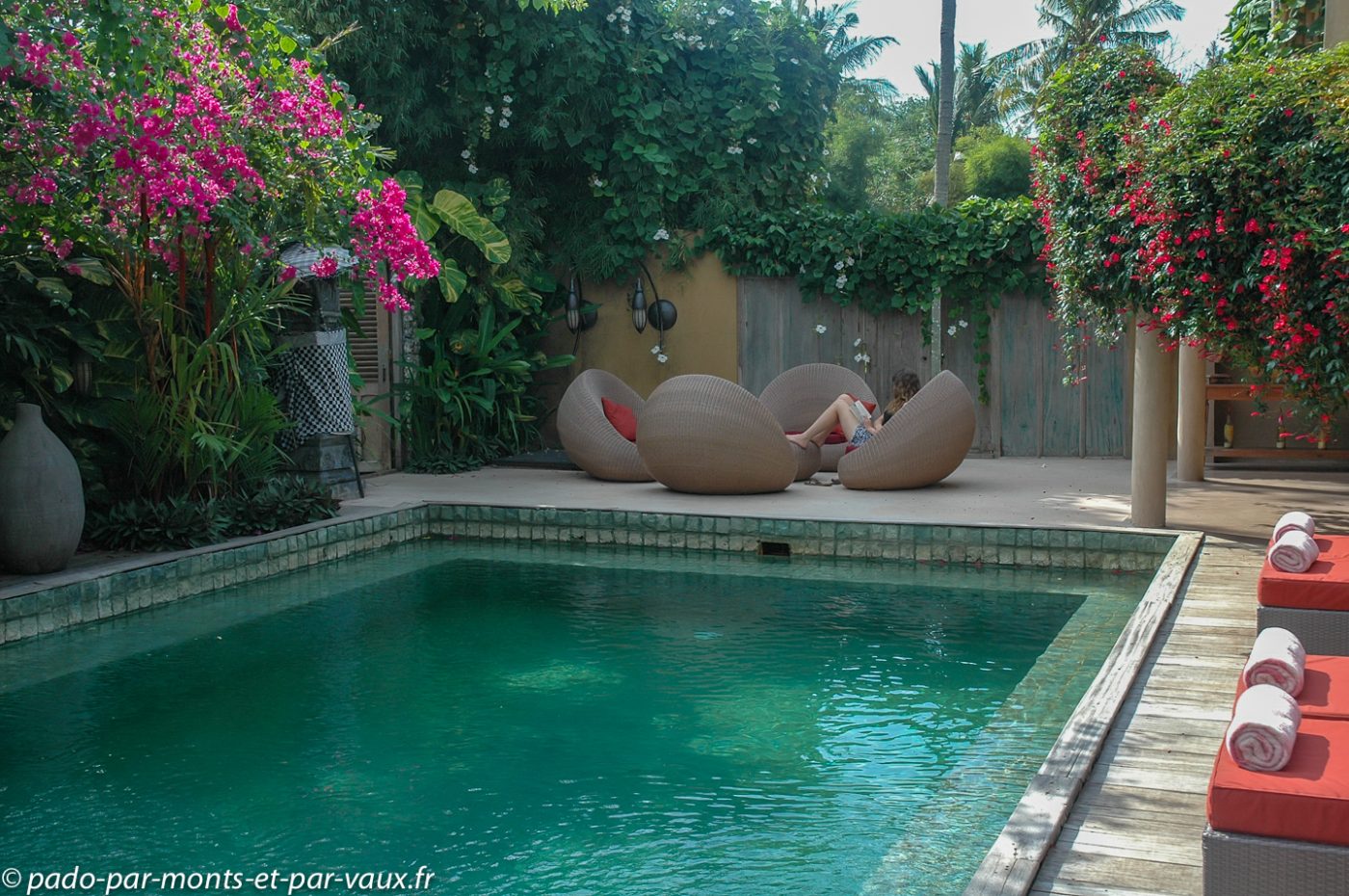 Un peu de grasse matinée pour les enfants ce matin. La grasse matinée est cependant toute relative car nous allons petit déjeuner vers 8h30. Excellents jus de mangue et de banane frais et petit déjeuner très sympa avec une table dans le jardin.