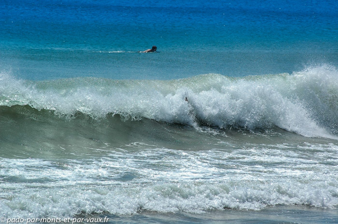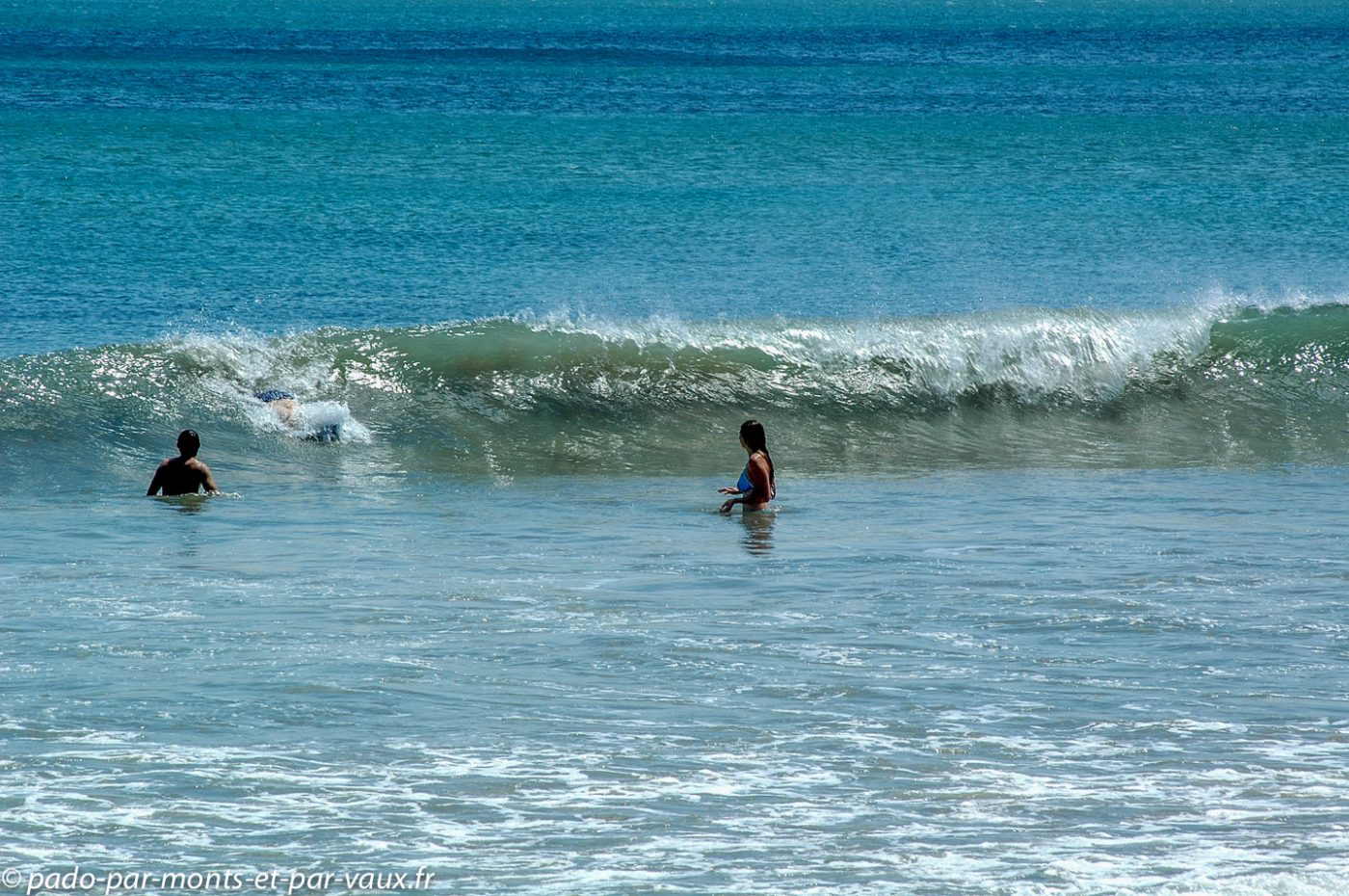 A 11 heures, le chauffeur de l’hôtel nous emmène à la plage dans une décapotable bleu acier sans âge. La marée est montante, les vagues sont magnifiques, même trop grosses pour moi qui reste près du bord alors que les enfants et Patrice plongent dans les rouleaux.