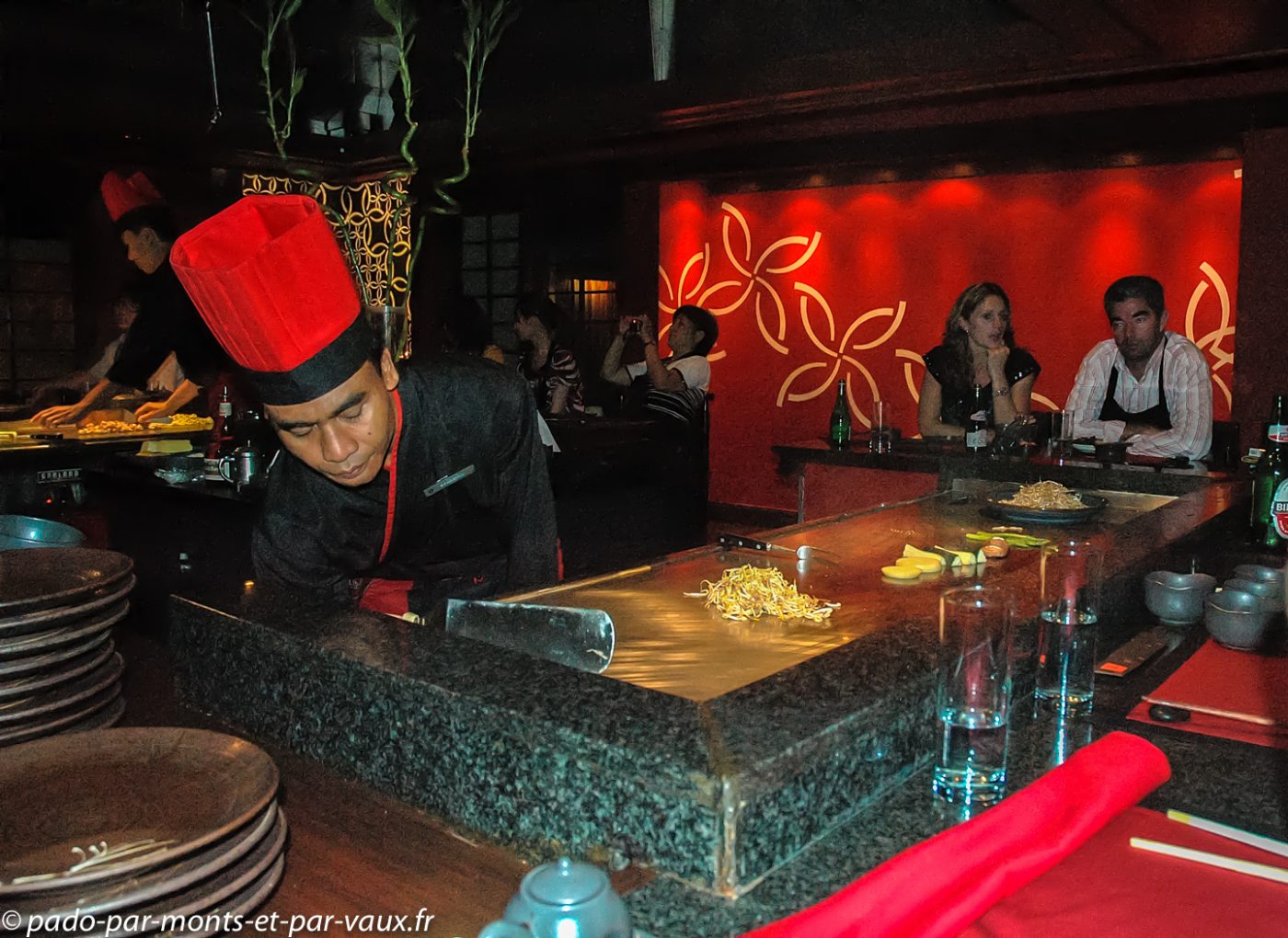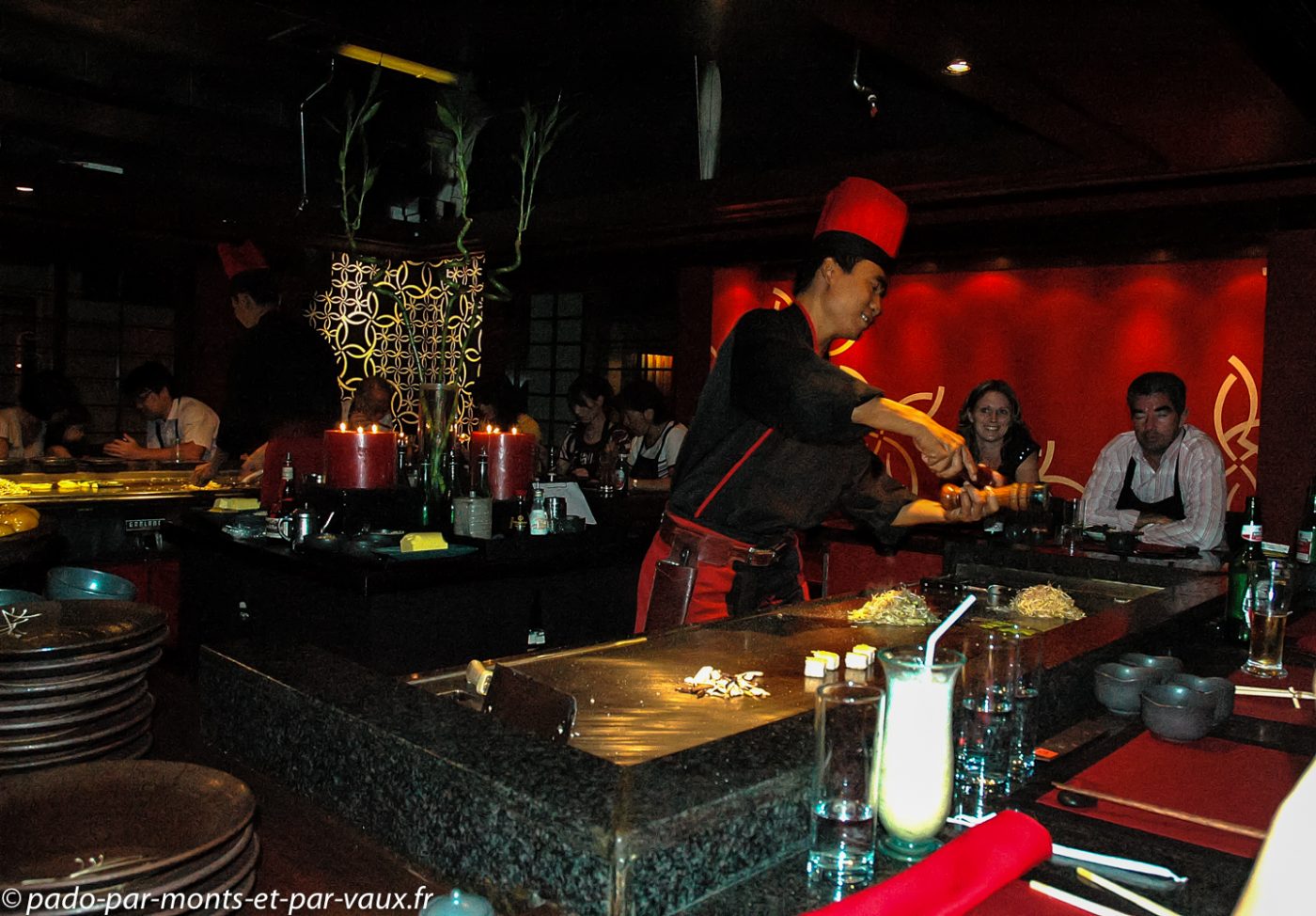 A 20 heures nous nous retrouvons installés sur de grands tabourets autour d’une table carrée au centre de laquelle officient deux cuisiniers. Nous prenons un menu avec tofu, champignons, sashimi succulent au thon, légumes sautés au soja, saumon, langoustes et coquilles Saint Jacques, riz et soupe miso. Nous avons donc tout le loisir d’admirer la dextérité des cuisiniers qui préparent les plats devant nous sur la plaque chauffante. C’est un vrai spectacle et un vrai régal pour les papilles. En dessert très bonne glace aux haricots rouges. Le prix est identique à celui de notre japonais marseillais (mais nous avons gouté à beaucoup plus de plats). Excellente soirée. Retour à notre hôtel (juste en face, il n’y a que la route à traverser). Hélène et Patrice ont viré au rouge +++ et la biafine s’impose avant de se coucher.