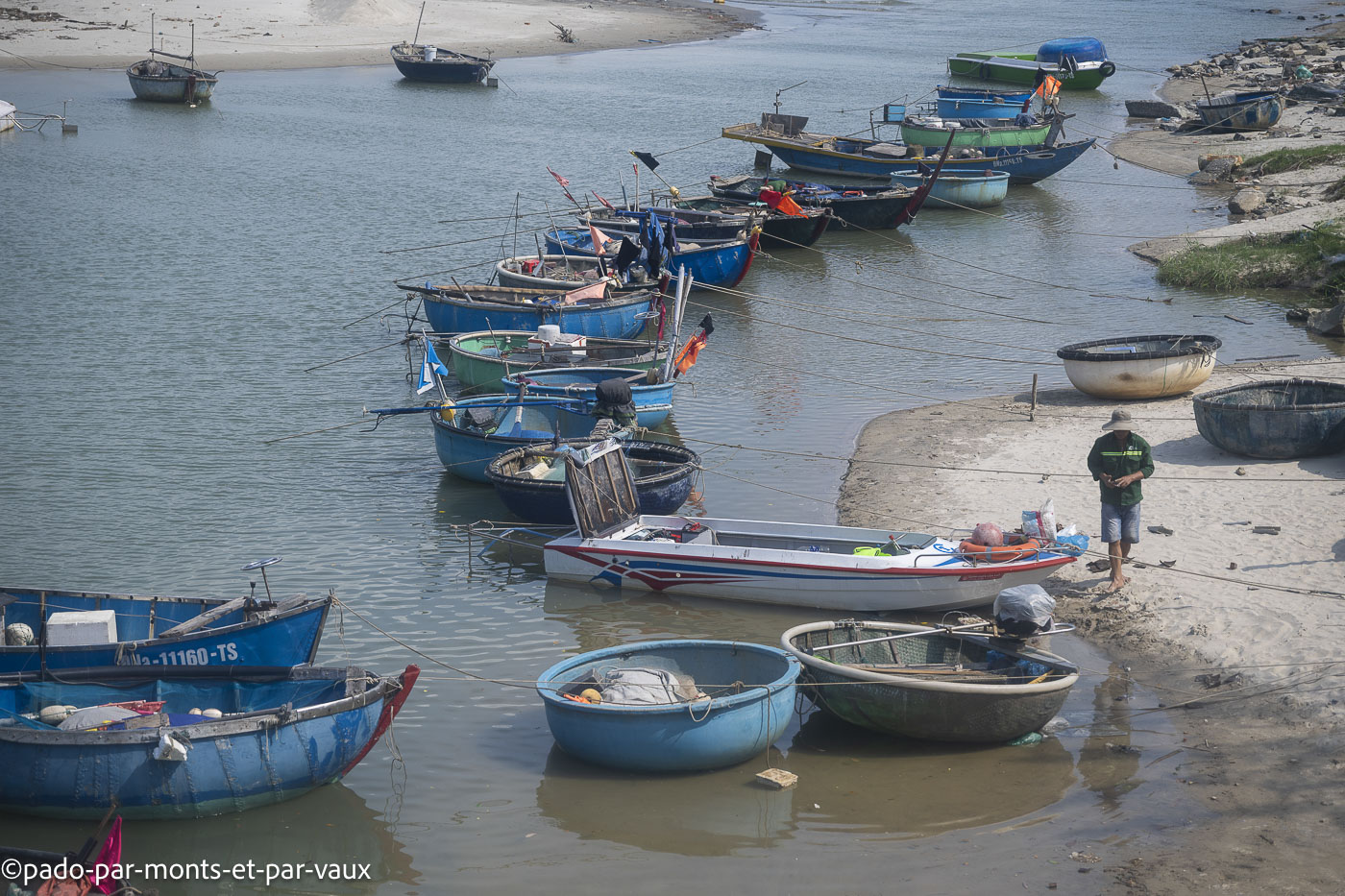 Nous allons jusqu’à la tombe d’un marchand japonais, seule au milieu d’une rizière, puis jusqu’à Tra Que, un village de maraîchers et nous poursuivons jusqu’au bord de mer. De curieux bateaux-panier attendent sagement sur la plage.