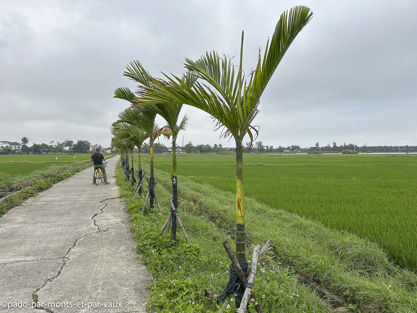Après un petit déjeuner matinal, nous empruntons des vélos mis à disposition par l’hôtel et nous partons faire un tour en dehors de la ville. C’est un peu sportif de faire du vélo ici. Il faut zigzaguer entre les piétons, les motos, les pousse-pousse, sans se faire renverser par une voiture ou une camionnette. Une fois sortis de la ville, il y a bien une piste cyclable, mais voitures et mobylettes s’en servent de parking ! En revanche le vélo est très agréable dans les petits chemins qui traversent les rizières.