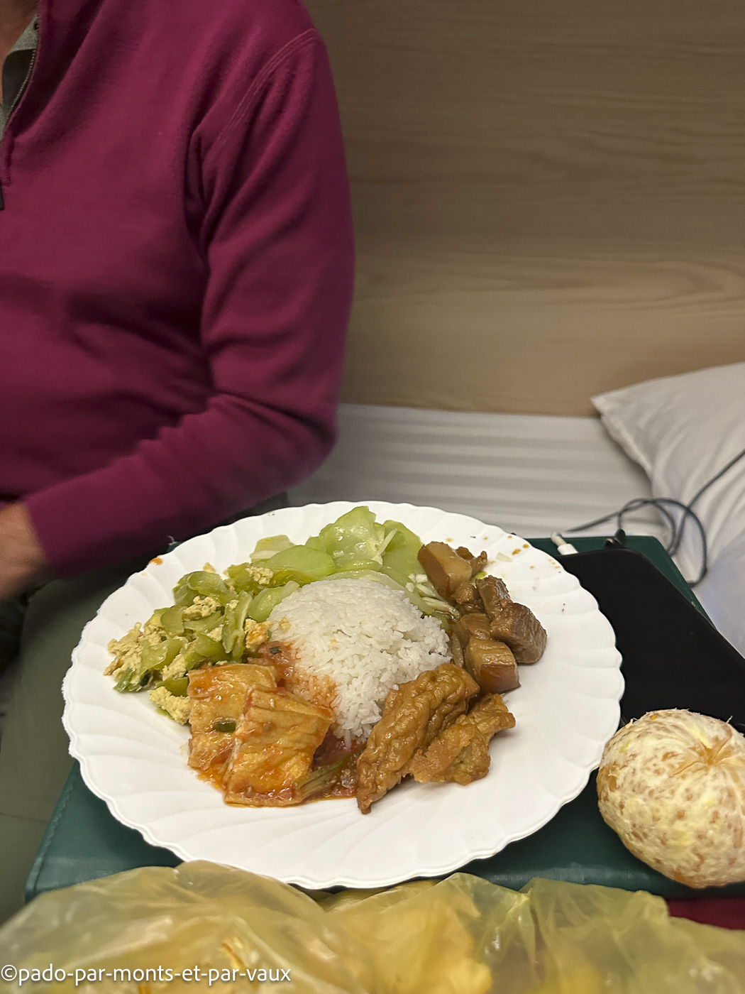 Ensuite il se met à pleuvoir et la nuit tombe assez vite. Nous mangeons nos provisions et Patrice prend même une assiette servie par un gars qui pousse un chariot dans le train. Le rata est aussi apetissant que ce que l’on sert dans les films aux prisonniers et je ne regrette pas de m’être abstenue !