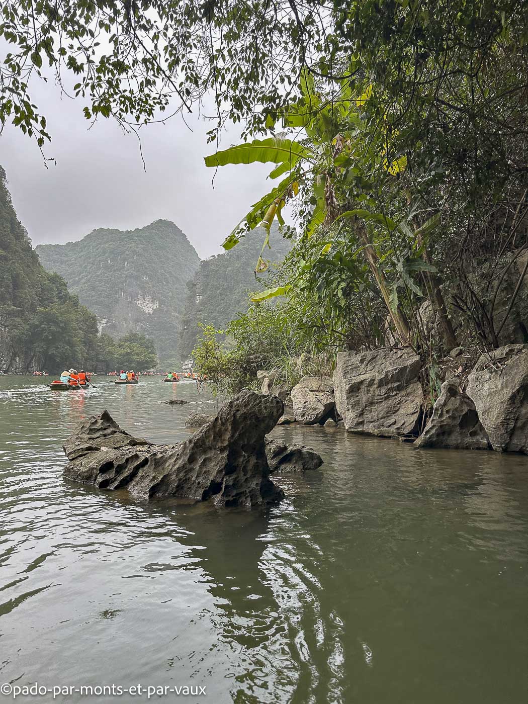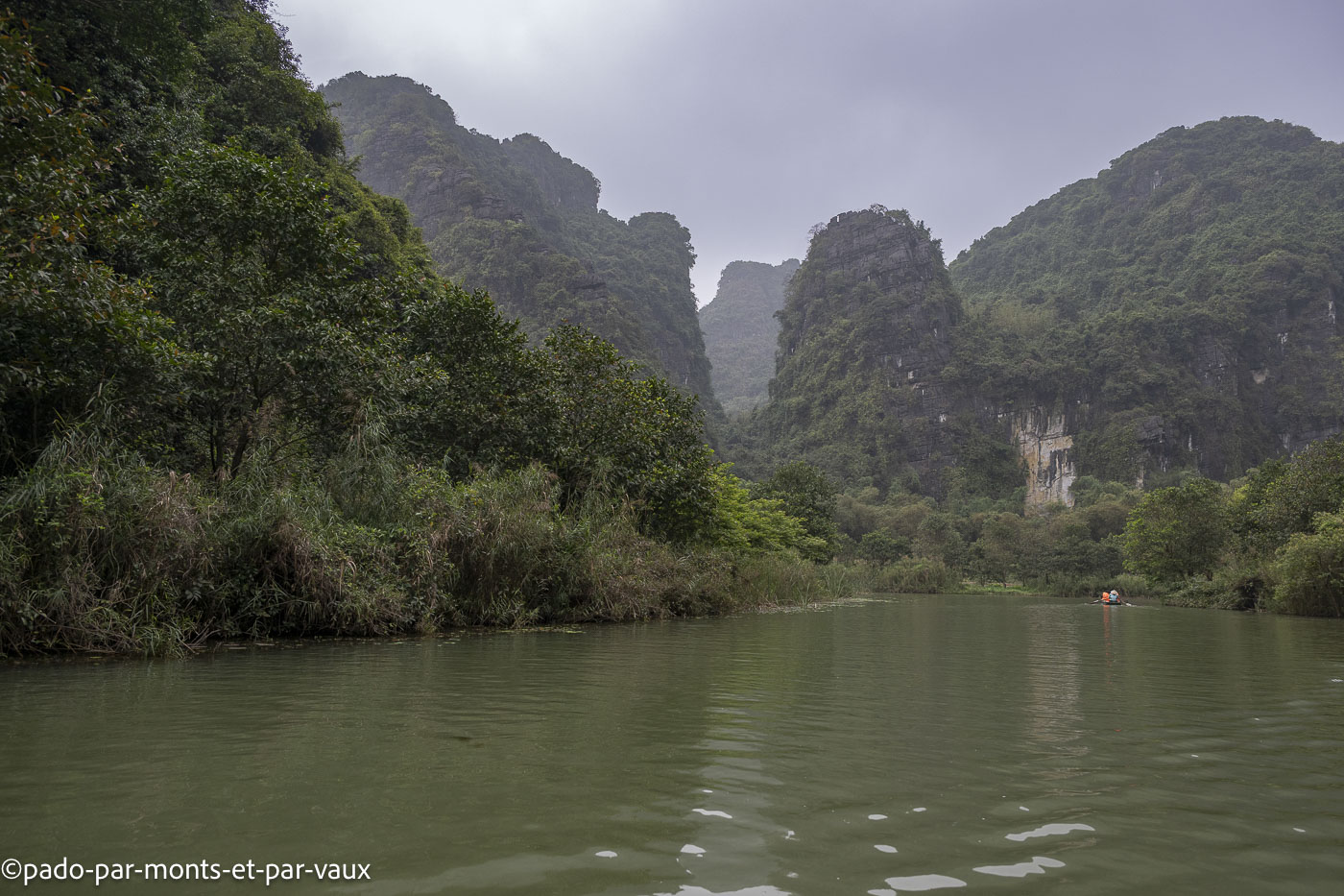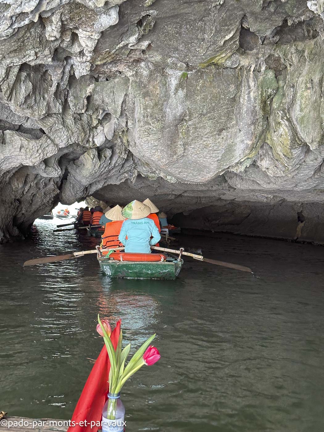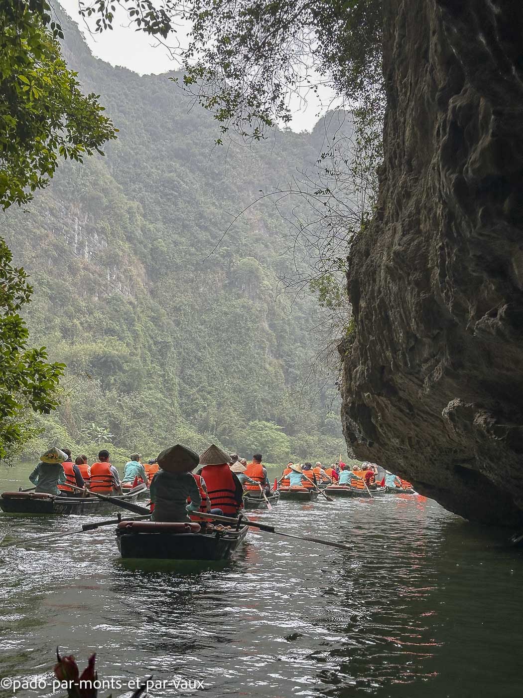 Des dizaines de barques font le même circuit, passent dans les grottes et aux pieds des pitons couverts de végétation. Avec l’affluence et le bruit, c’est un peu une ambiance Disneyland peu propice à la contemplation mais tous ces inconvénients n’enlèvent rien à la beauté du site. Un rayon de soleil aurait été le bienvenu mais nous avons un ciel bas et gris, comme depuis notre arrivée à Hanoi. Nombreuses grèbes castagneux dont les cris résonnent au milieu des pitons rocheux.
