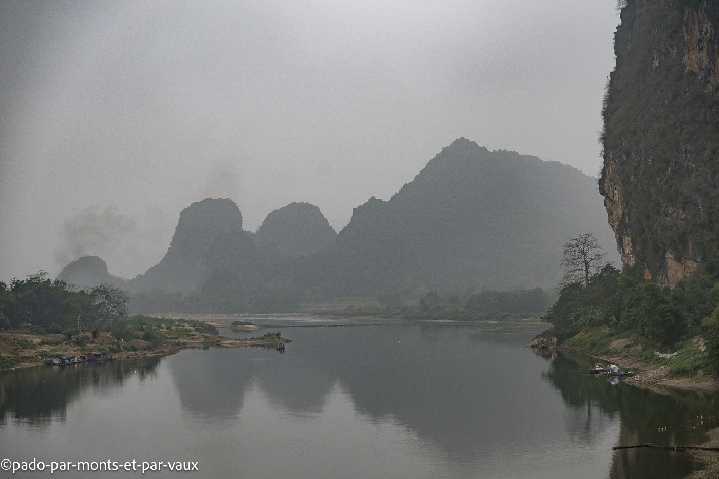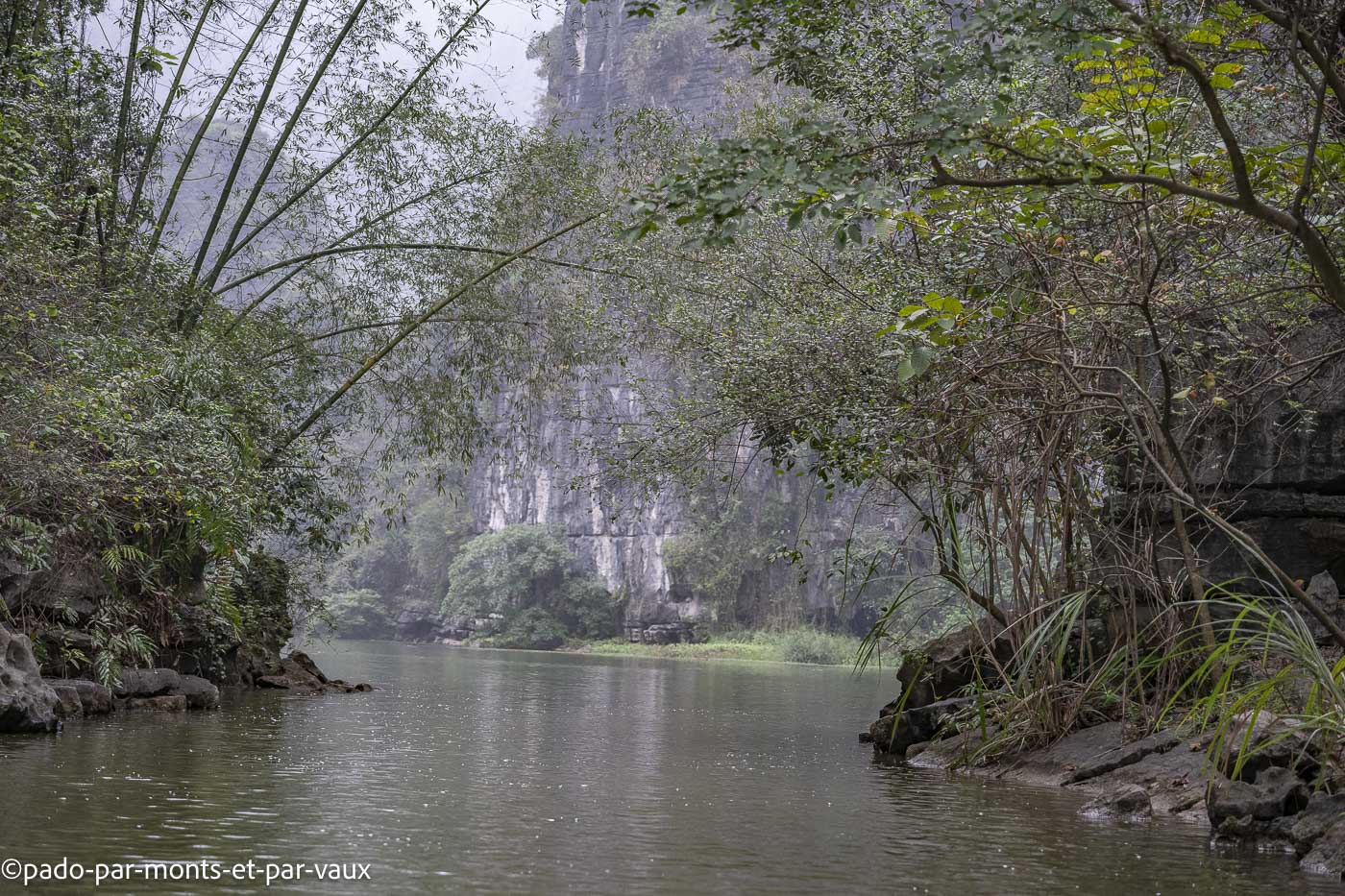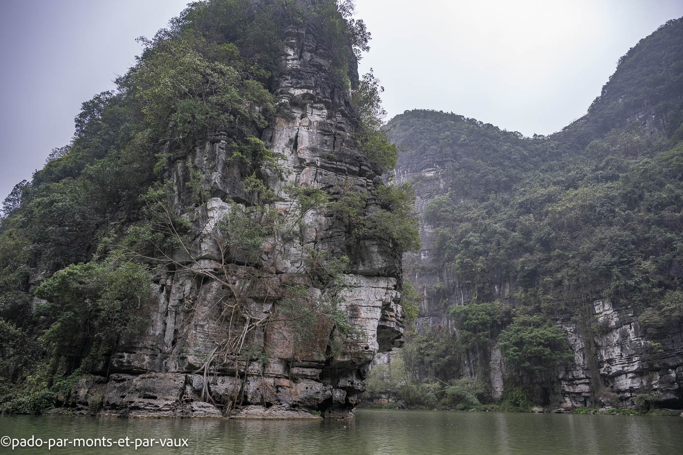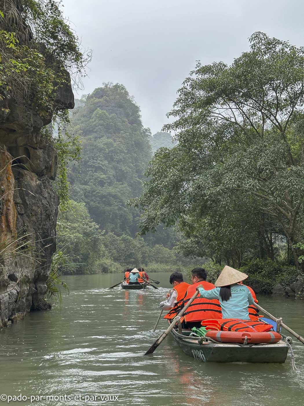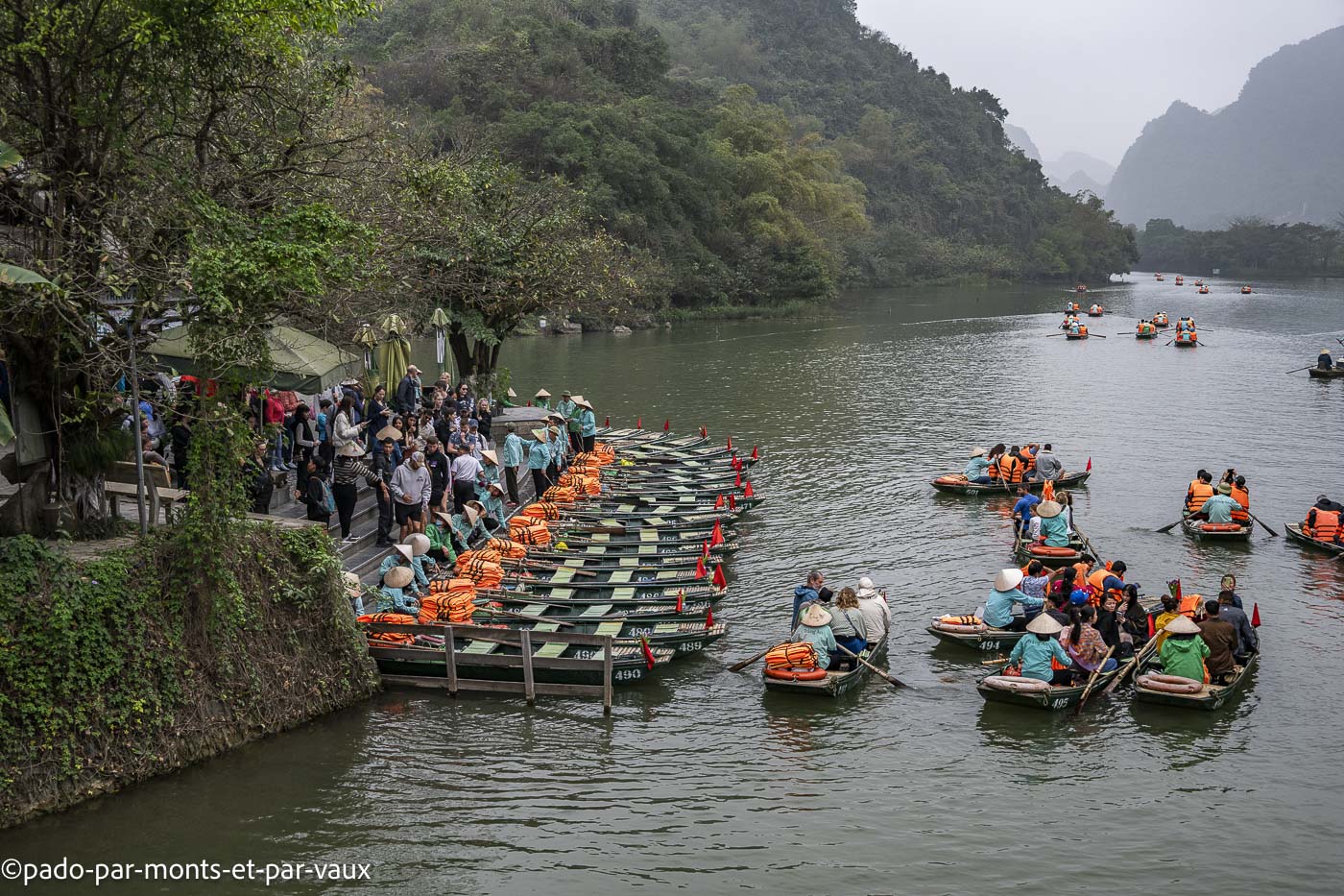 Des dizaines de barques font le même circuit, passent dans les grottes et aux pieds des pitons couverts de végétation. Avec l’affluence et le bruit, c’est un peu une ambiance Disneyland peu propice à la contemplation mais tous ces inconvénients n’enlèvent rien à la beauté du site. Un rayon de soleil aurait été le bienvenu mais nous avons un ciel bas et gris, comme depuis notre arrivée à Hanoi. Nombreuses grèbes castagneux dont les cris résonnent au milieu des pitons rocheux.
